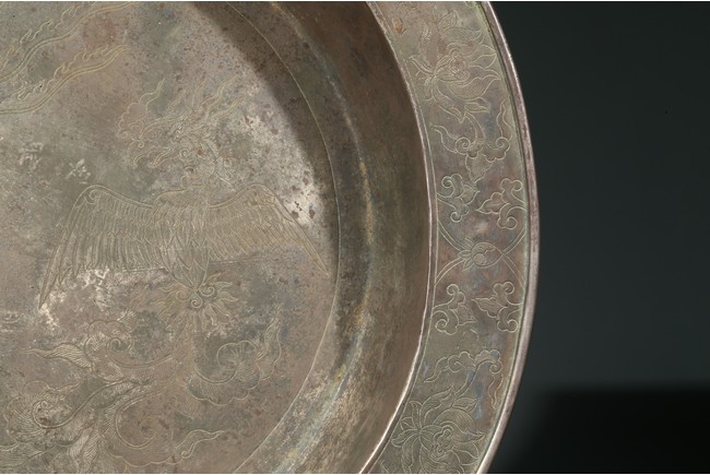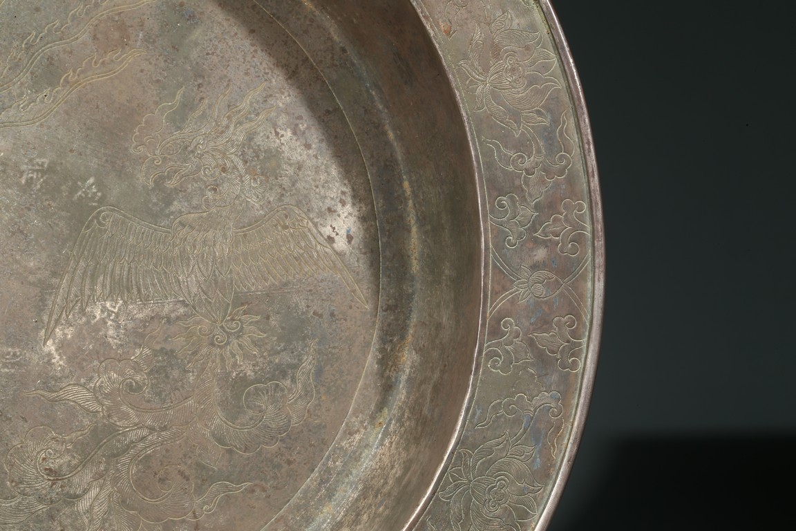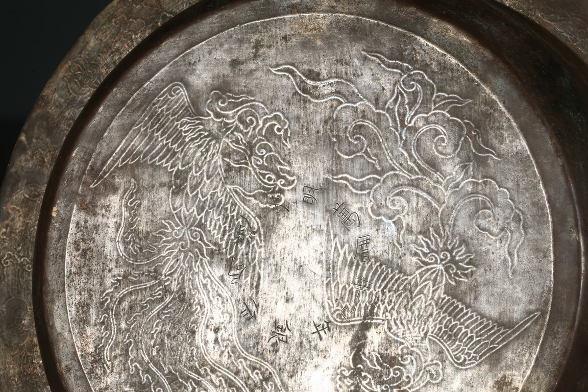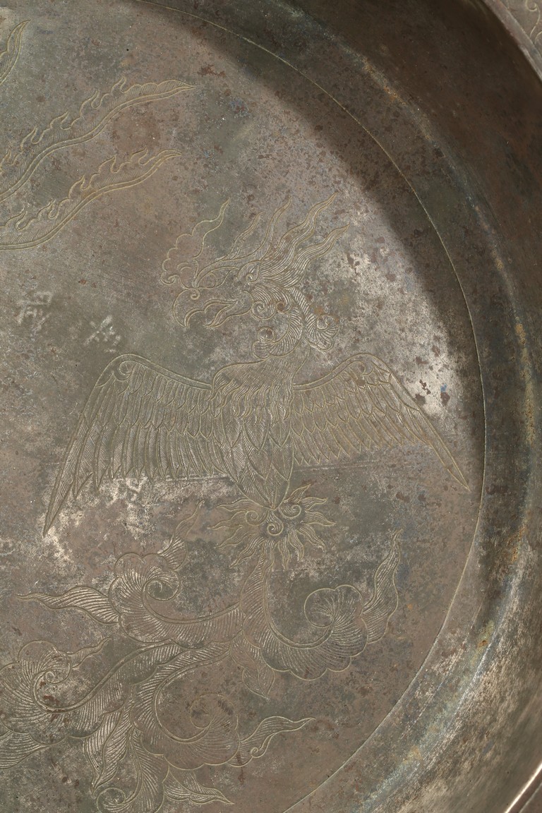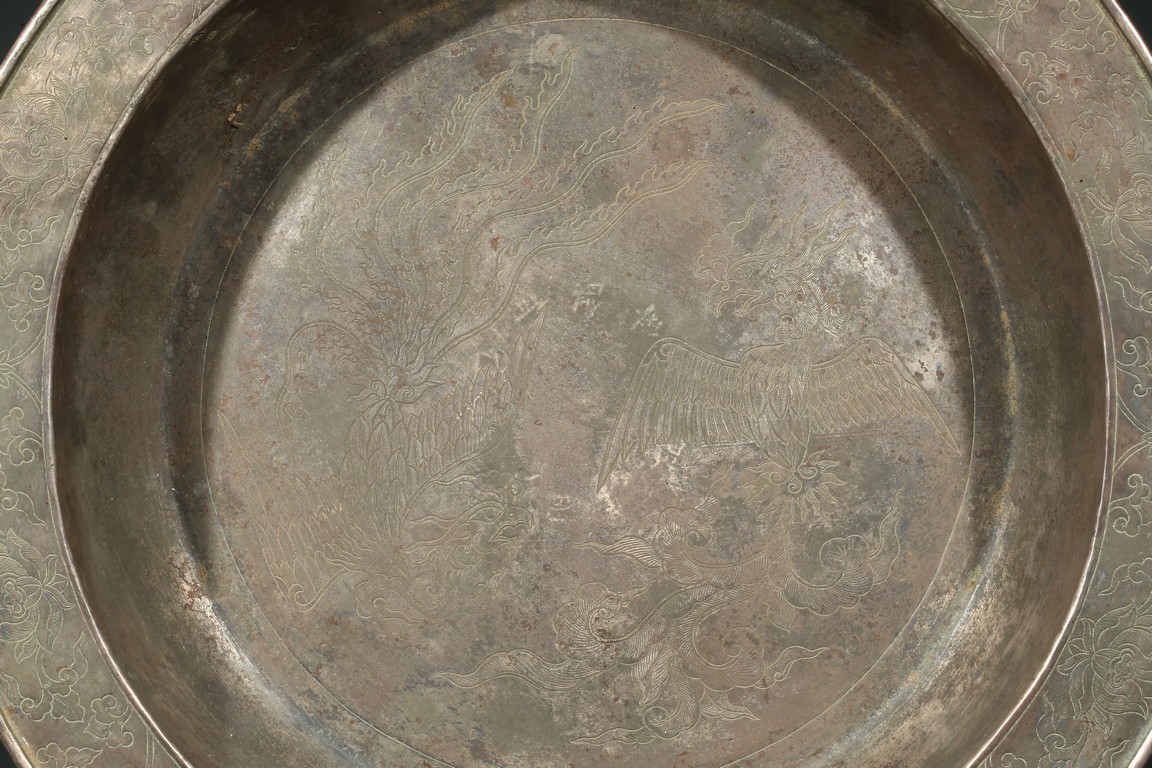 The basin interior incised with a pair of flying phoenix, the everted rim further incised with scroll clouds, base with apocryphal Wanli mark.