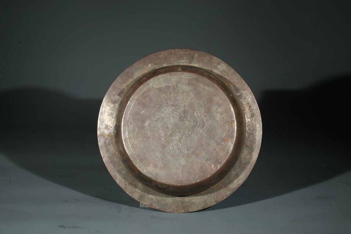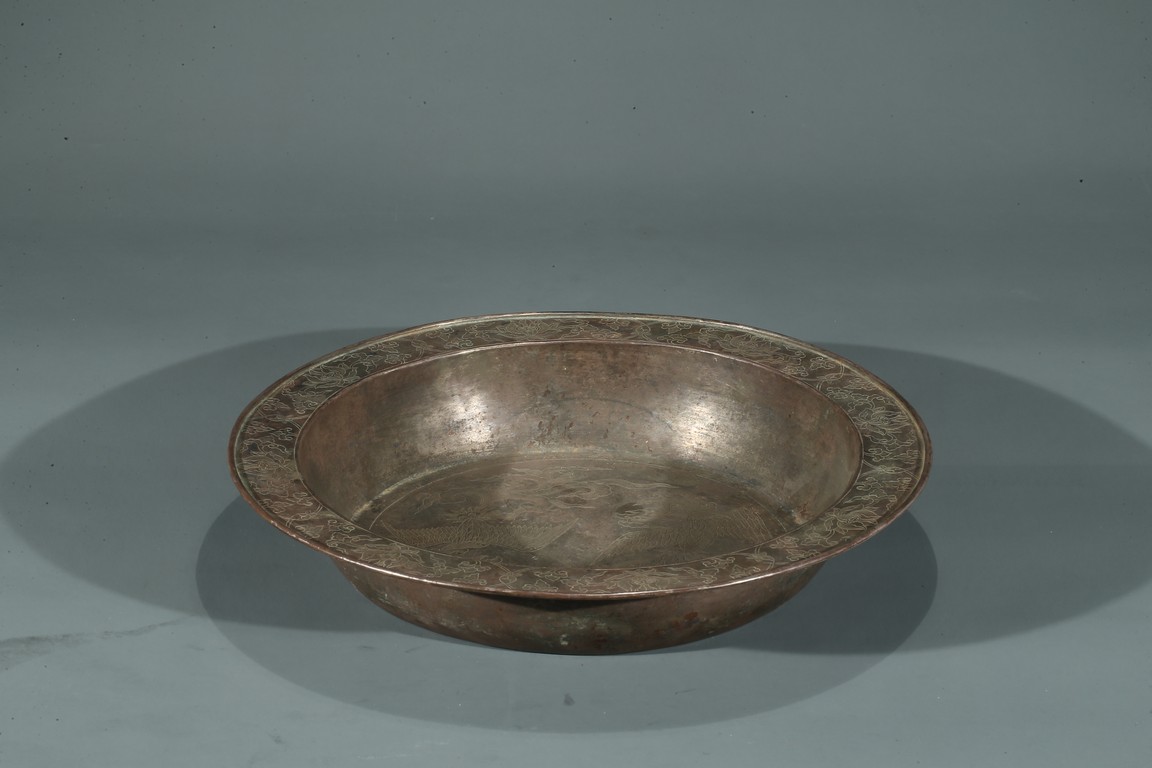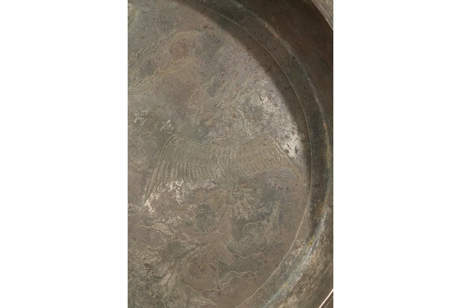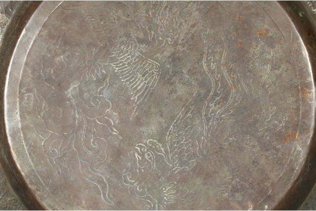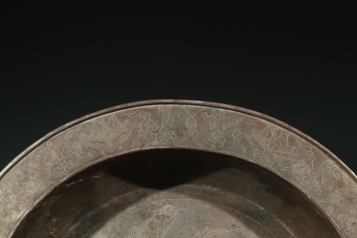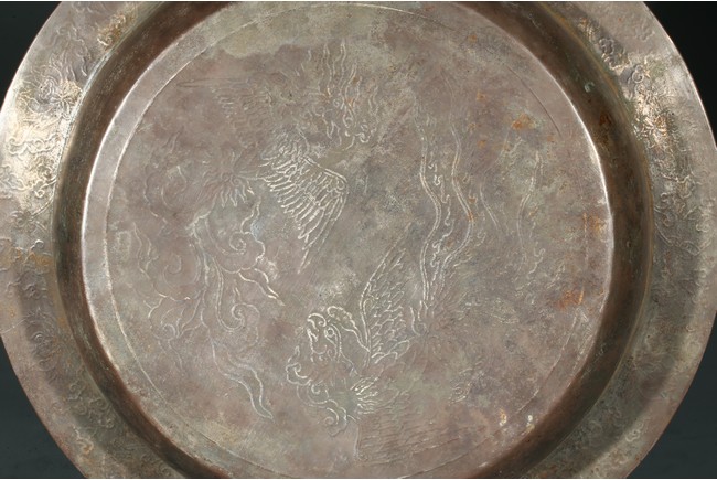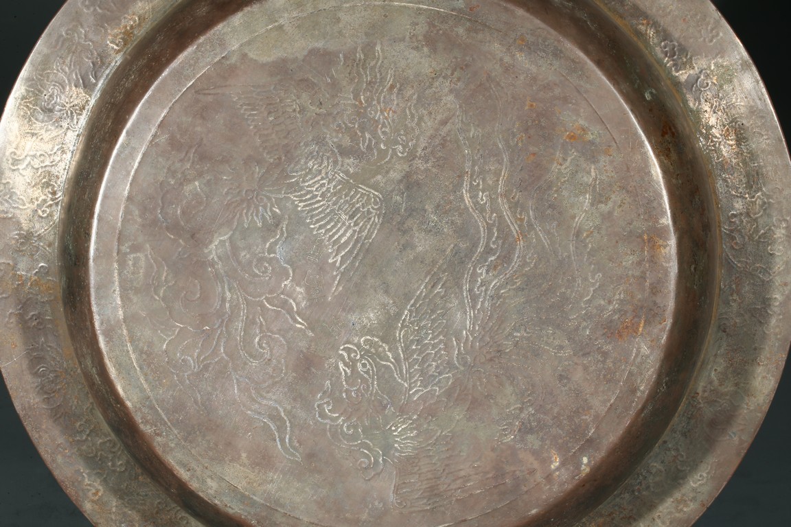 The basin interior incised with a pair of flying phoenix, the everted rim further incised with scroll clouds, base with apocryphal Wanli mark.