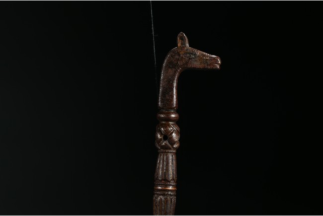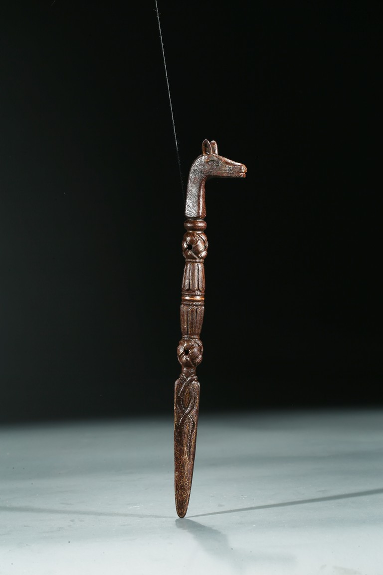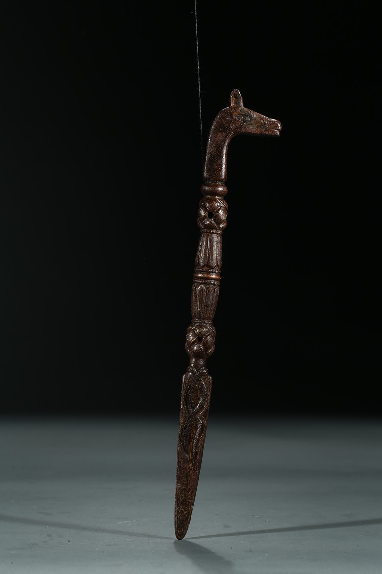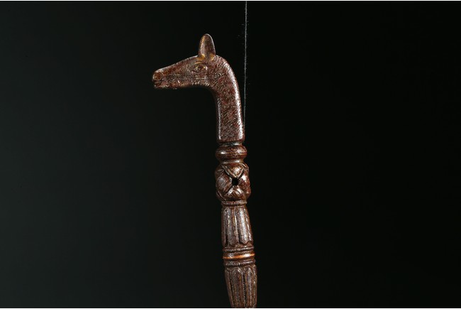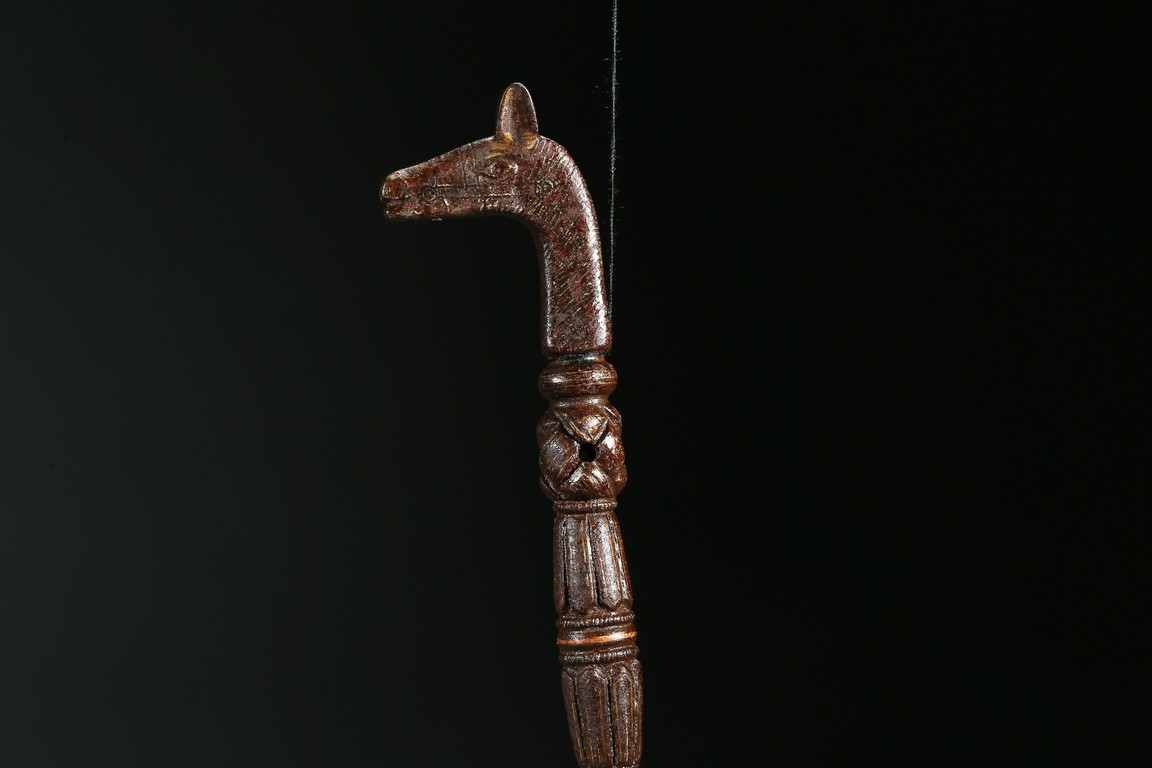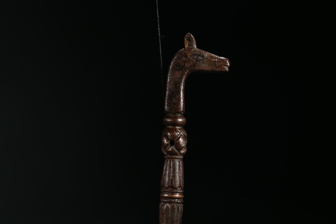 The scepter cast with a horse or deer head on one end, the hilt secured to dagger, with silver wire inlays.