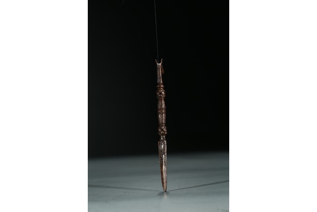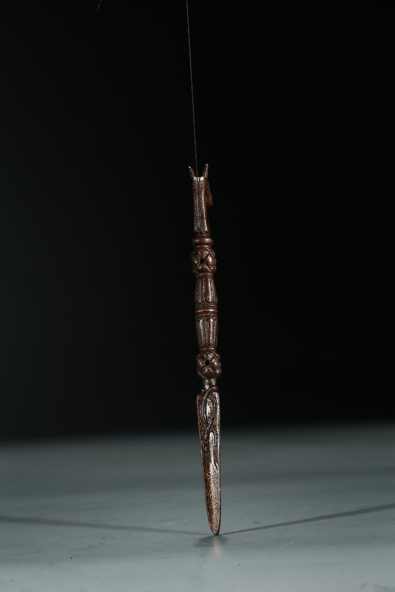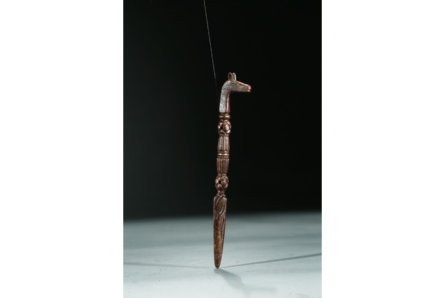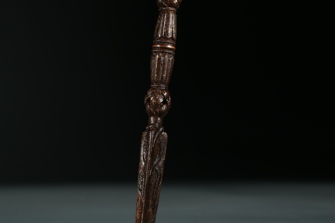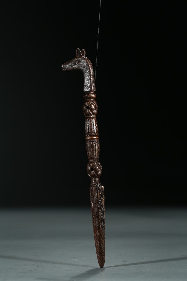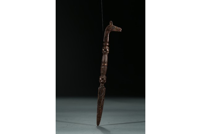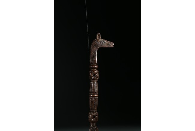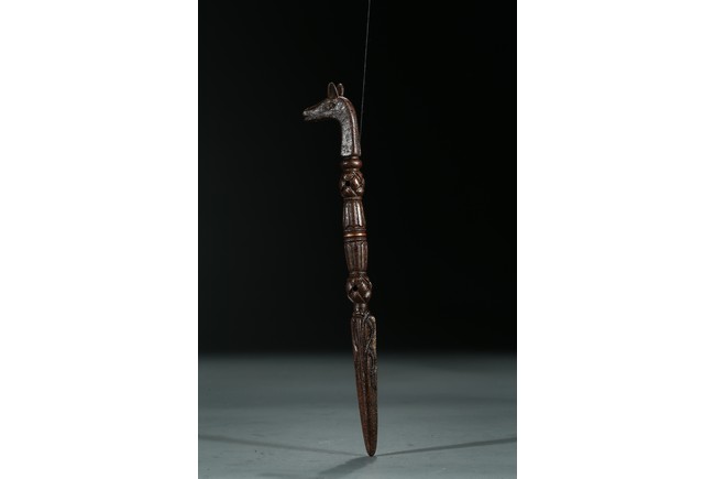 The scepter cast with a horse or deer head on one end, the hilt secured to dagger, with silver wire inlays.
