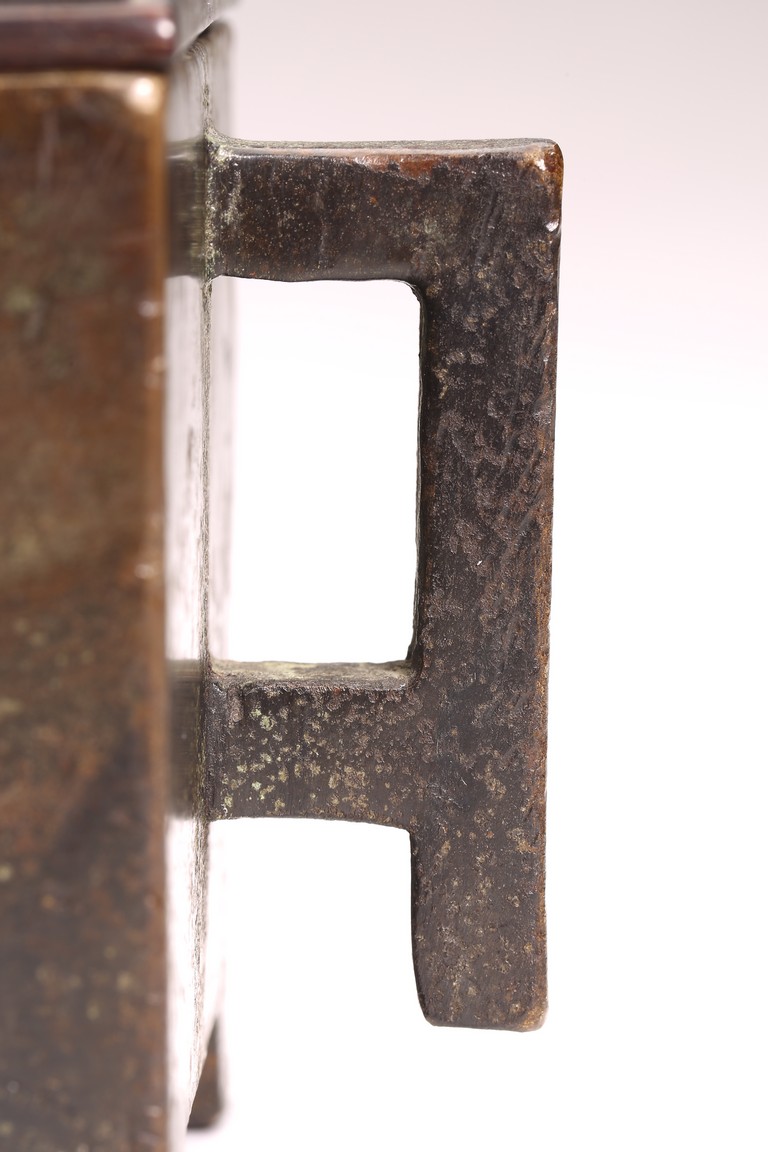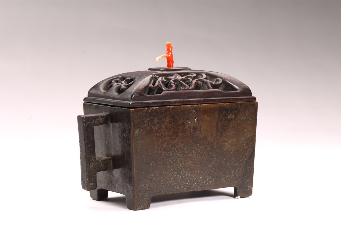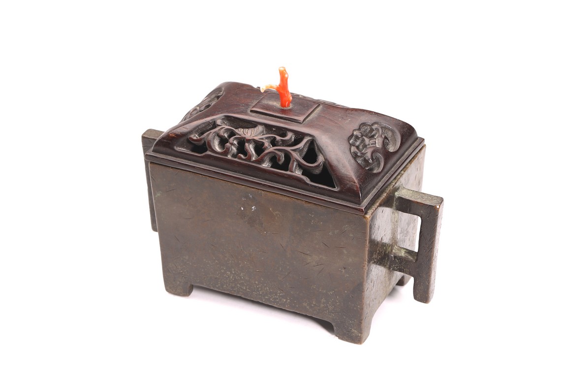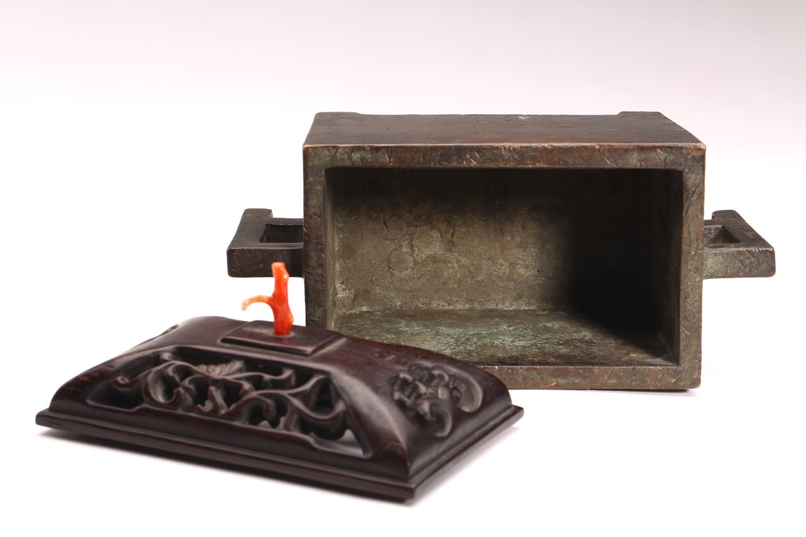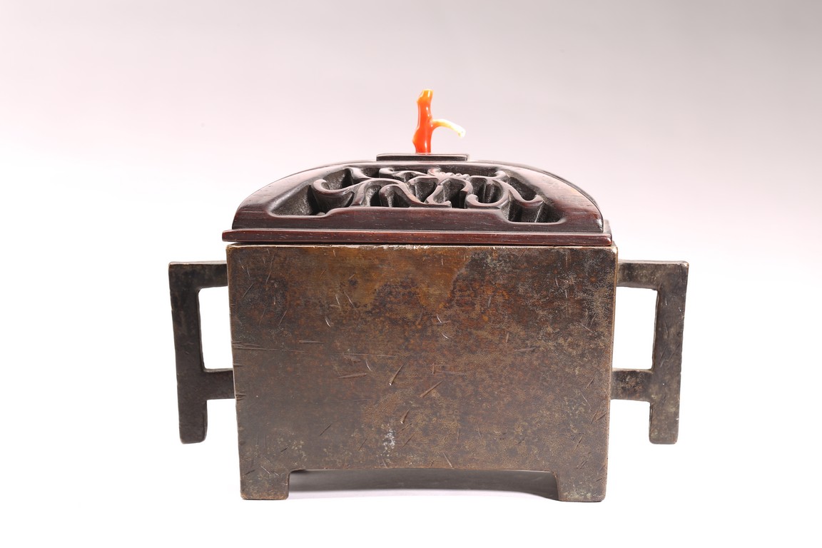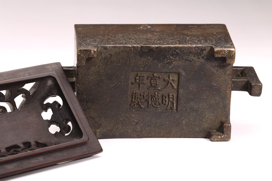 The censer is cast raised on four bracket feet and decorated with two angular handles. The base is cast with a six character Xuande mark, fitted with hardwood cover. Qing Dynasty period.