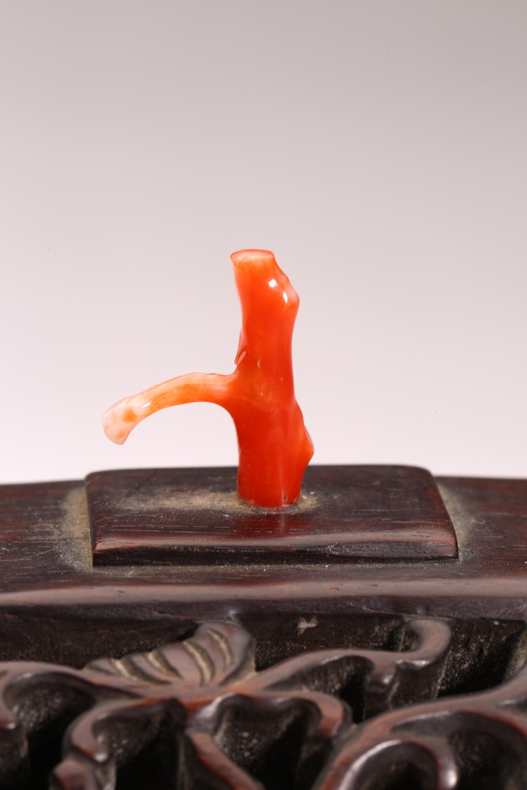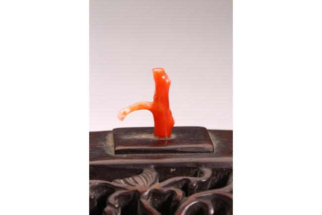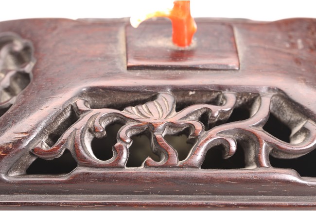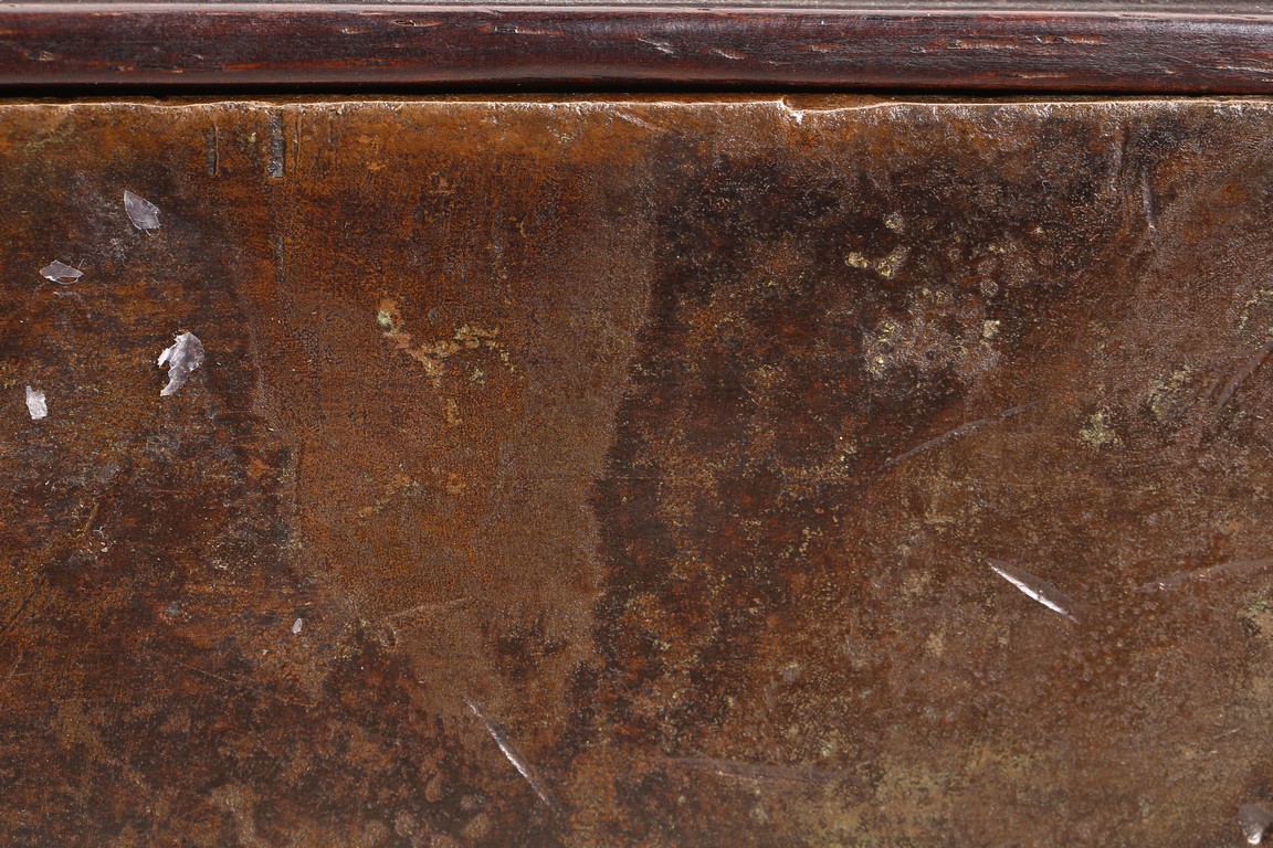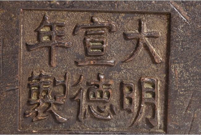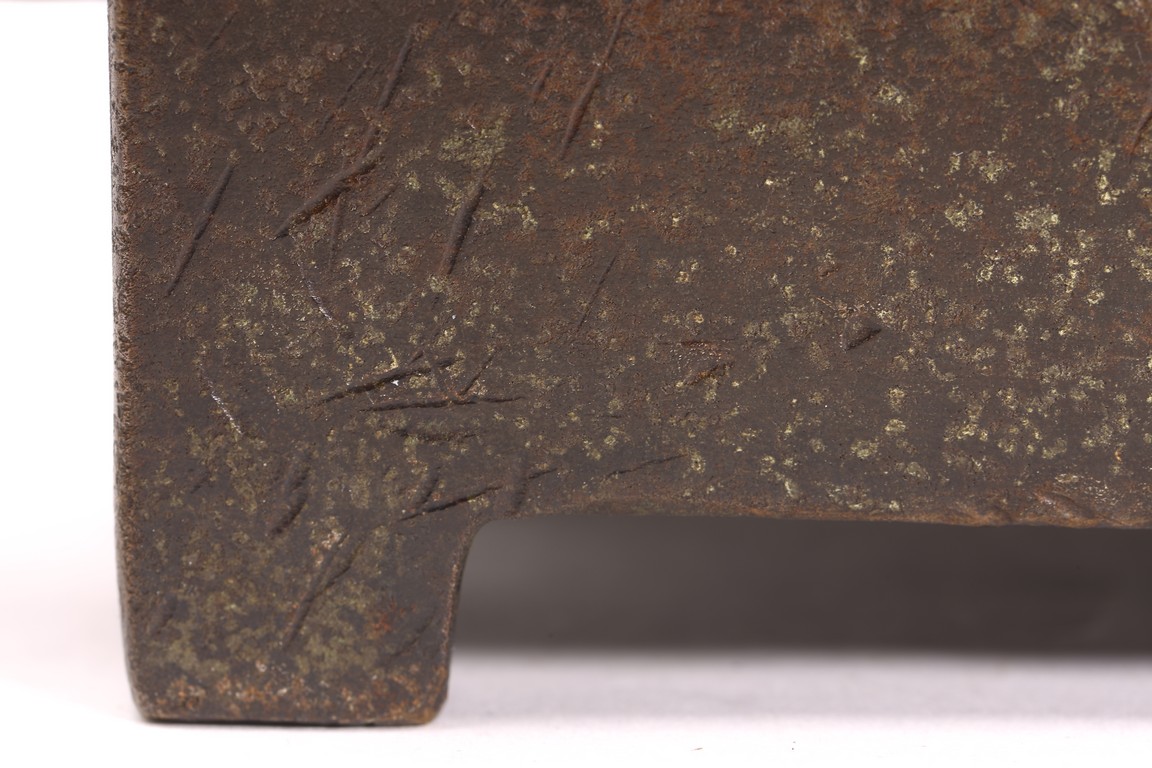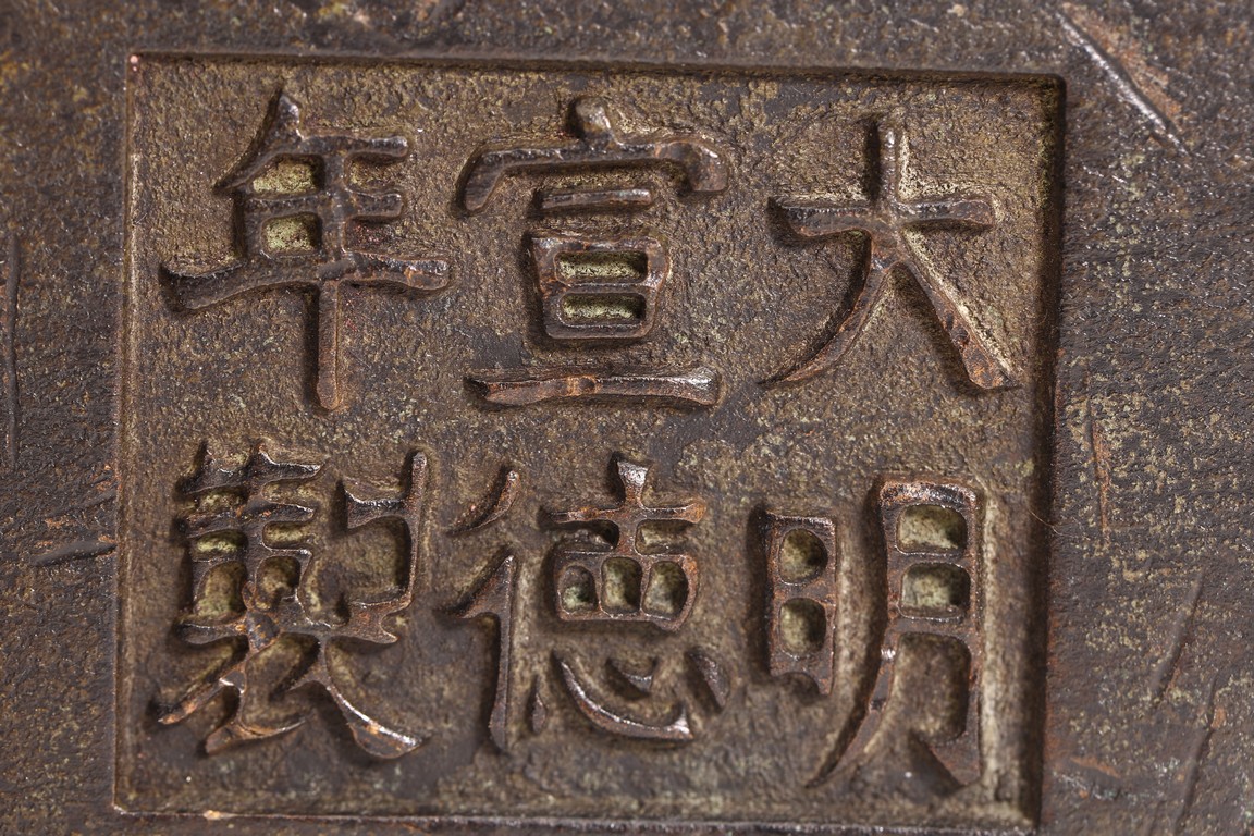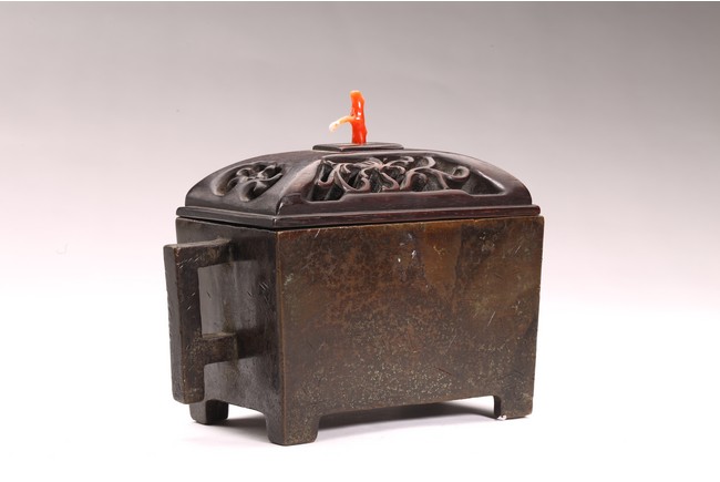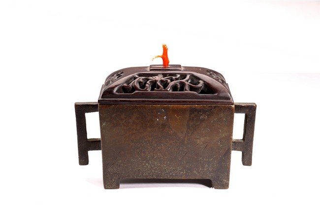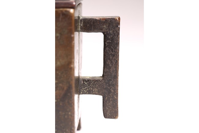 The censer is cast raised on four bracket feet and decorated with two angular handles. The base is cast with a six character Xuande mark, fitted with hardwood cover. Qing Dynasty period.