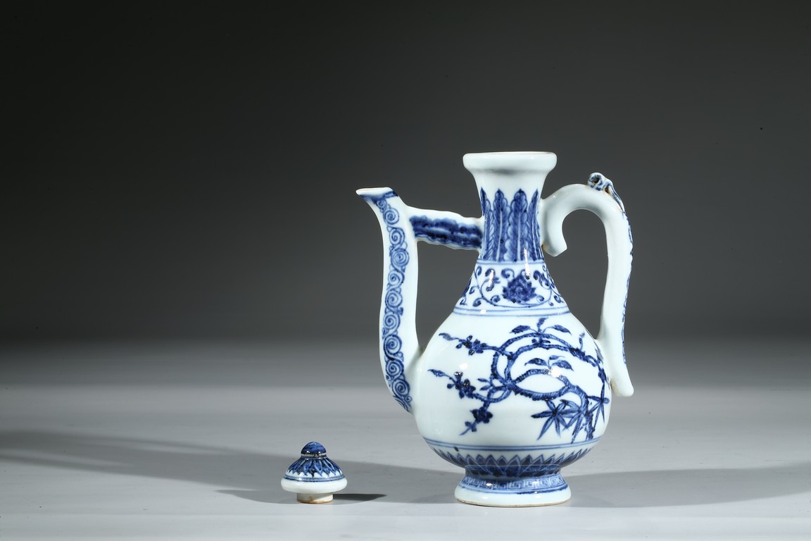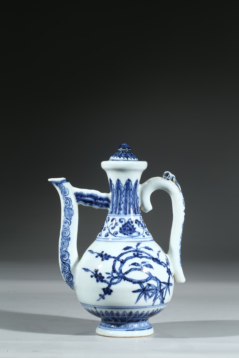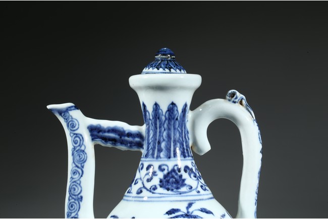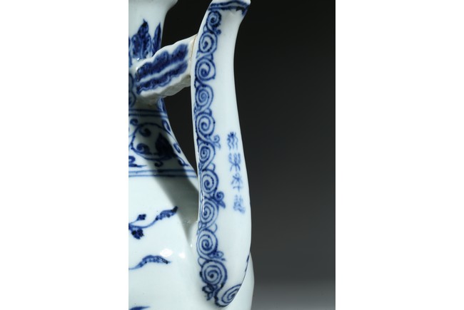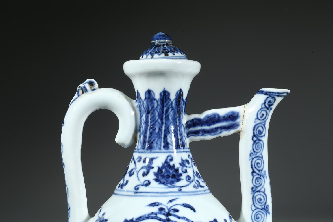 永樂一朝窯事興盛,成就卓越,上承宋元,下啟康乾,創新發明極多,器類式樣之豐富,釉色裝飾之廣泛,為此前所未經見,其中青花一門極負盛名,深得後世推崇。本品為永樂青花執壺之翹楚,以紋飾罕見而著稱。其壺身呈玉壺春瓶式樣,腹一側設長彎流,流與頸之間以雲形板連接美觀實用,設計巧妙。器型線條複雜多變,雍容秀美。通體以青花繪就,層次豐富,佈局得宜,毫無繁縟之感。其青花凝重妍麗,蒼雅雄勁,一如水墨,所繪諸花筆觸細膩,氣韻流暢,盡現永樂御瓷纖巧柔美之風姿。“永樂年製”款識。