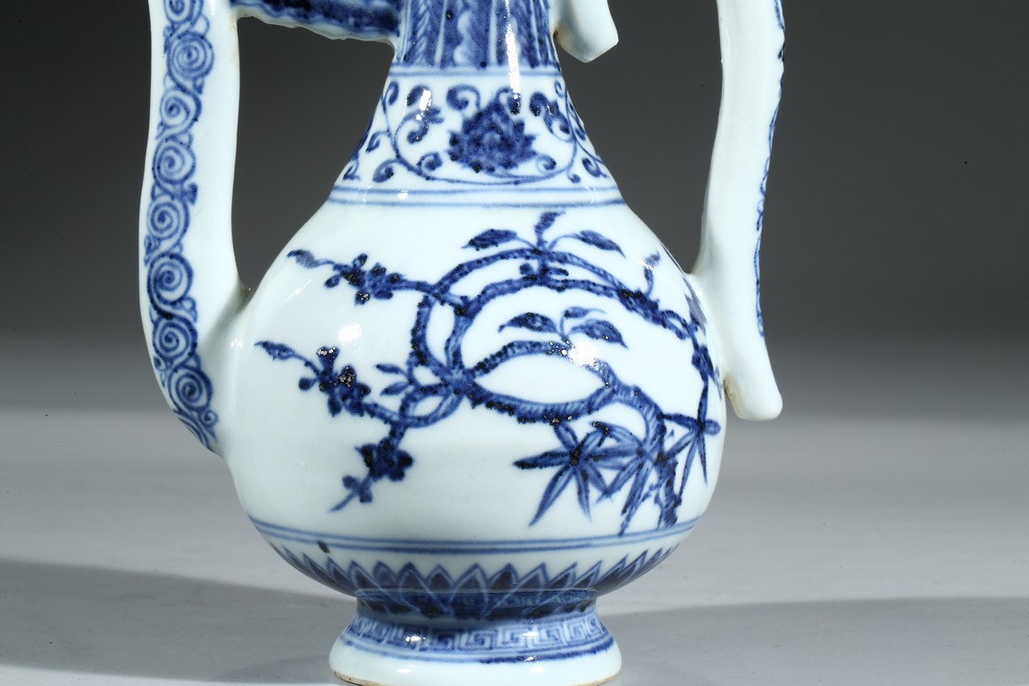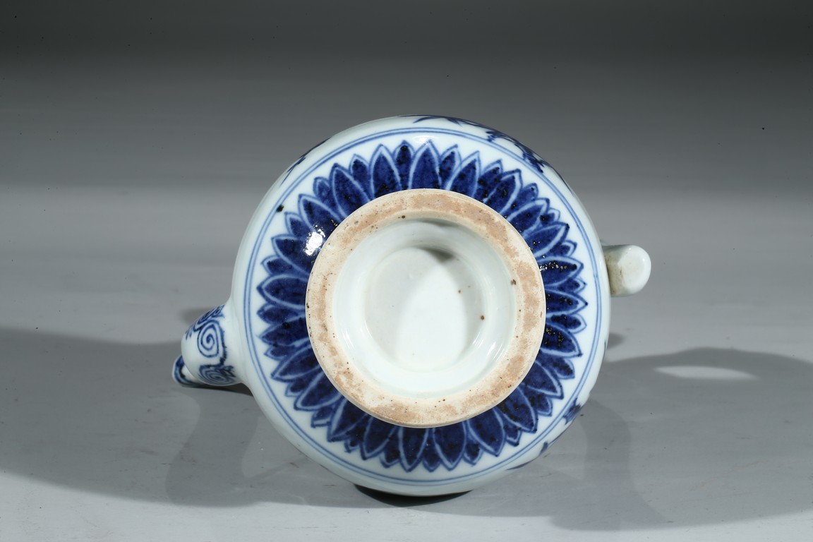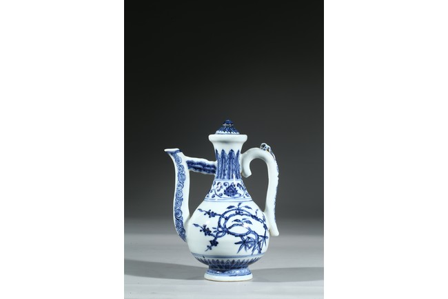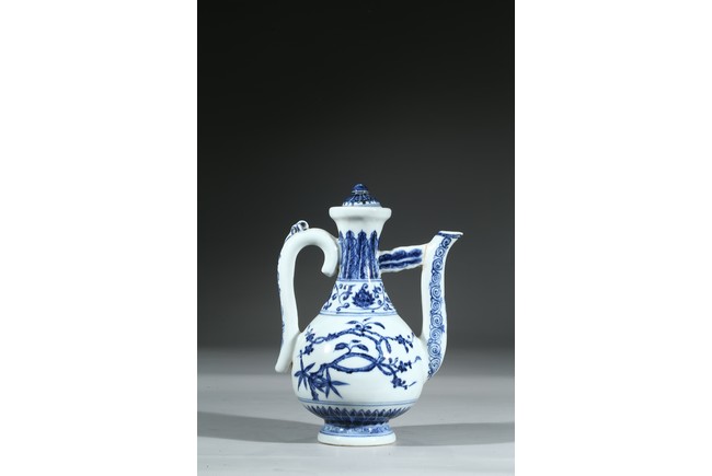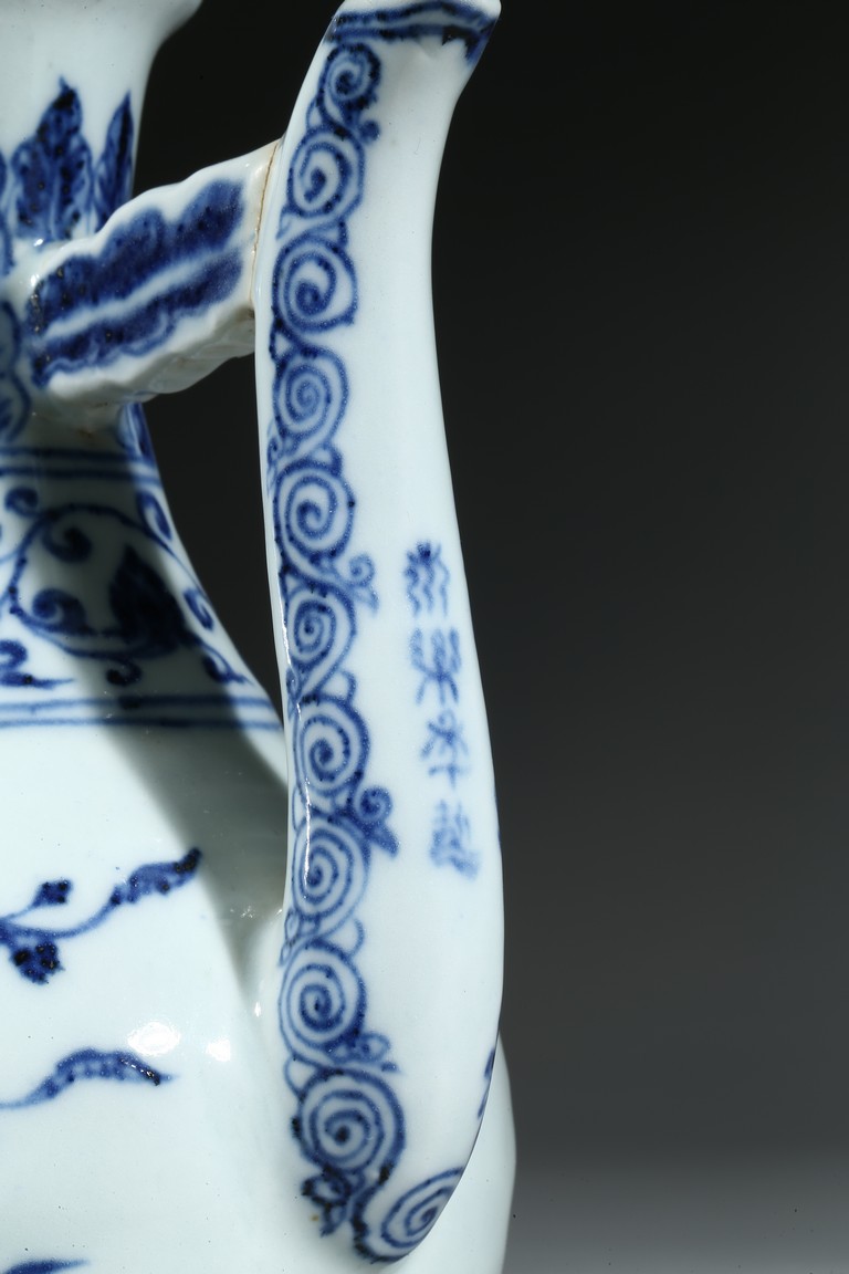 永樂一朝窯事興盛,成就卓越,上承宋元,下啟康乾,創新發明極多,器類式樣之豐富,釉色裝飾之廣泛,為此前所未經見,其中青花一門極負盛名,深得後世推崇。本品為永樂青花執壺之翹楚,以紋飾罕見而著稱。其壺身呈玉壺春瓶式樣,腹一側設長彎流,流與頸之間以雲形板連接美觀實用,設計巧妙。器型線條複雜多變,雍容秀美。通體以青花繪就,層次豐富,佈局得宜,毫無繁縟之感。其青花凝重妍麗,蒼雅雄勁,一如水墨,所繪諸花筆觸細膩,氣韻流暢,盡現永樂御瓷纖巧柔美之風姿。“永樂年製”款識。