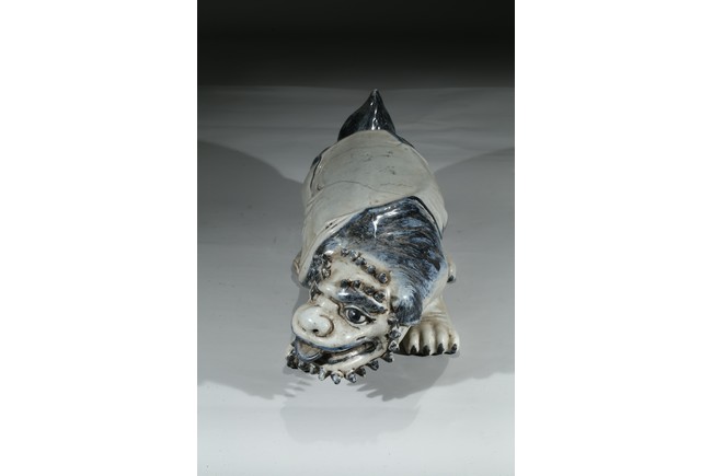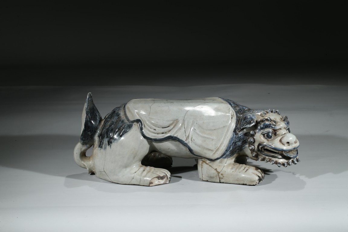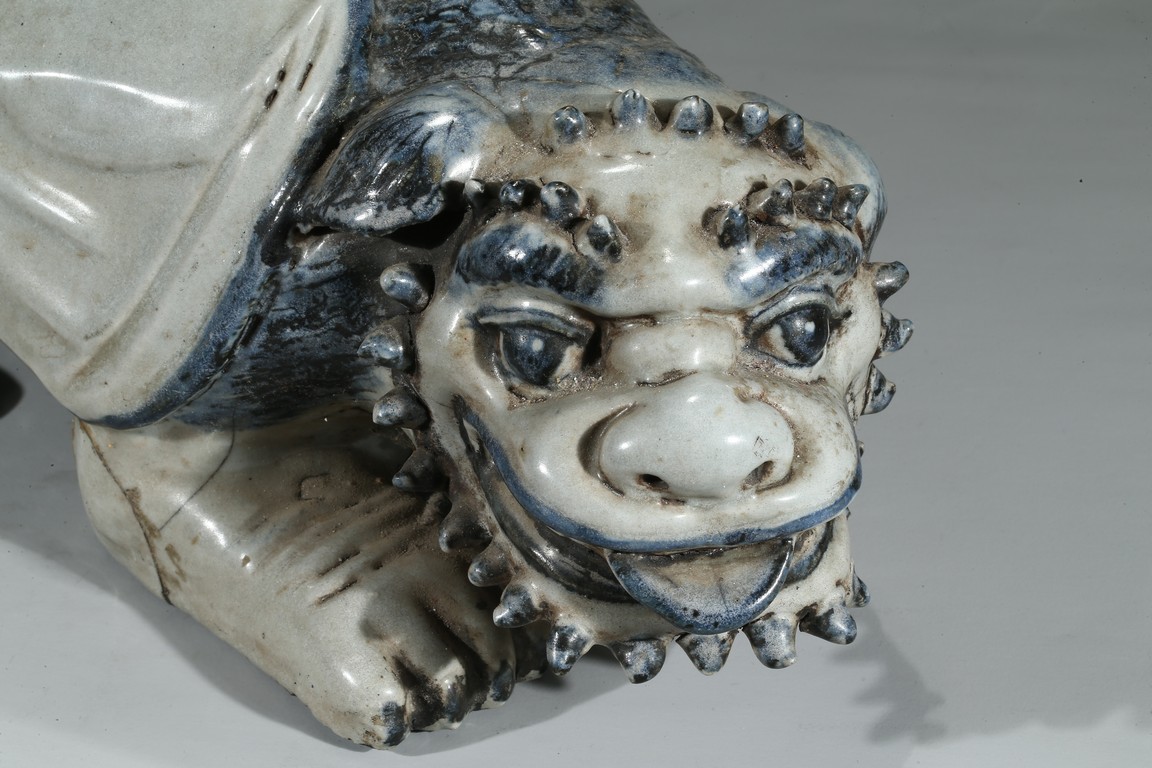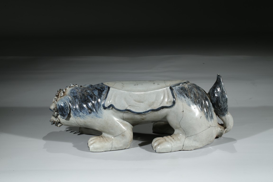 Modelled standing foursquare, the large head with bulging eyes and large snout, tails and mane in underglaze blue.