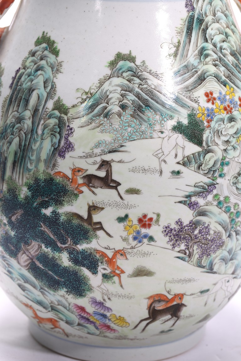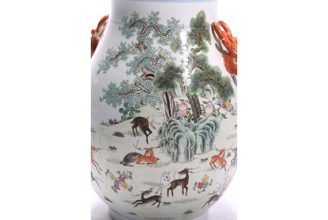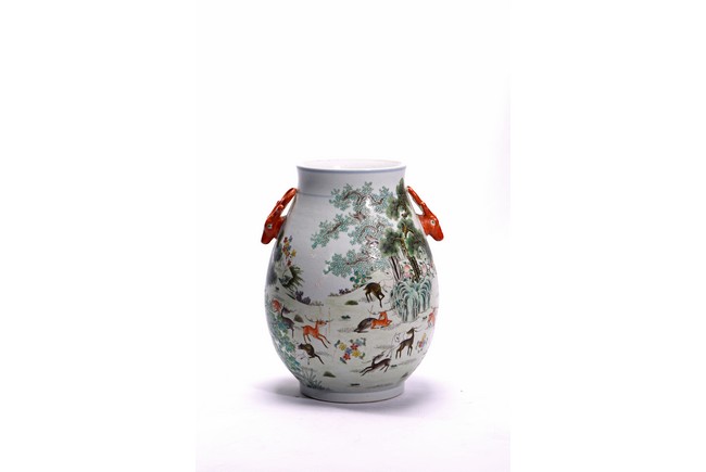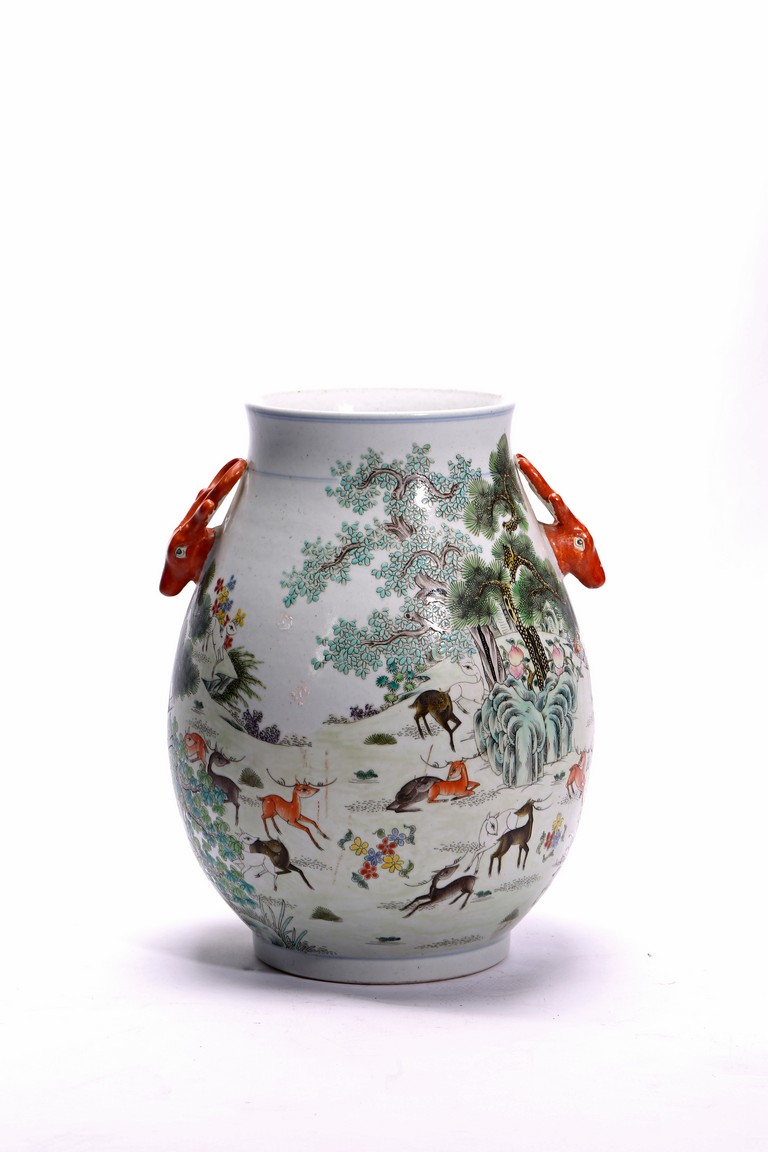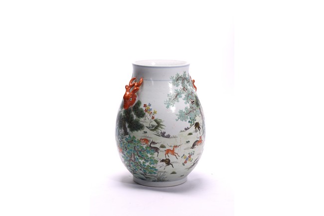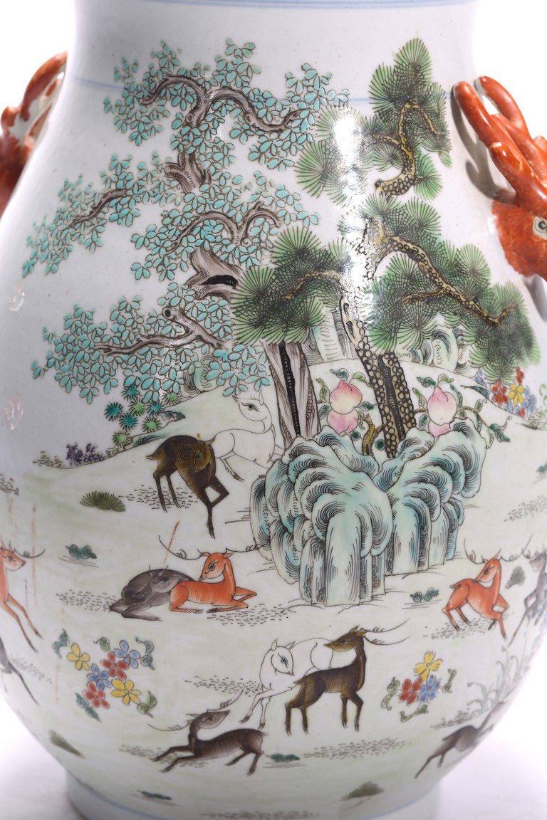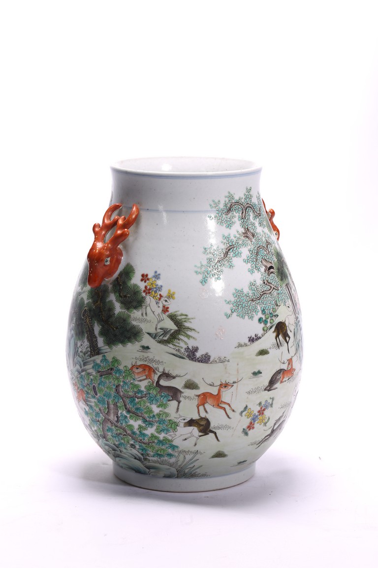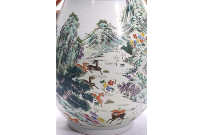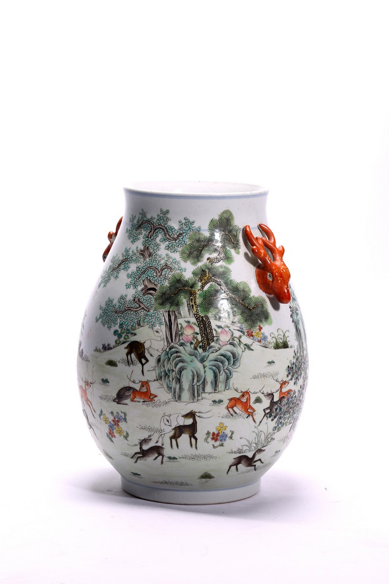 Of pear shape, brightly enamelled around the exterior with one hundred deer amidst a rocky landscape, set at the shoulder with a pair of iron-red dragon handles, the base with apocryphal Kangxi mark.