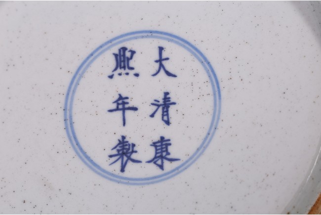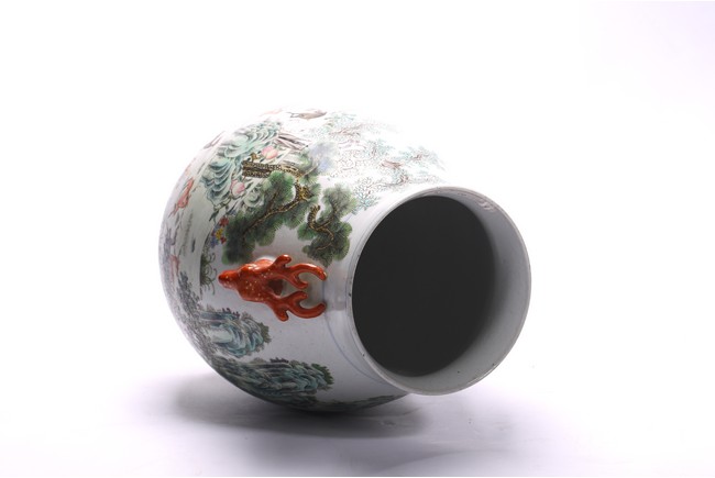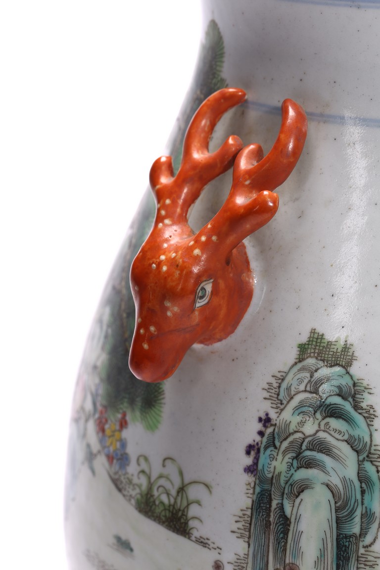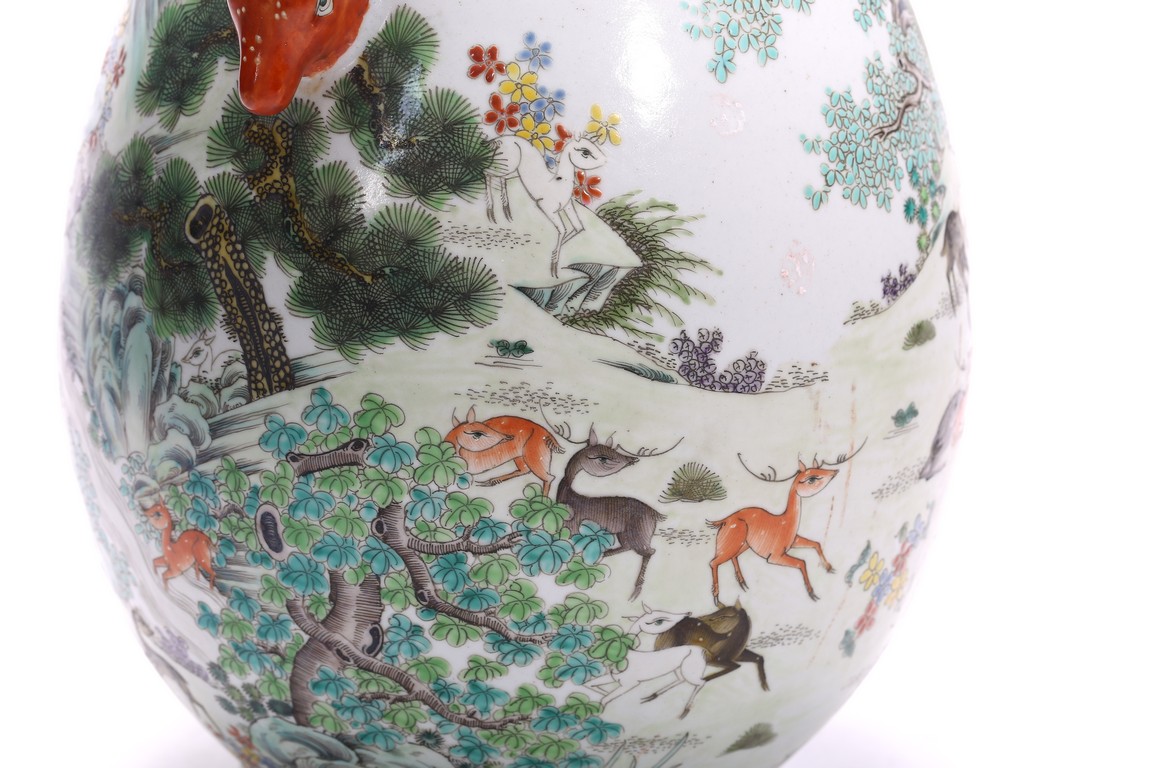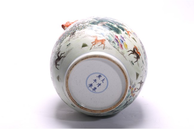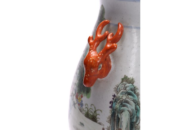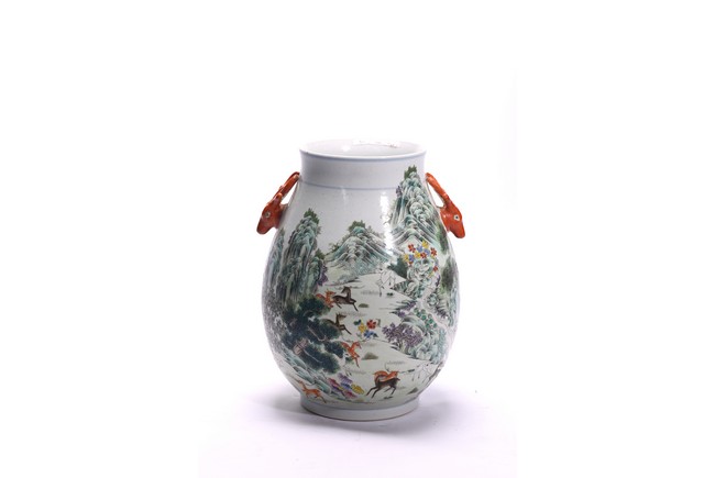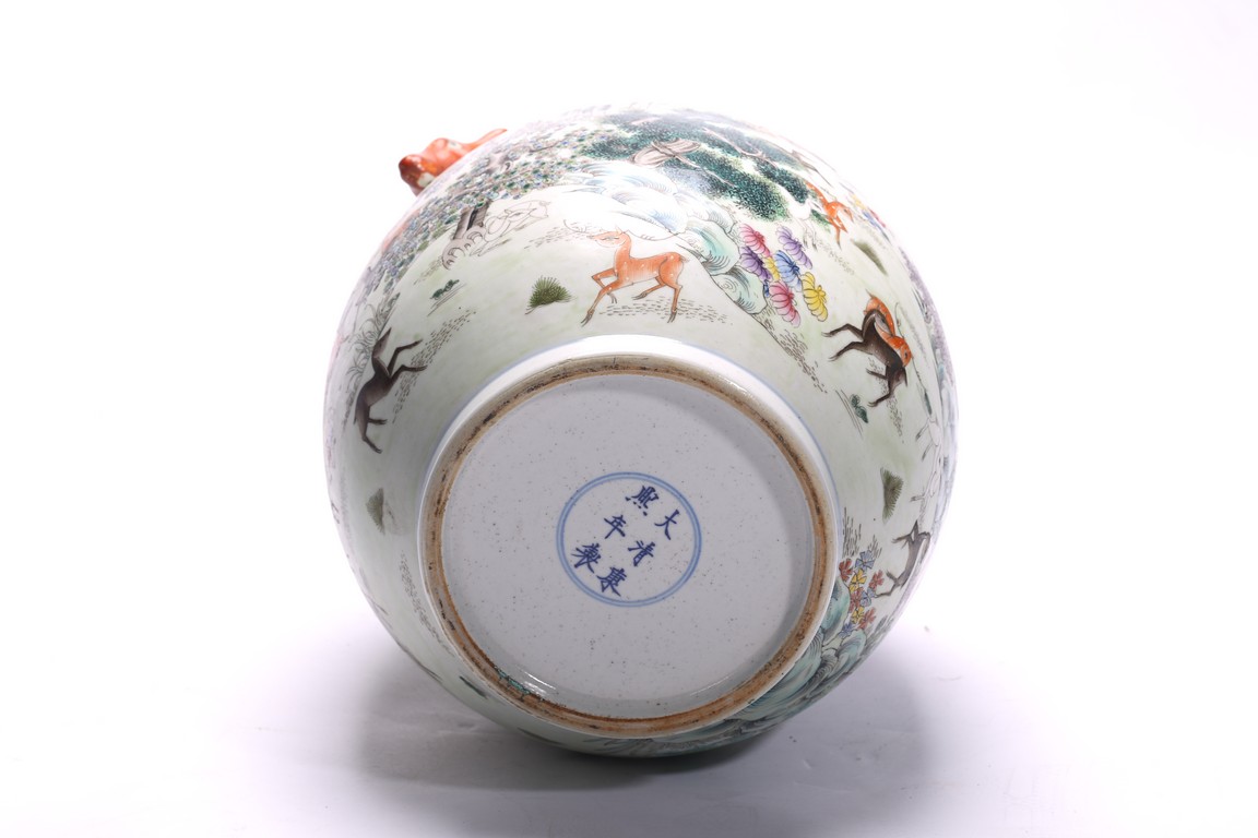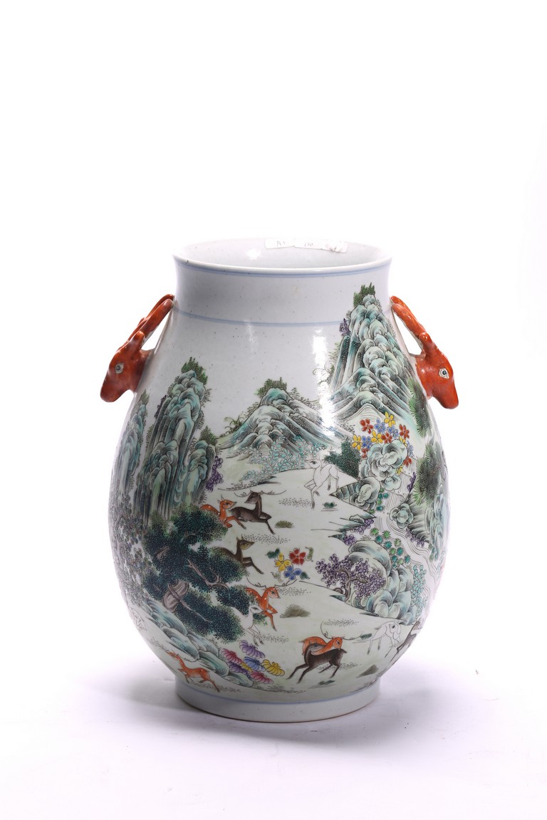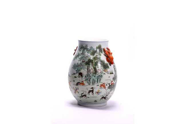 Of pear shape, brightly enamelled around the exterior with one hundred deer amidst a rocky landscape, set at the shoulder with a pair of iron-red dragon handles, the base with apocryphal Kangxi mark.