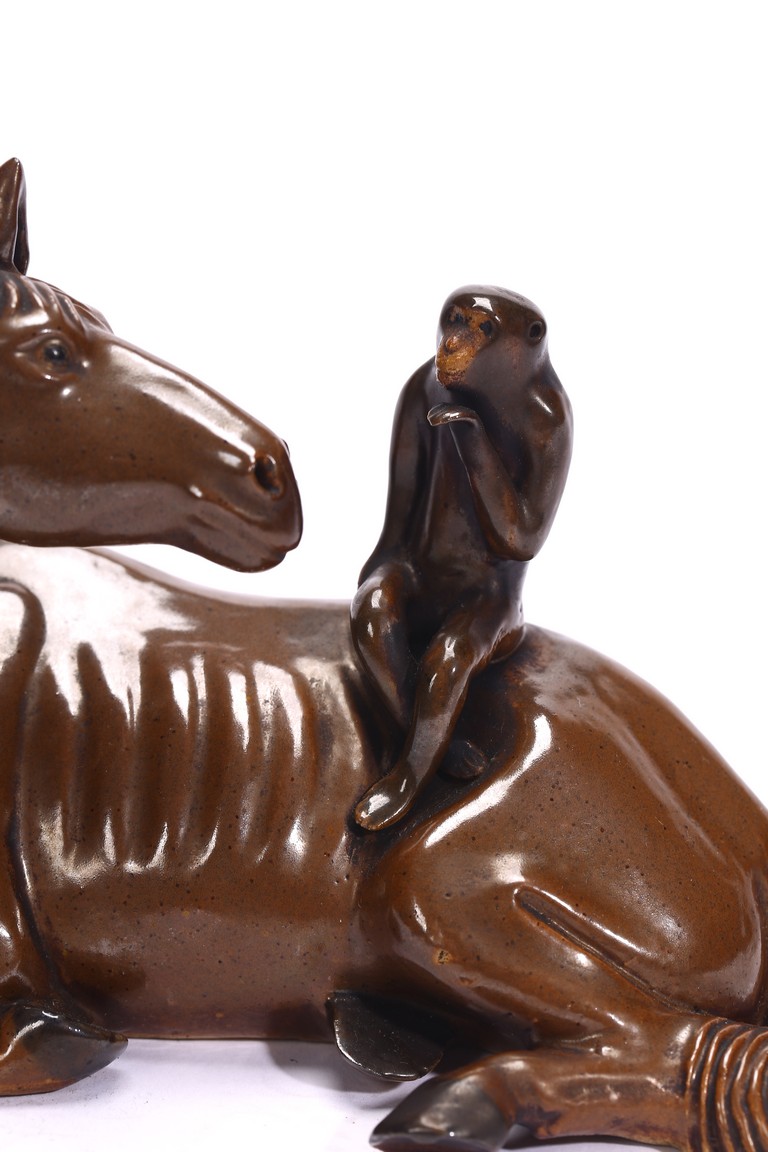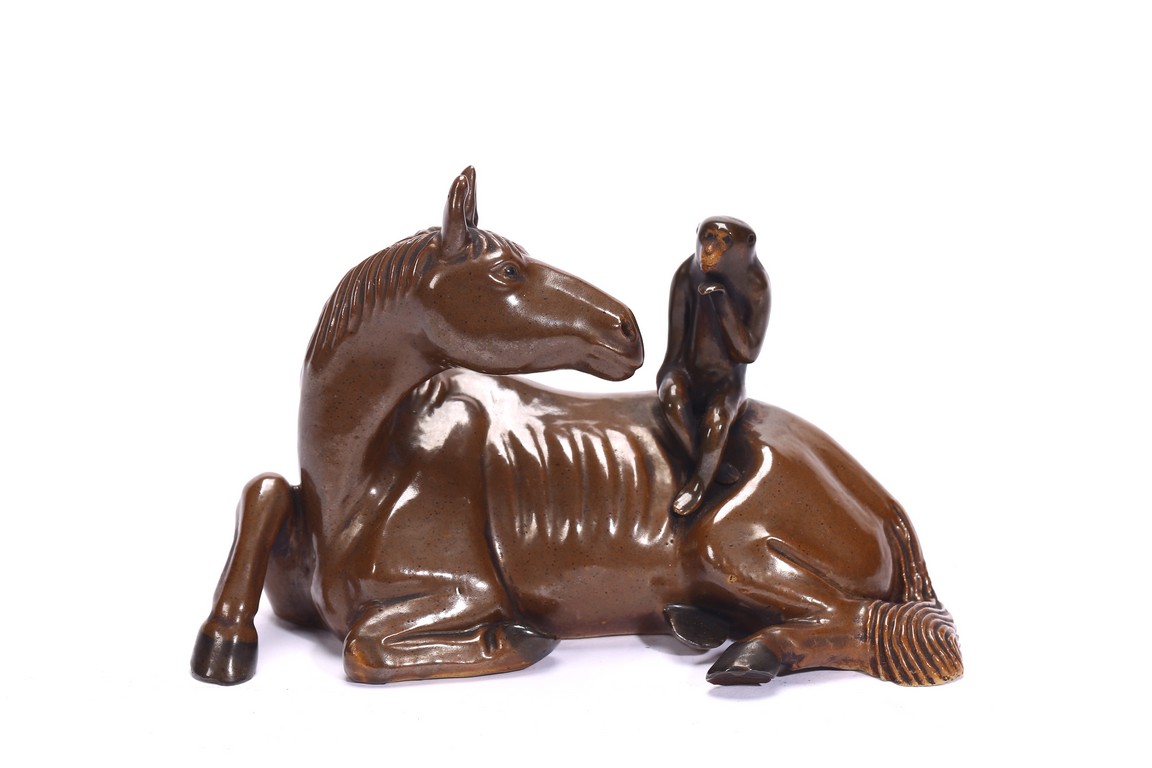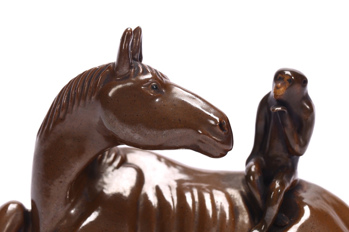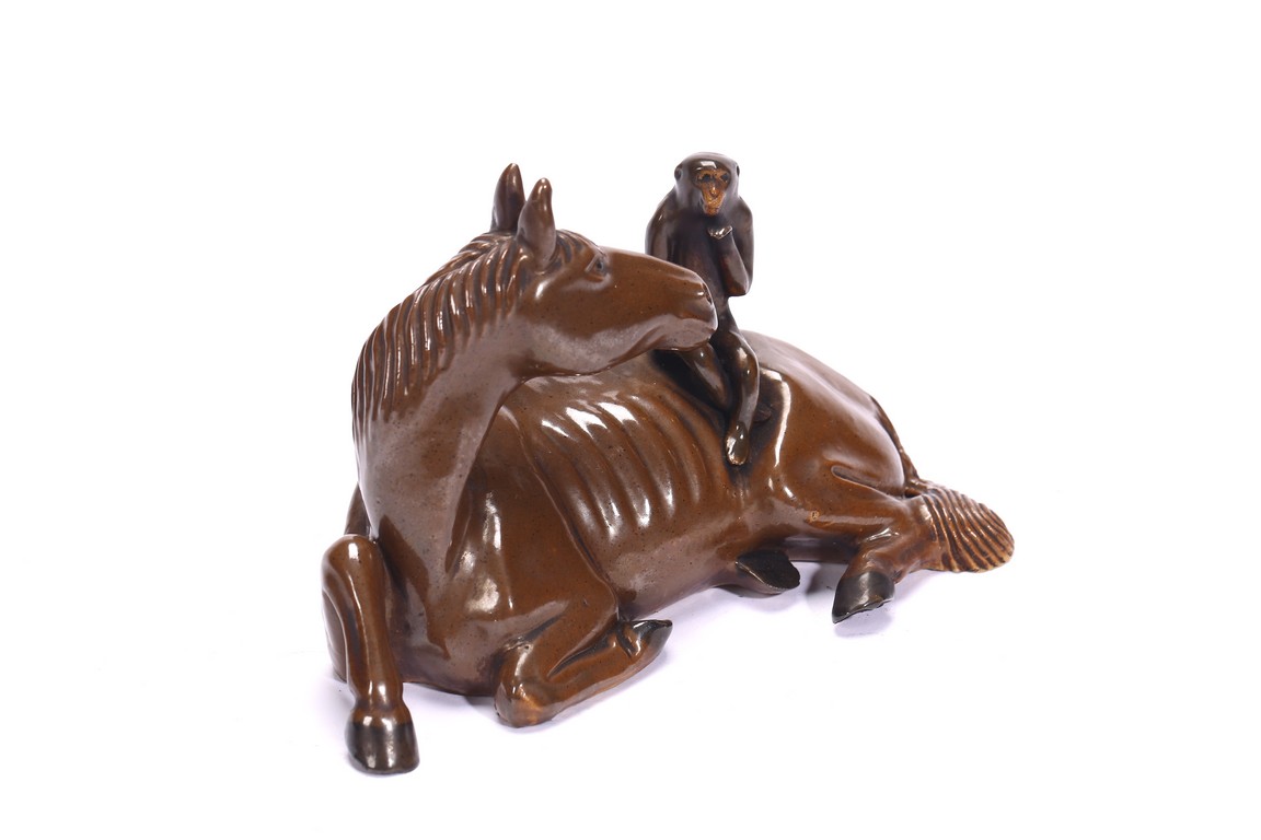 Modelled in the form of a monkey seated atop of recumbent horse with head turned back. The base unglazed.