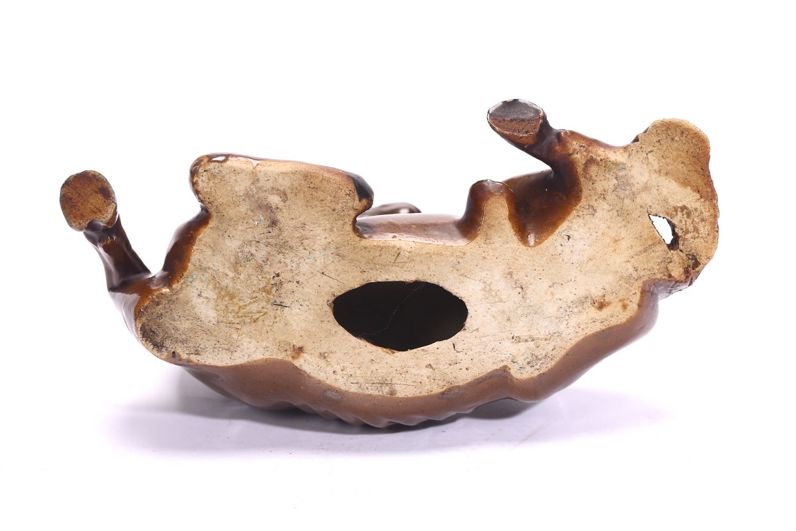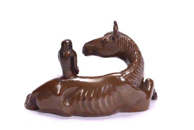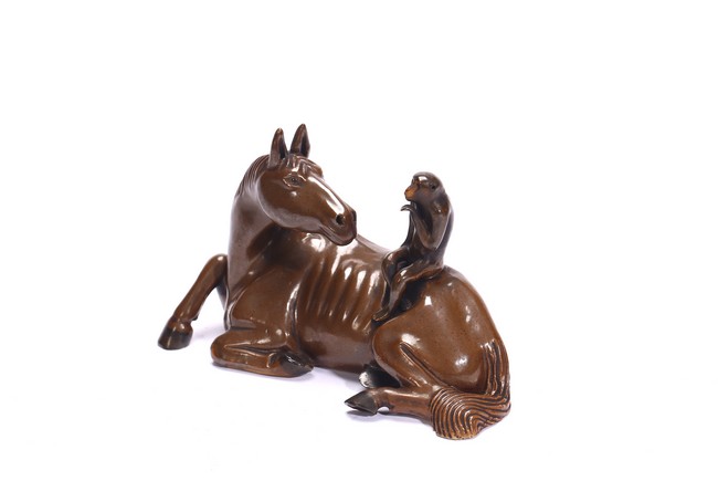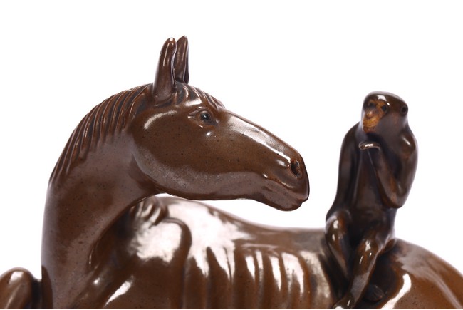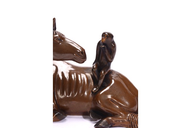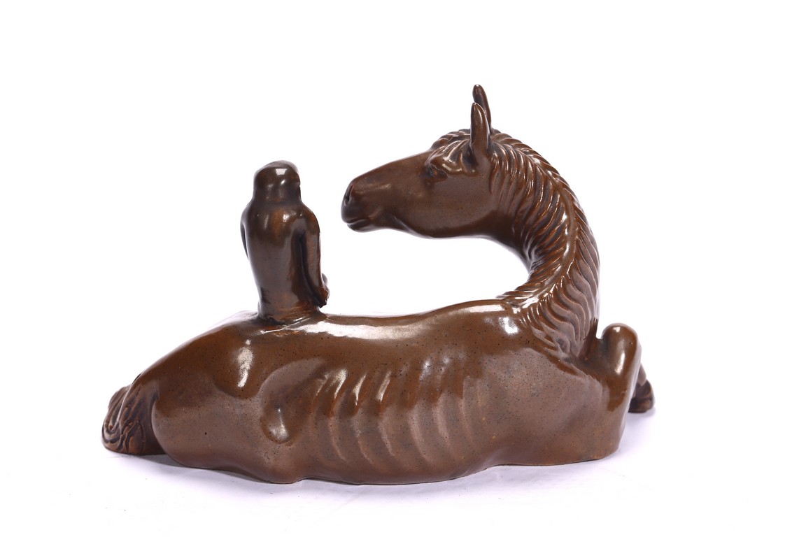 Modelled in the form of a monkey seated atop of recumbent horse with head turned back. The base unglazed.