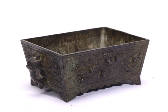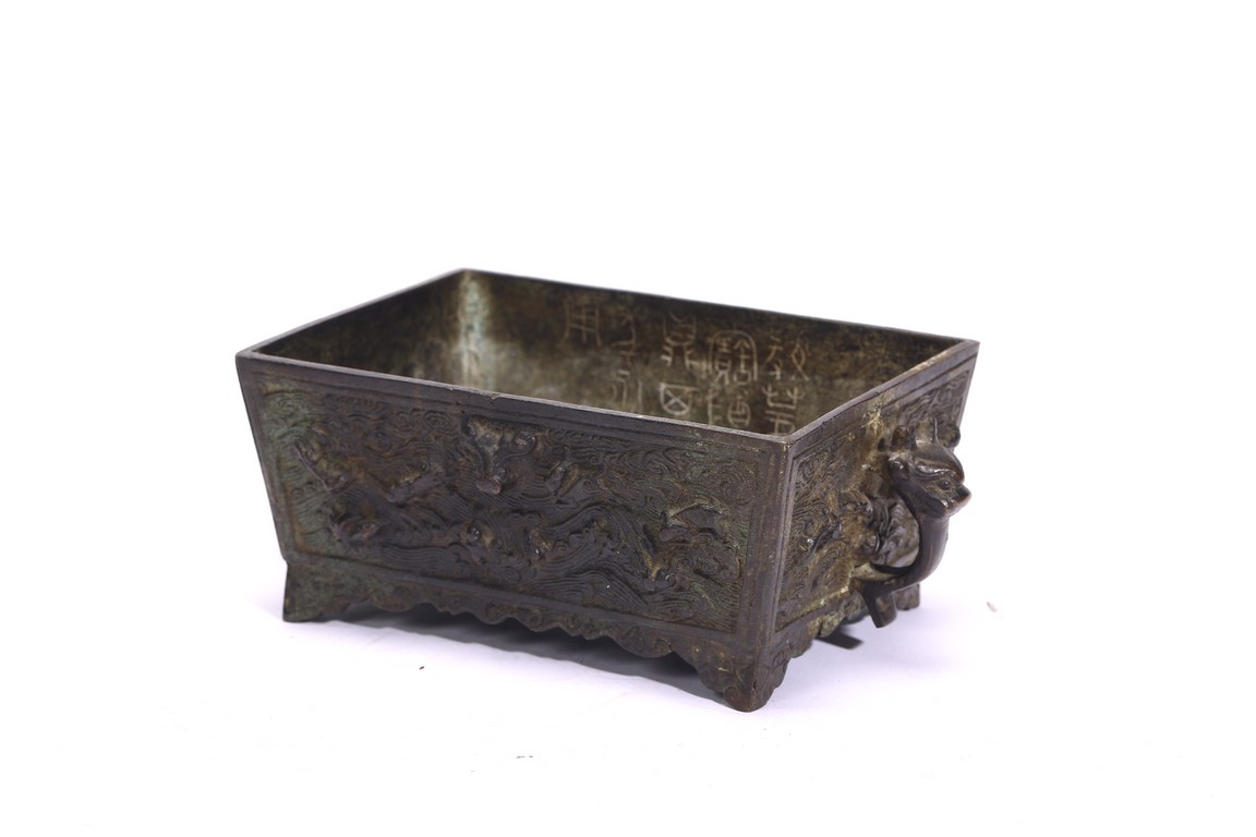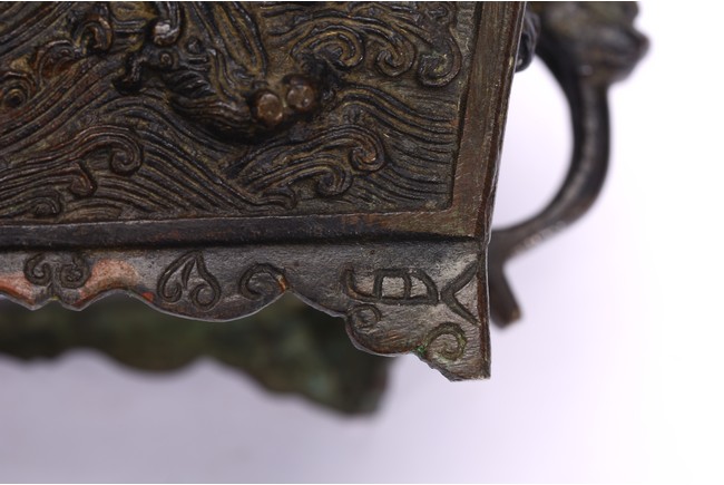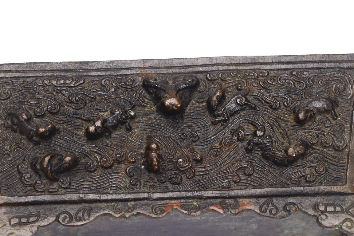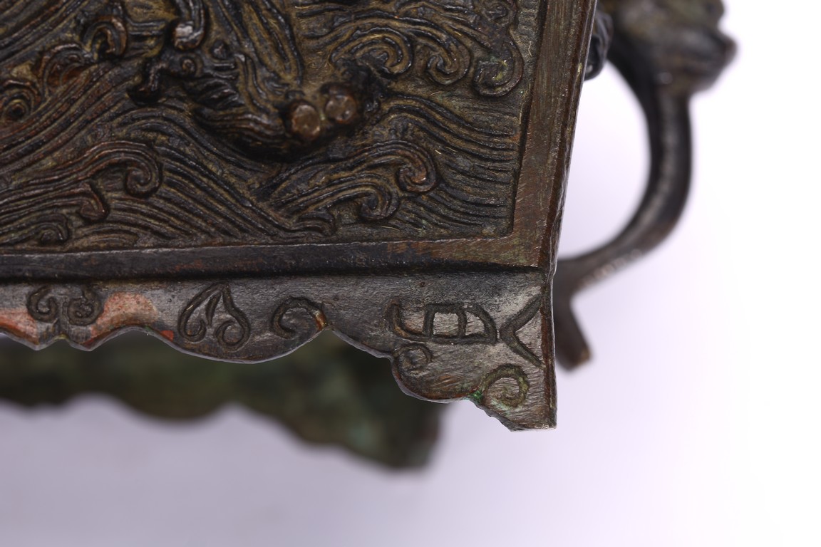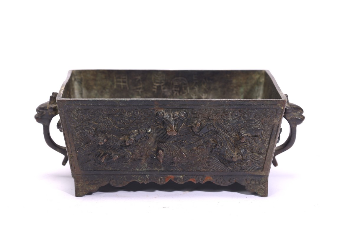 Song Dynasty period or earlier. Of rectangular section, the body finely cast with mythical beasts emerging from turbulent sea waves, both sides cast with a mythical beast head handle, the interior incised with archaic inscription in seal script.