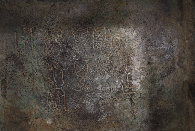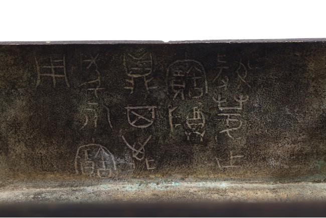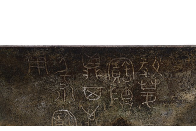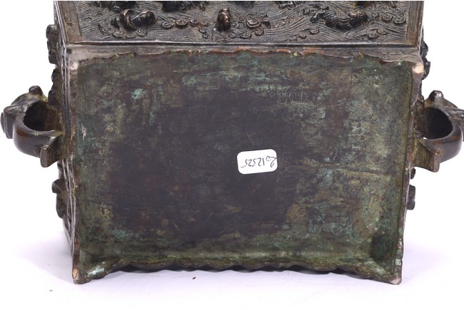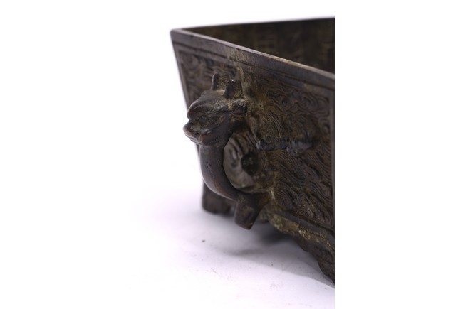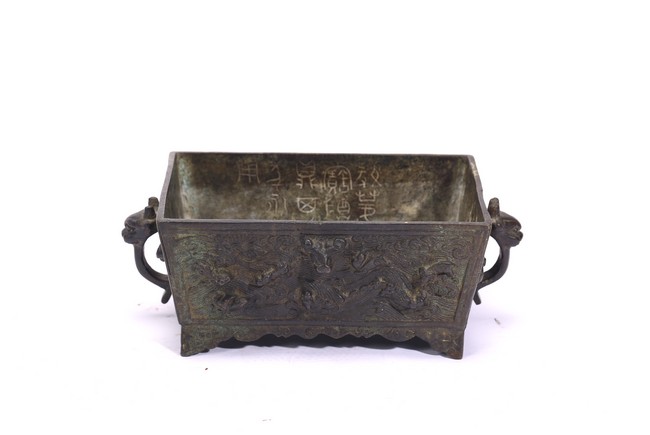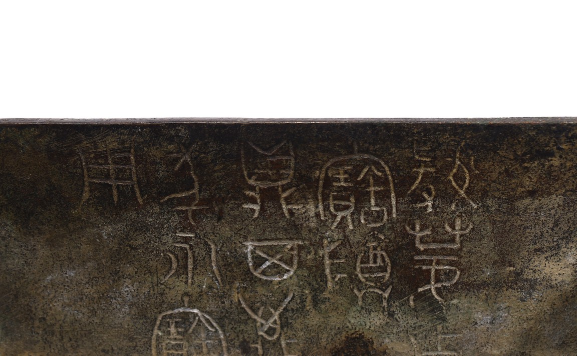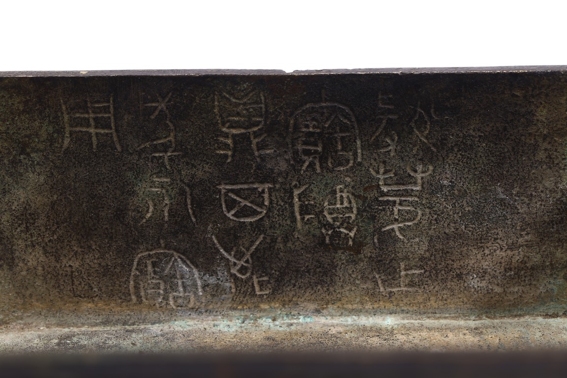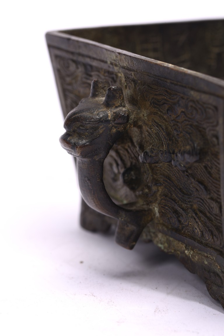 Song Dynasty period or earlier. Of rectangular section, the body finely cast with mythical beasts emerging from turbulent sea waves, both sides cast with a mythical beast head handle, the interior incised with archaic inscription in seal script.