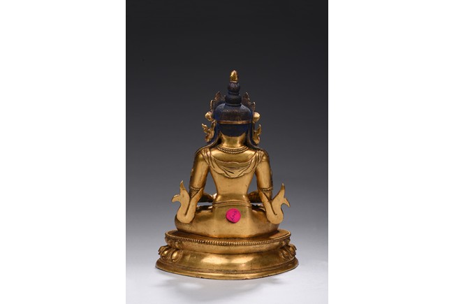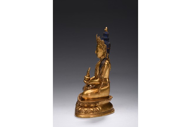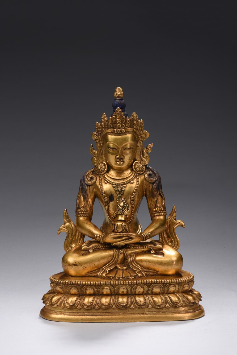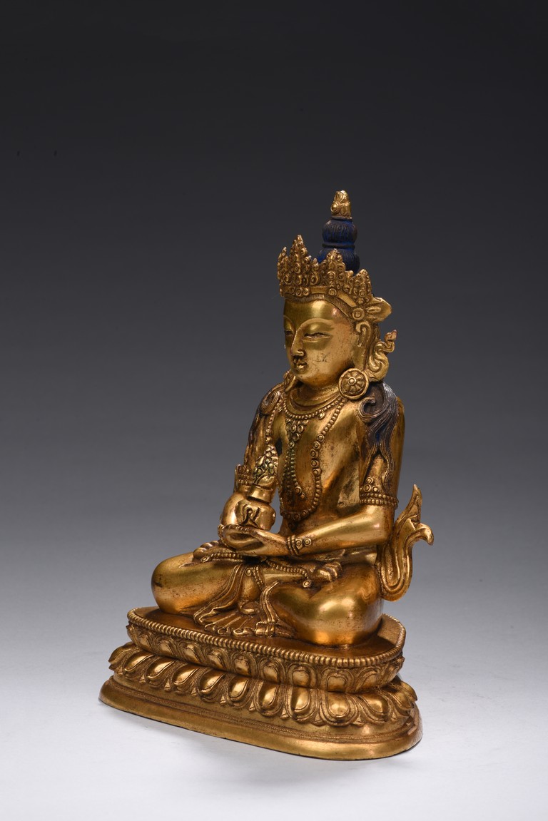 The bodhisattva is shown seated upon a double lotus throne in dhyanasana, hands in dhyana mutra holding a vessel , wearing dhoti and revealing the adorned chest, face with benevolent expression and topped tall ushnisha. Qing Dynasty period.