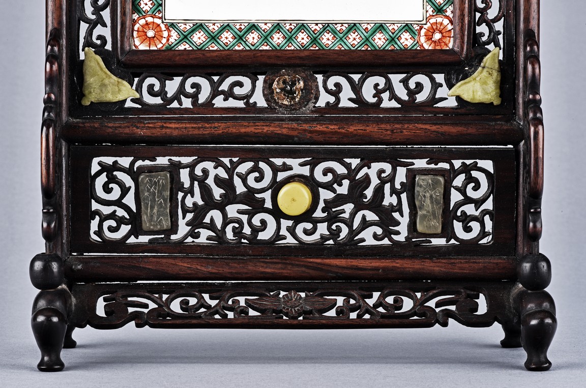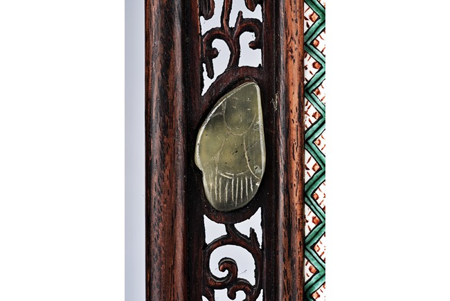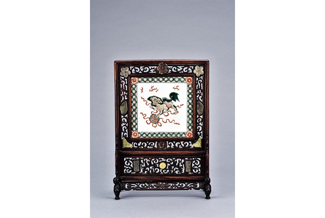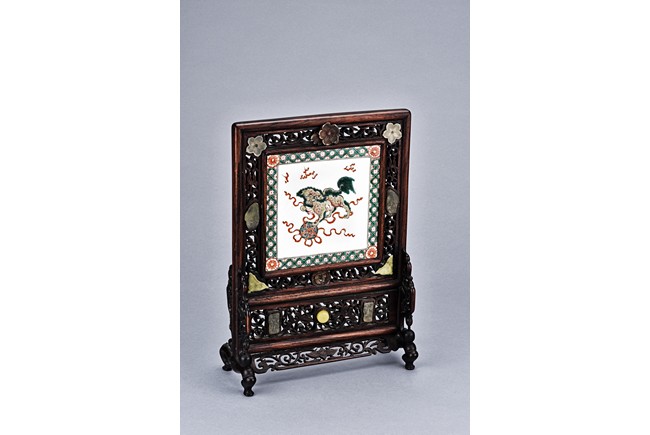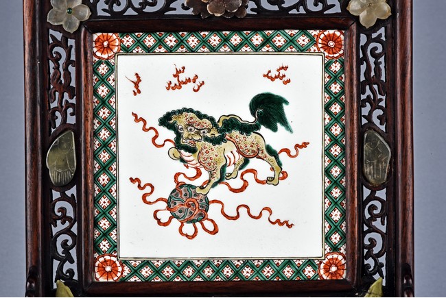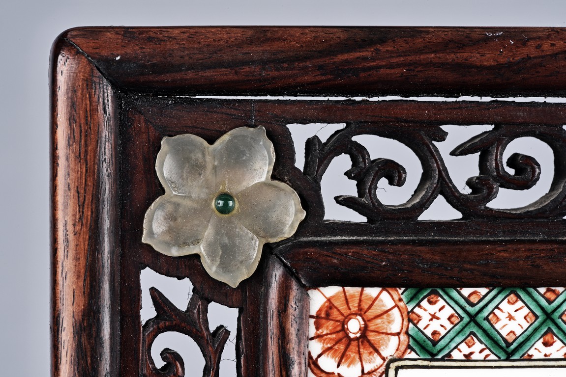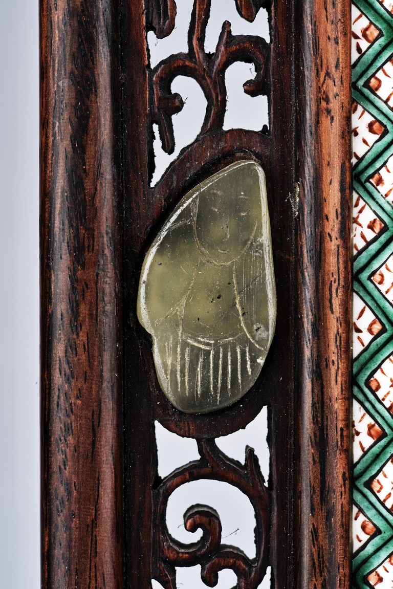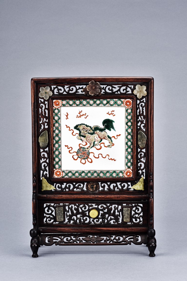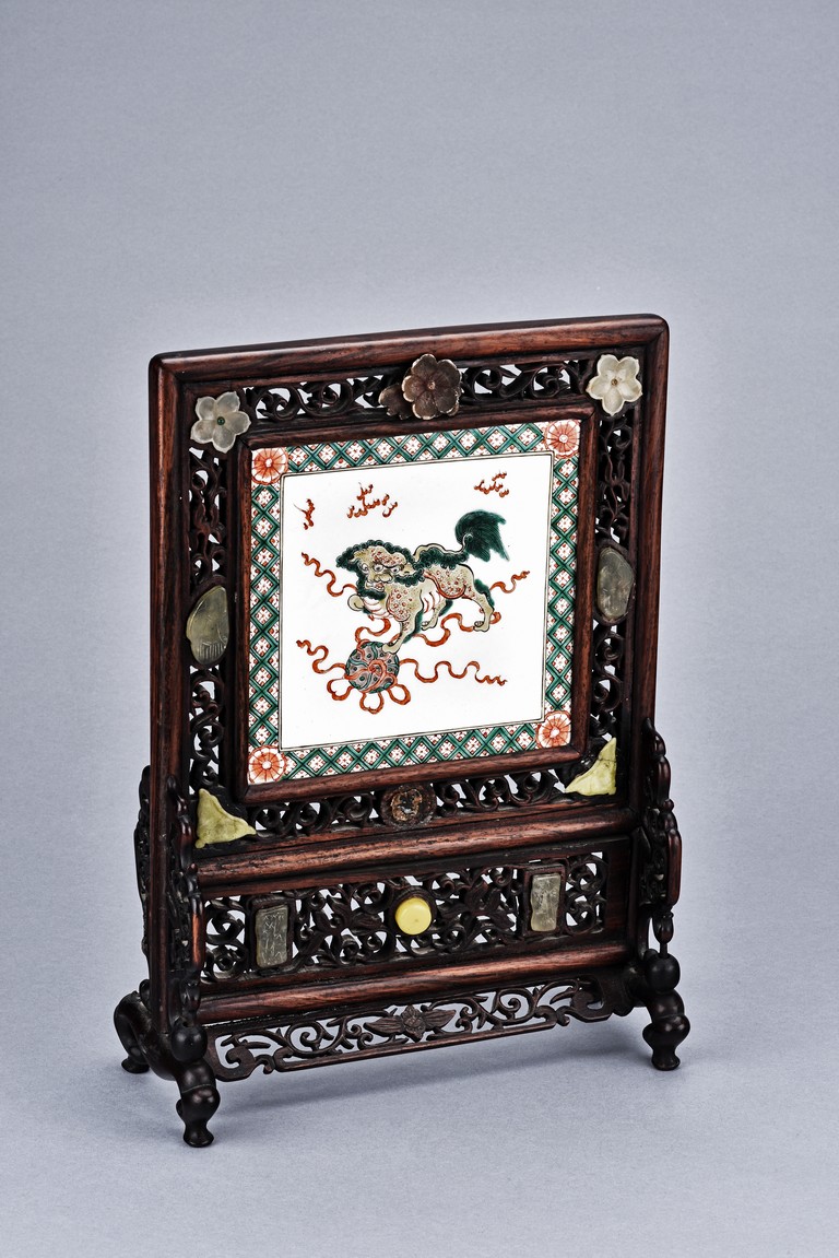 Qing Dynasty period. Of rectangular form, the wucai decorated porcelain panel is inset on the table screen, with depiction of a Buddhist lion playing ball, with openwork scrolling floral pattern and various jades embellished outside the plaque.