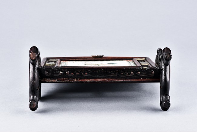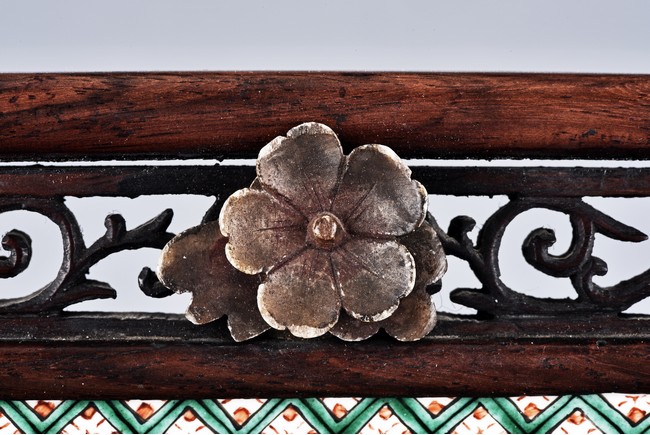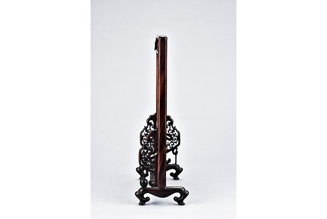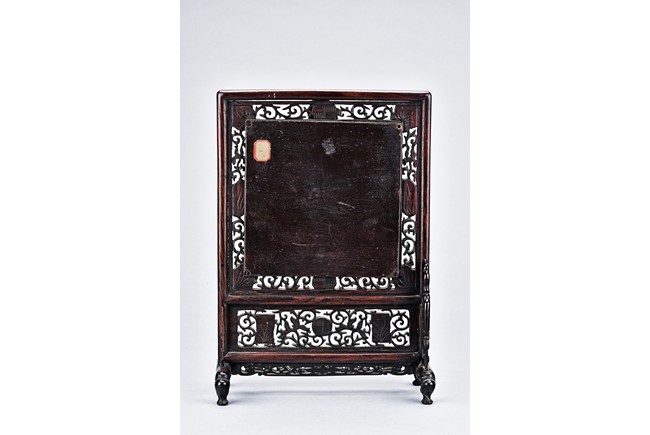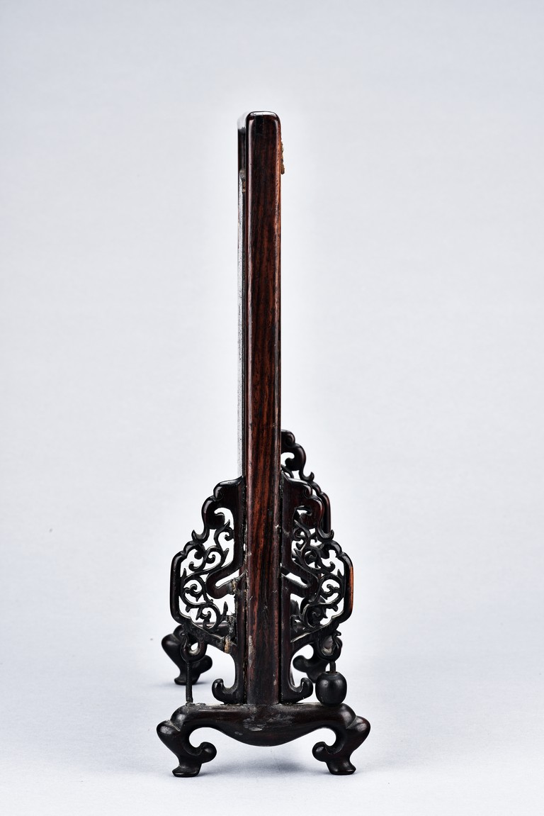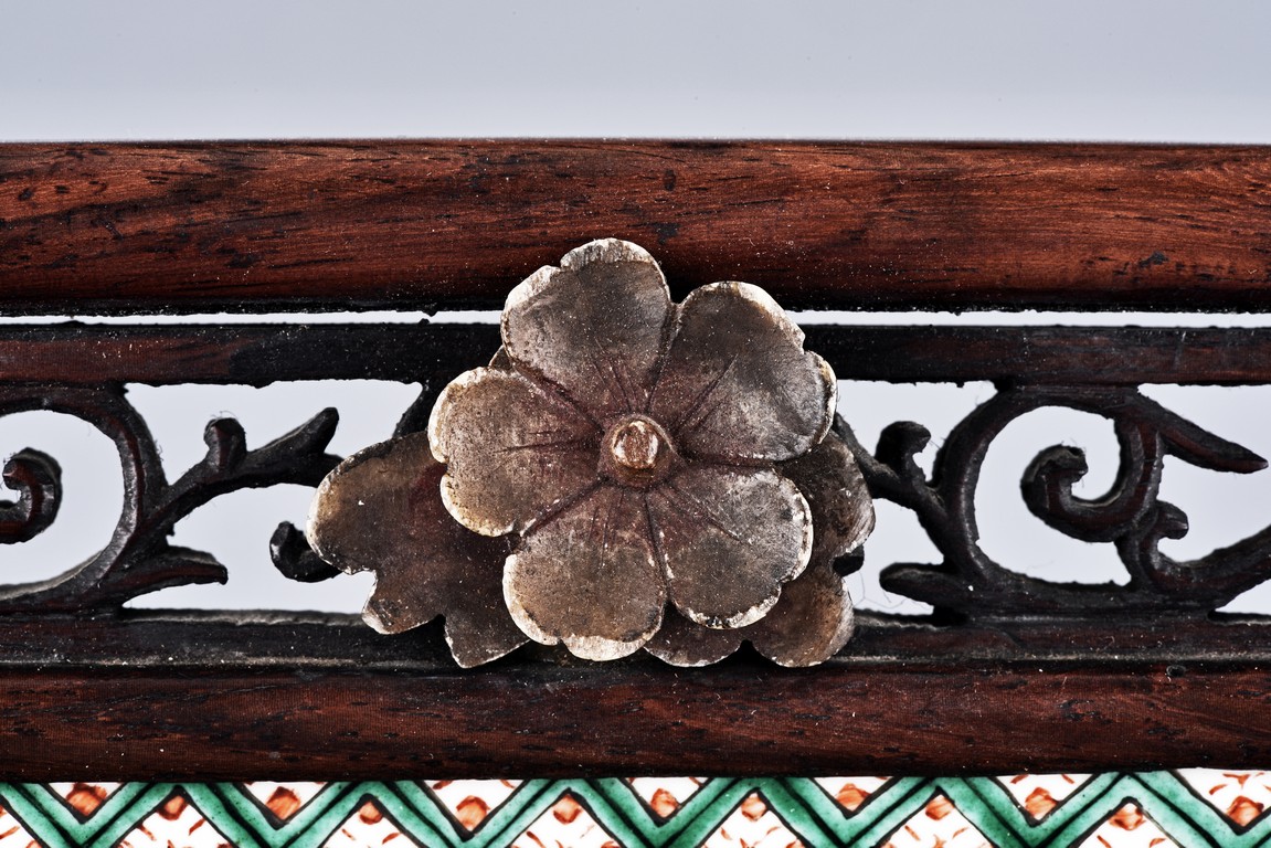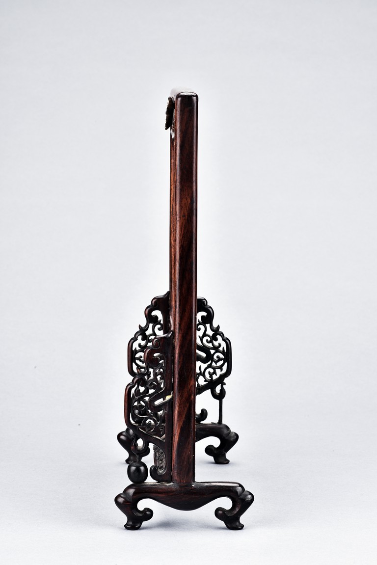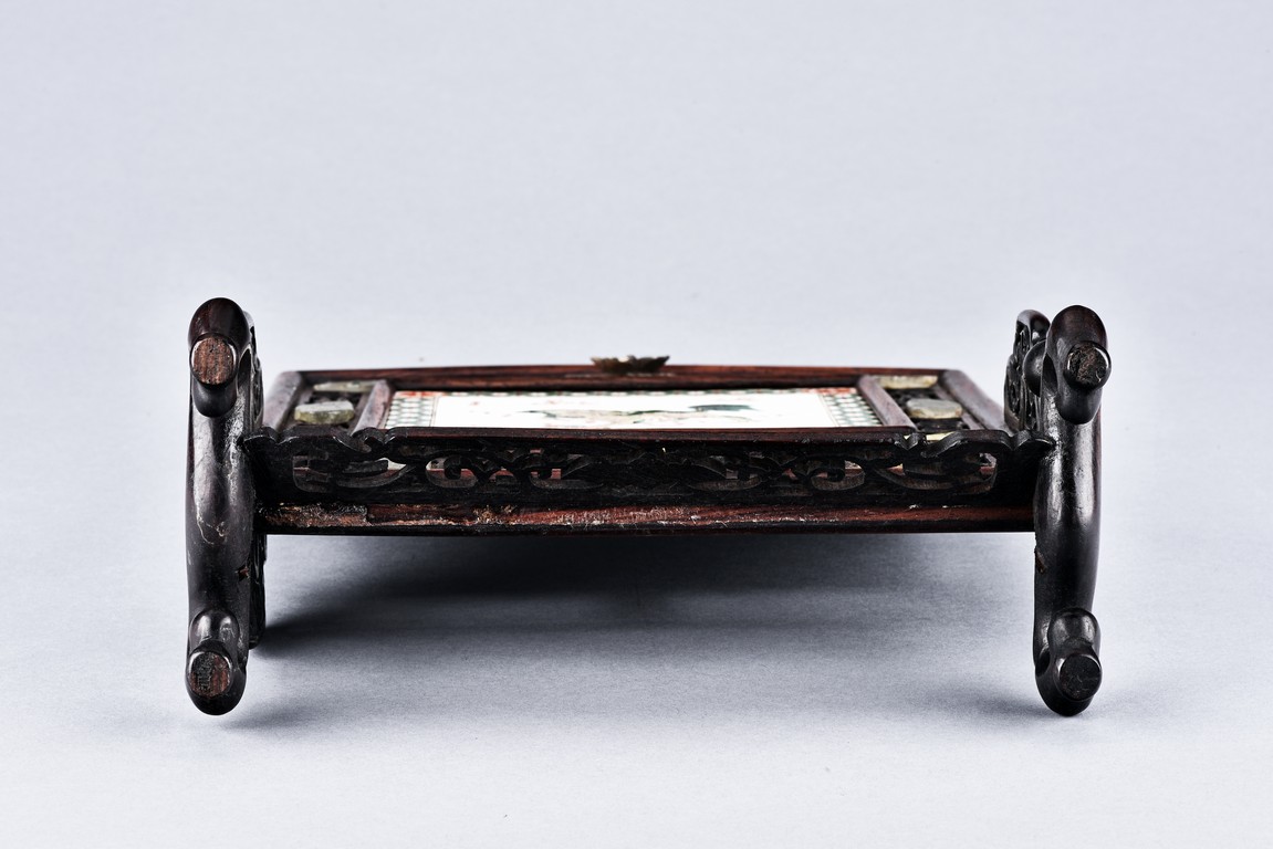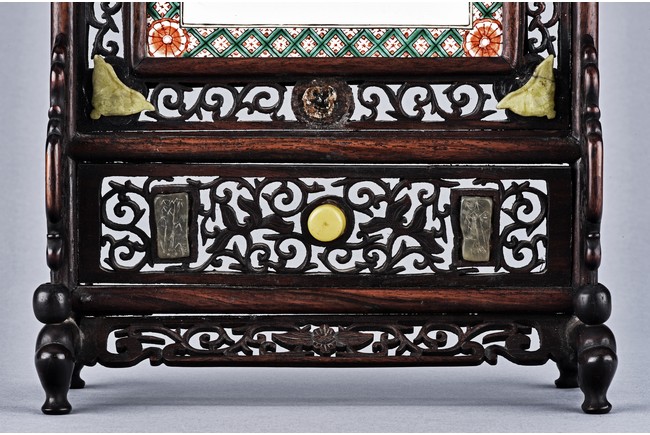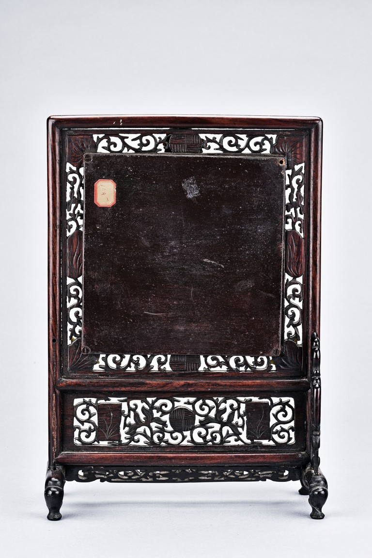 Qing Dynasty period. Of rectangular form, the wucai decorated porcelain panel is inset on the table screen, with depiction of a Buddhist lion playing ball, with openwork scrolling floral pattern and various jades embellished outside the plaque.
