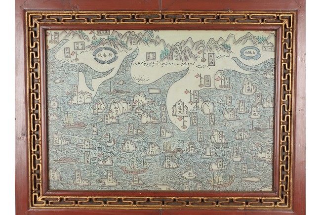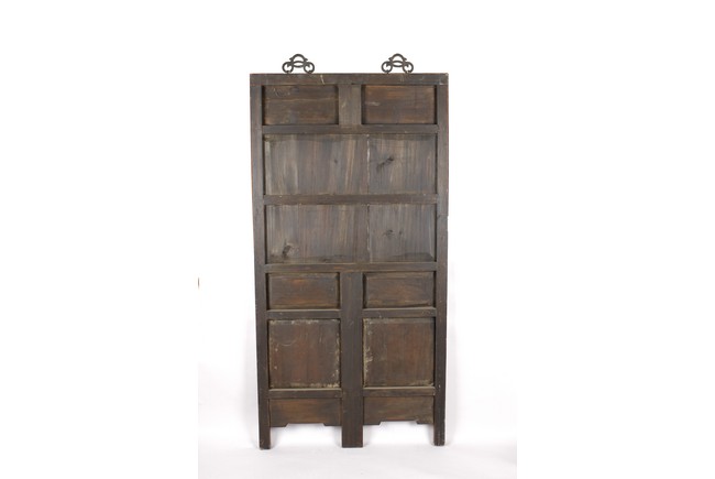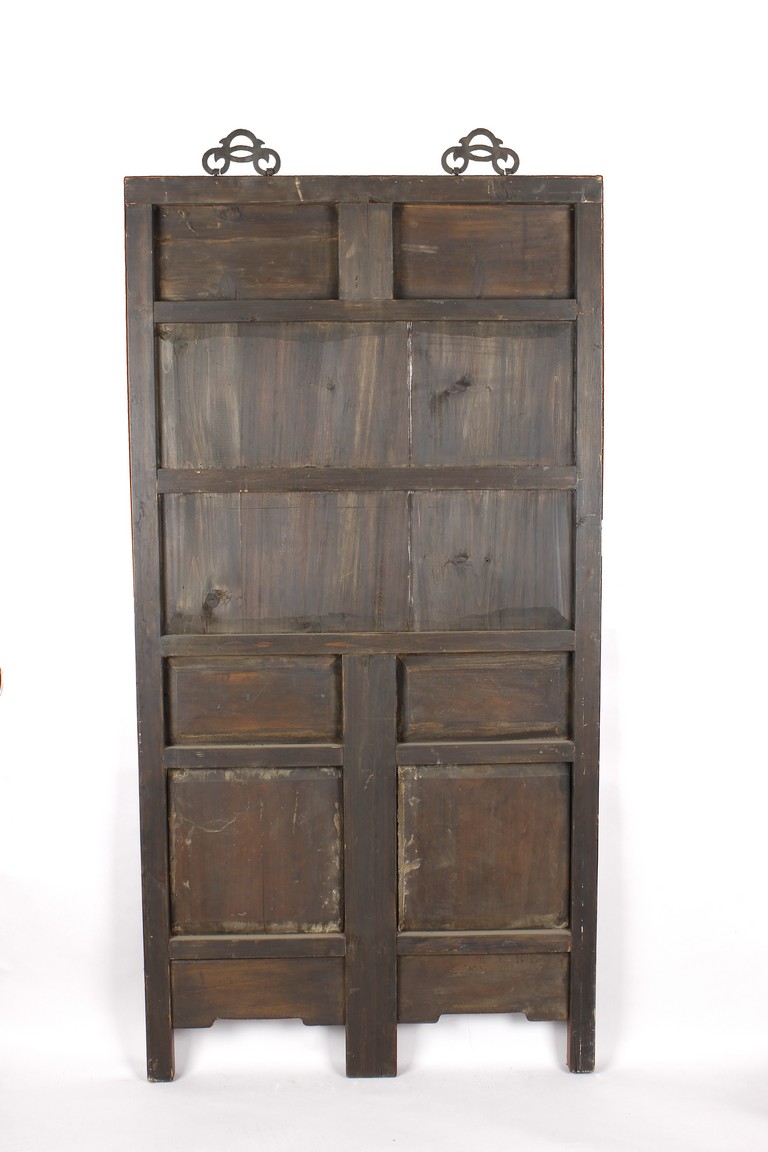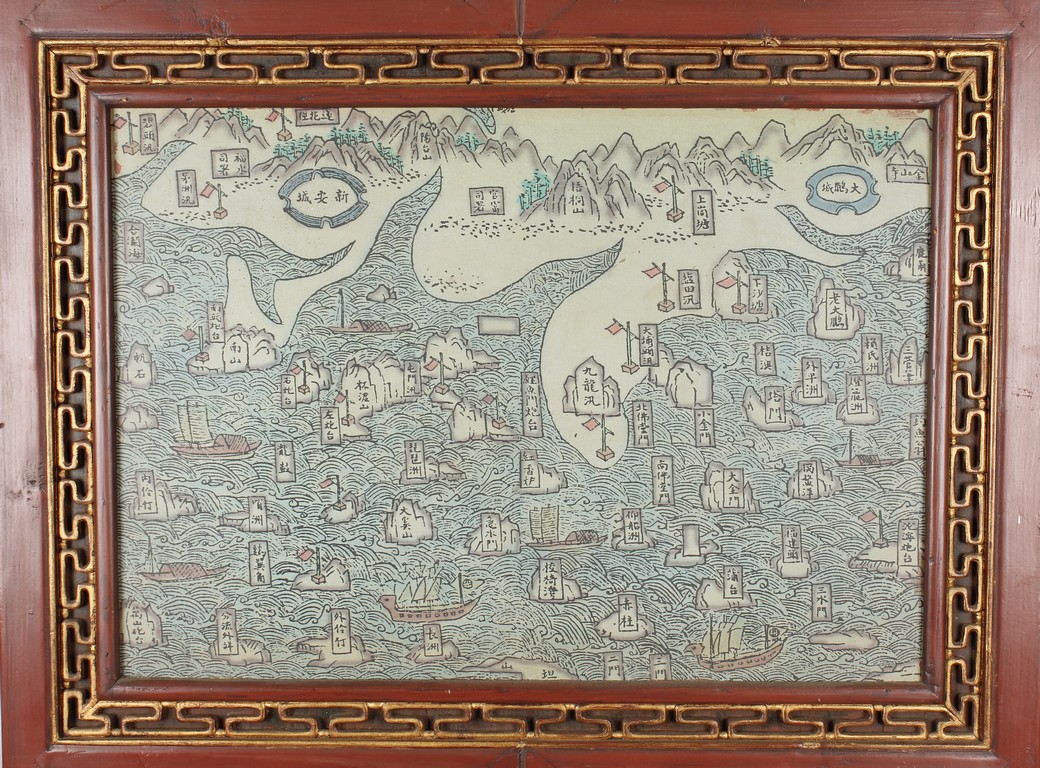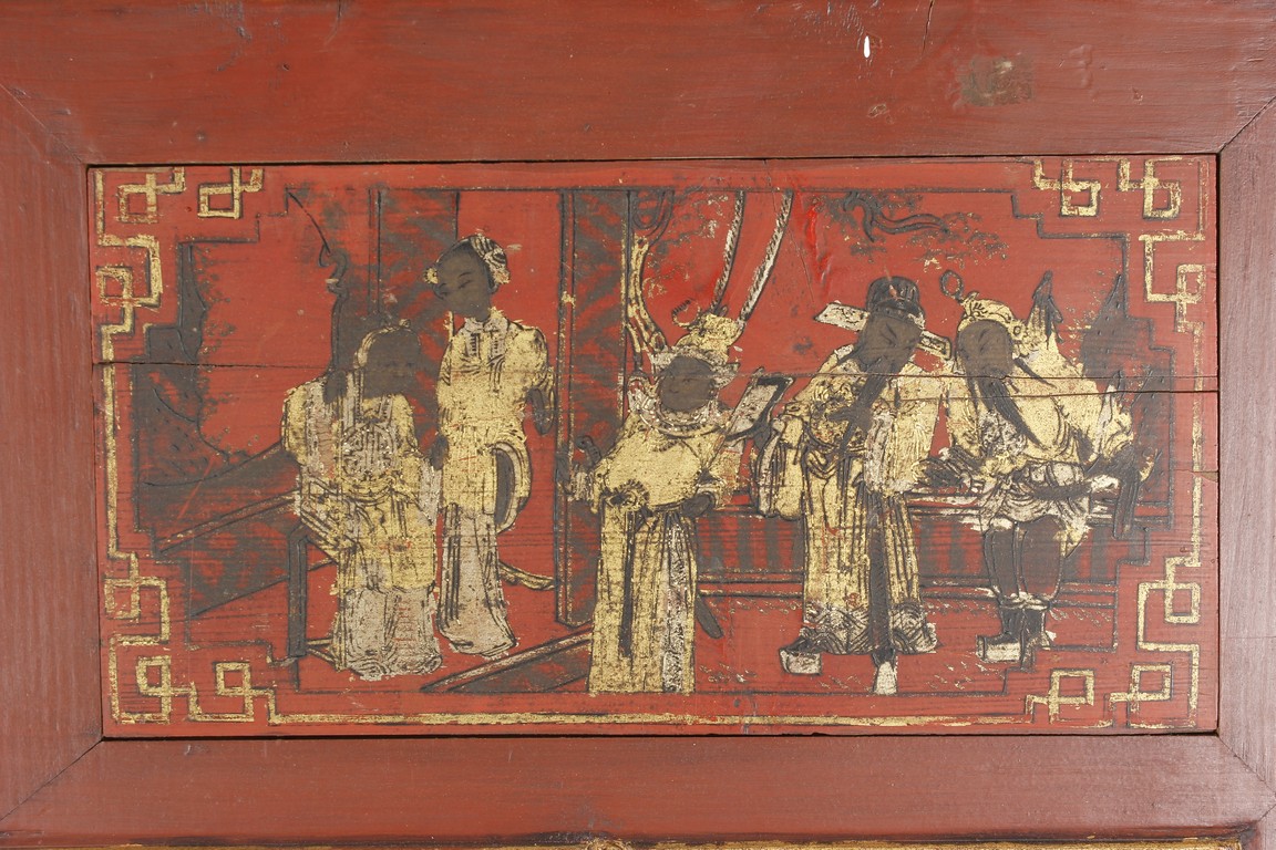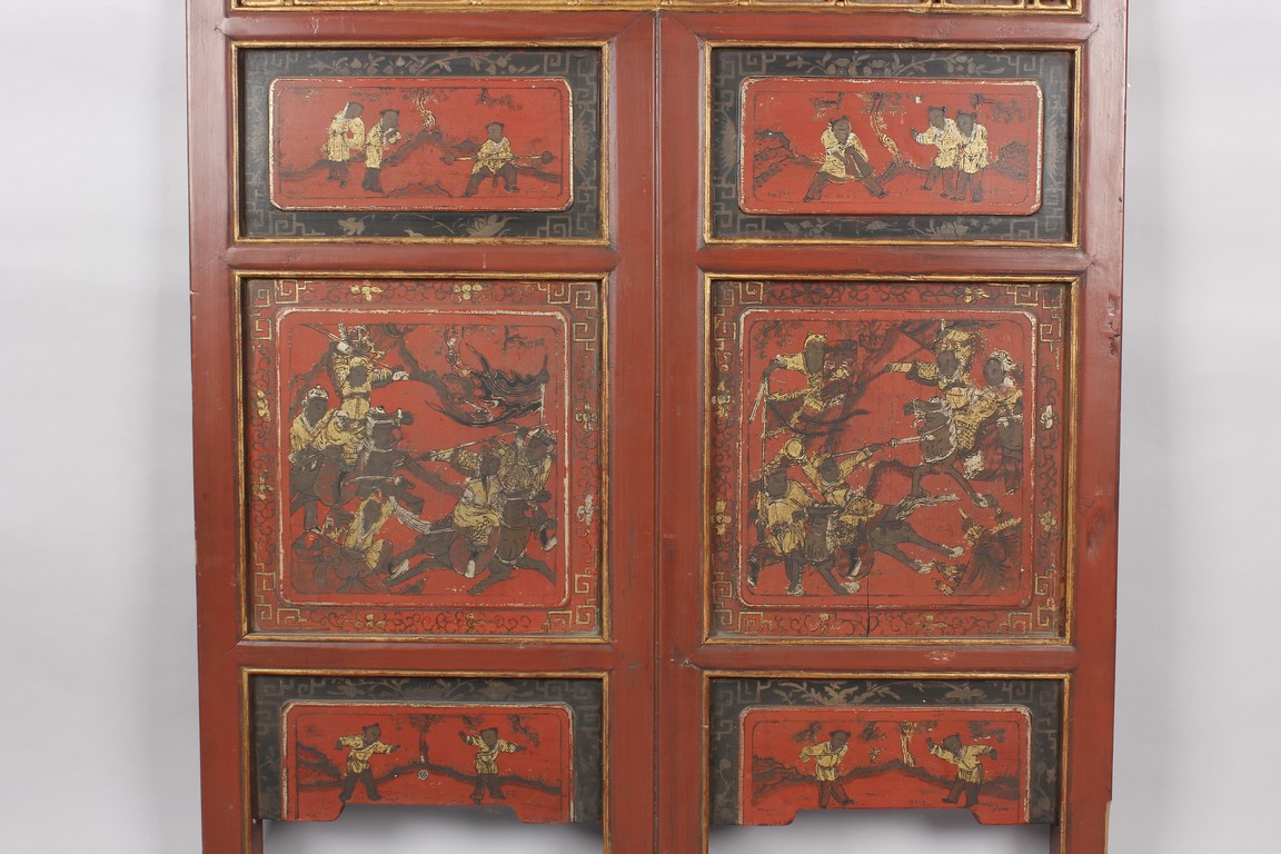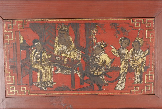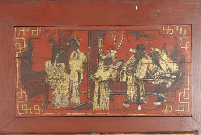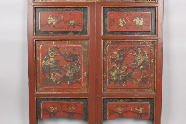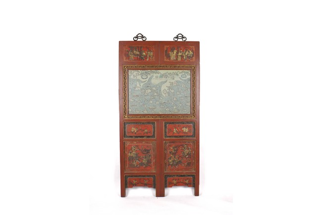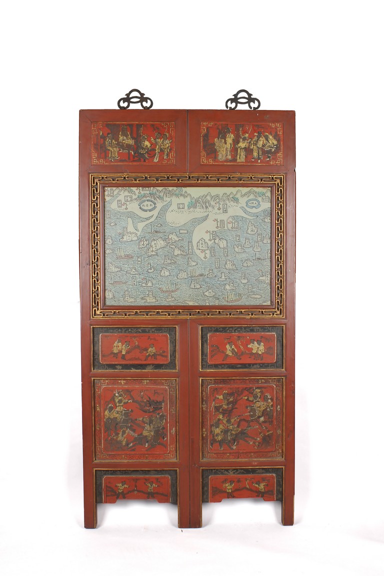 Qing Dynasty period. The two panel red lacquered screen enclosing the map of Hong Kong on the upper section (possibly later replaced) ,the lower sections with gilt painted figures and story scenes.