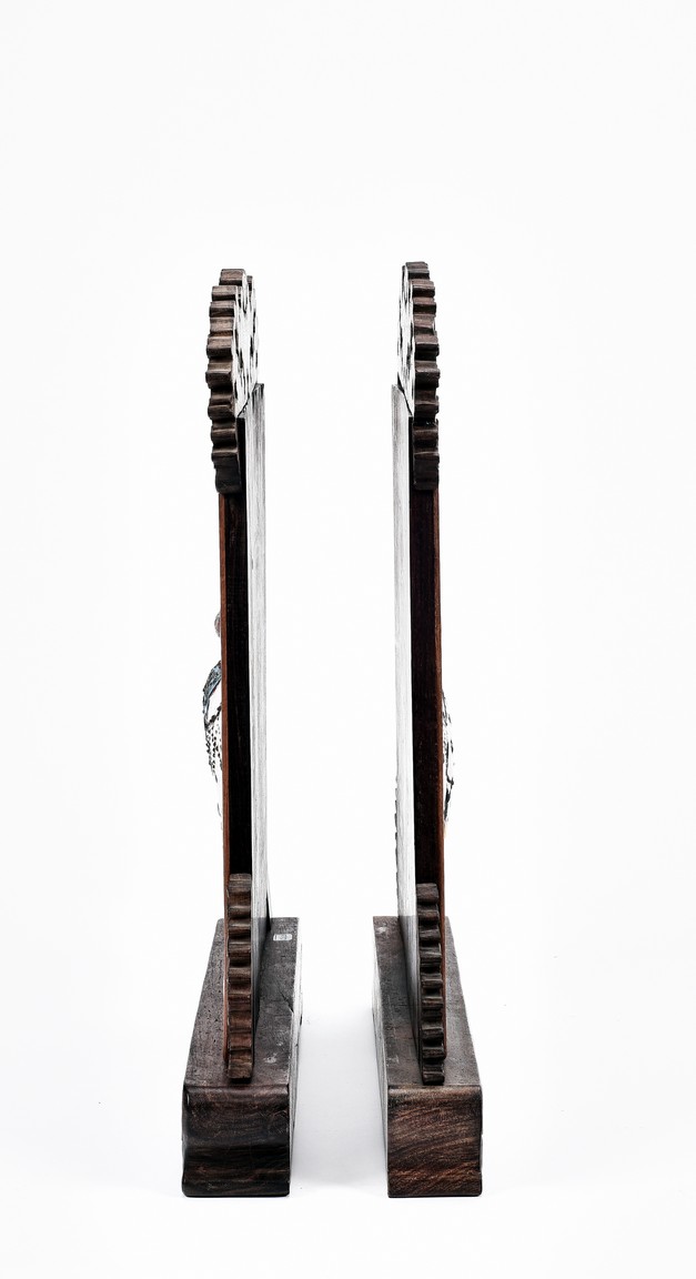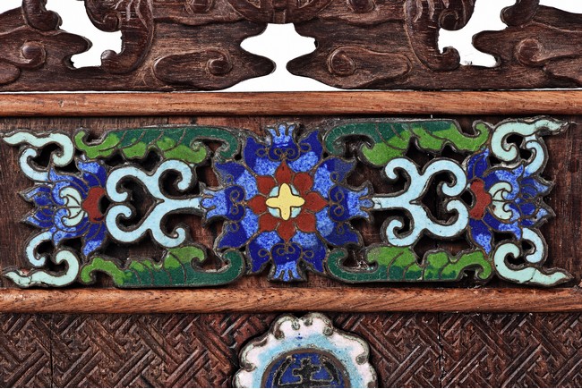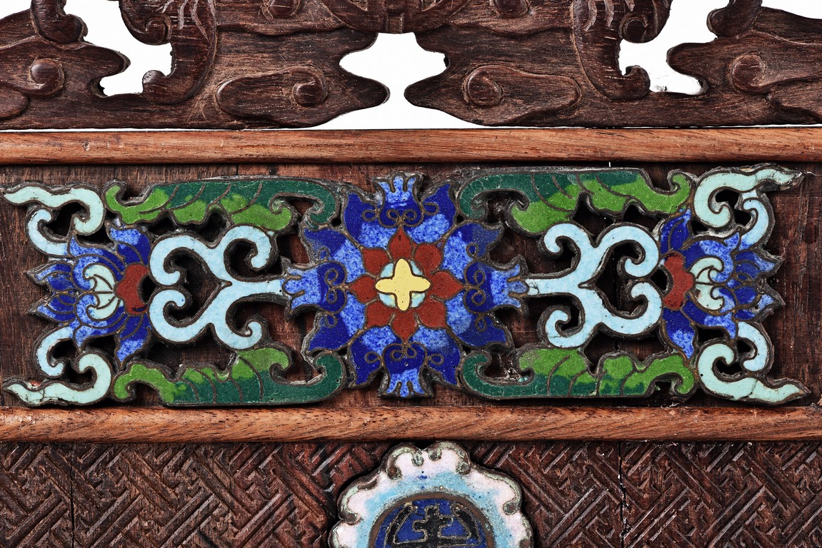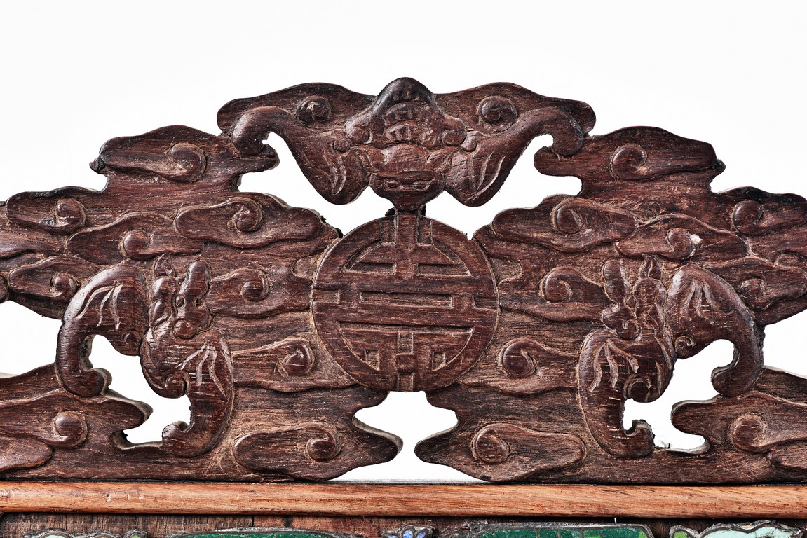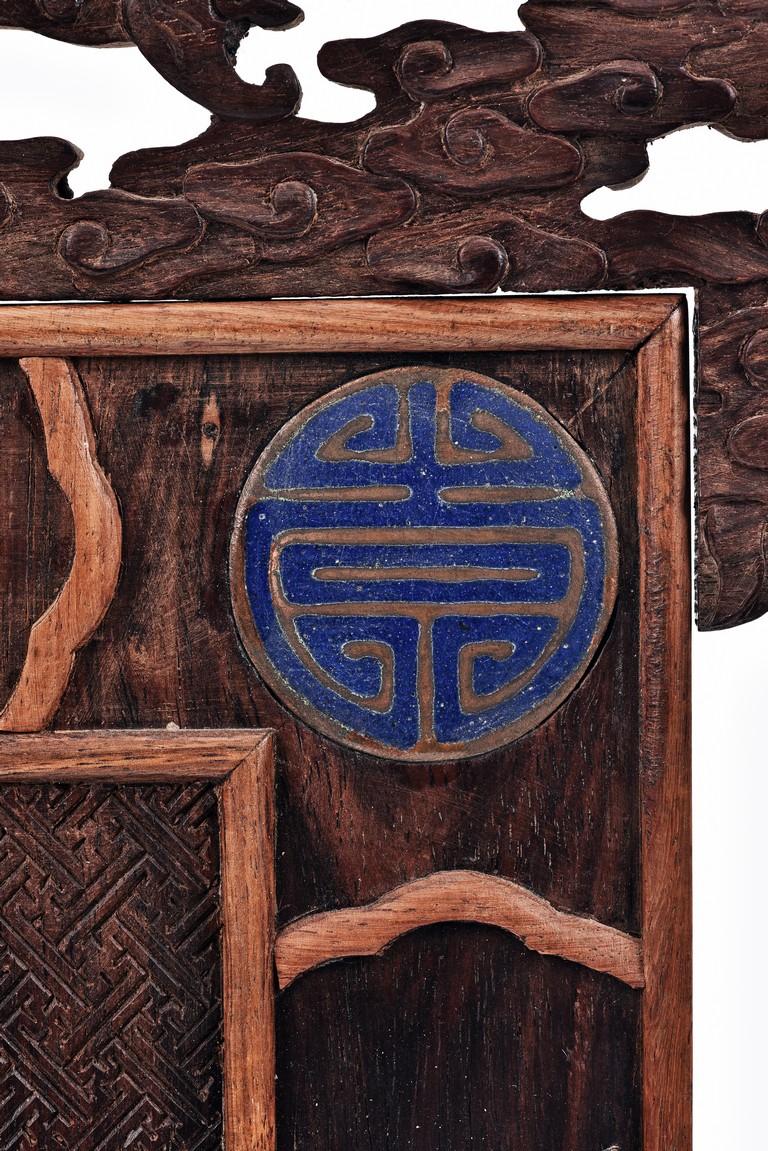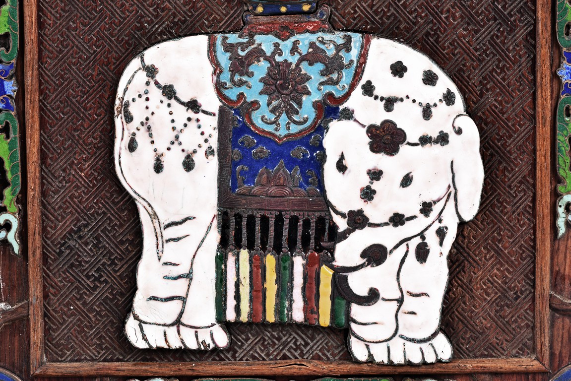 Qing Dynasty Period. Set on a hongmu stand, each table screen is inlaid with a cloisonne enamel elephant with tilted head, the back surmounted with a treasure vase, all reserved on a diaper ground, the sides decorated with auspicious motif, the top panel pierced with stylized shou character and bats amid auspicious clouds.