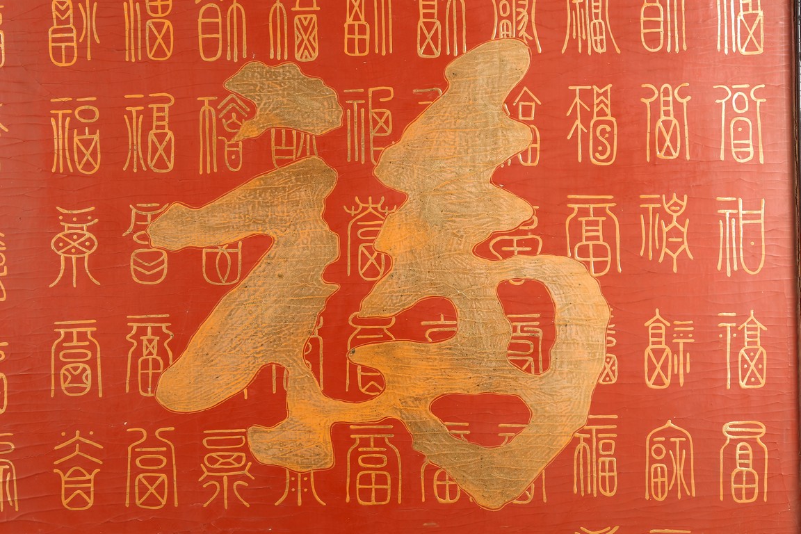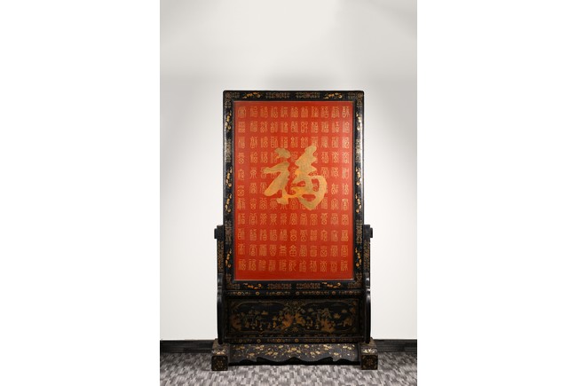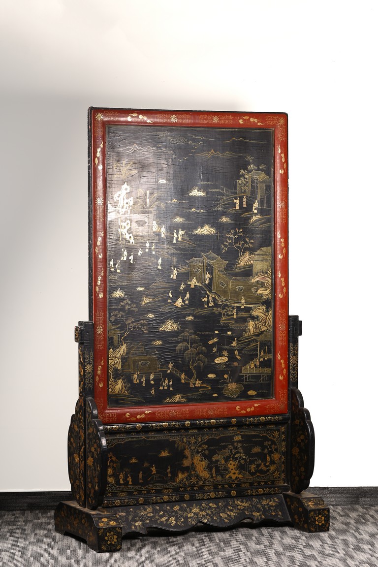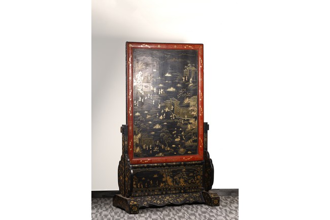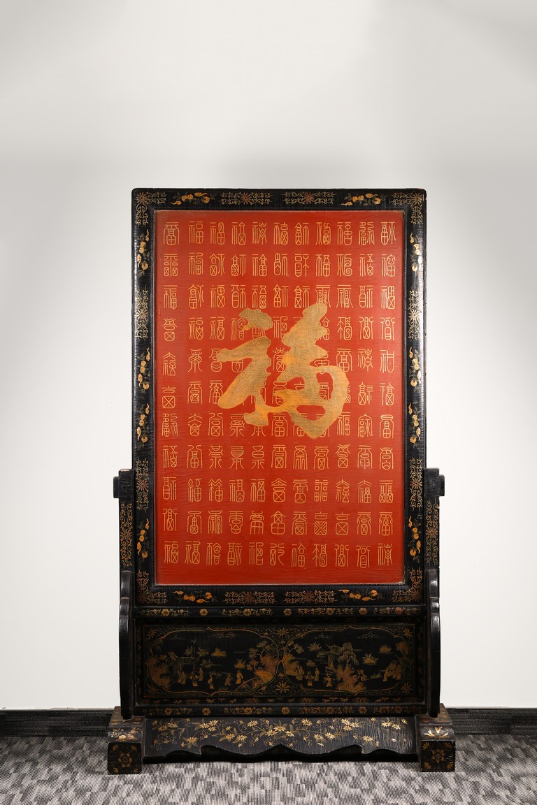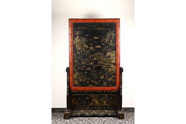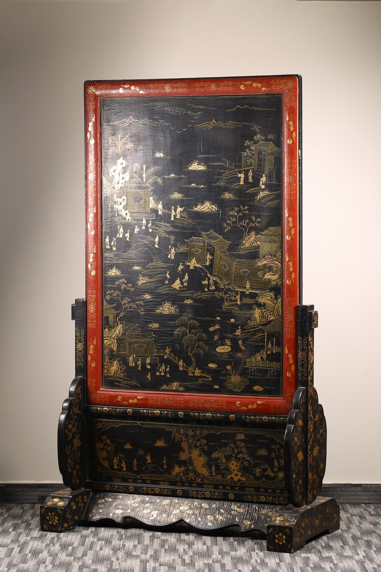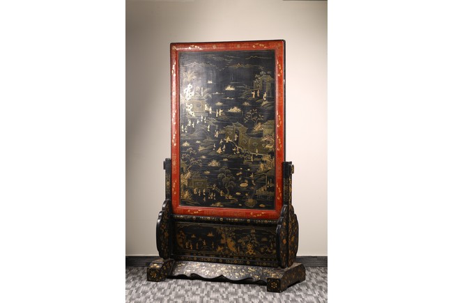 Qing Dynasty period. Of rectangular form, the panel painted in gilt with numerous 'fu' (joy) characters written in different styles against the red lacquered ground, the reverse painted in gilt with a riverscape scene with figures, pavillions, gardens on both sides of river against black lacquered ground, the stand decorated with similar scenes.