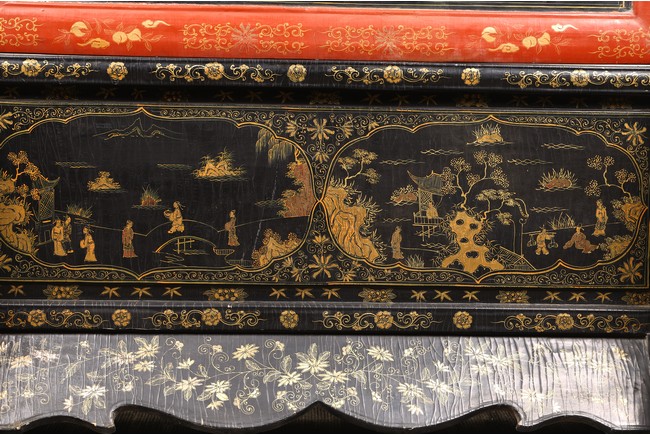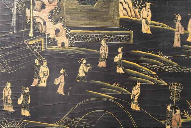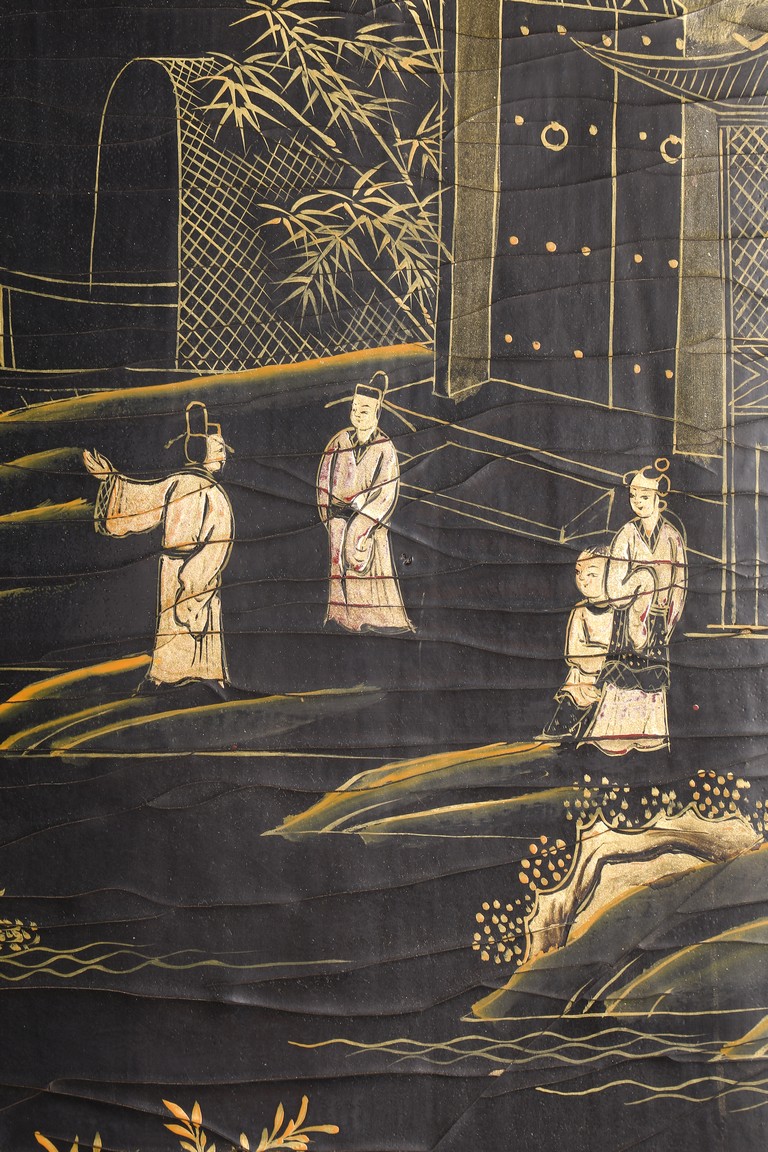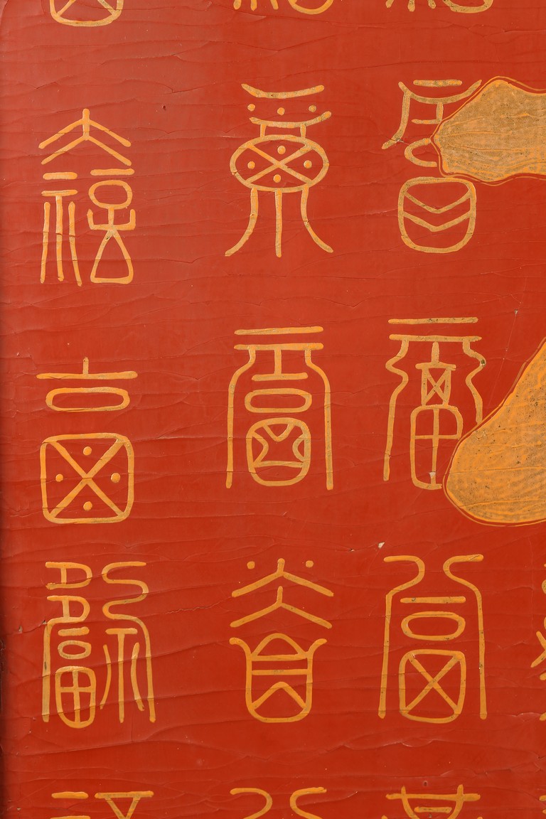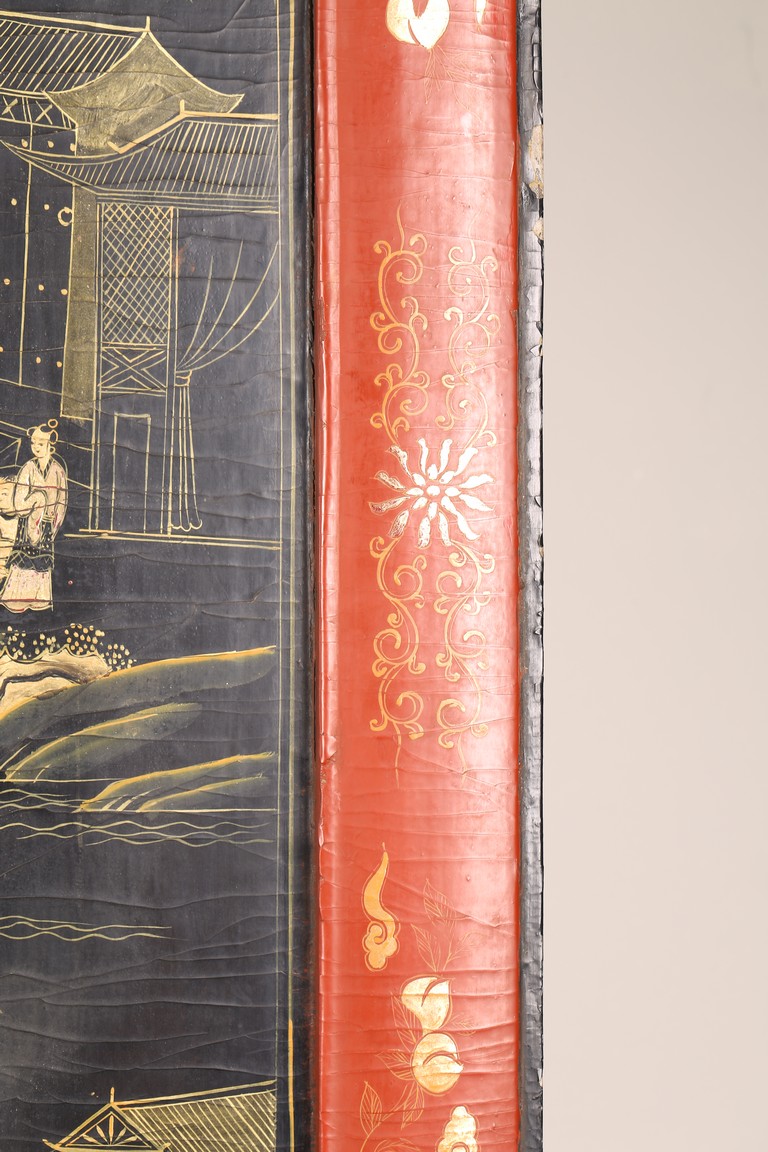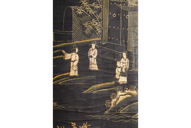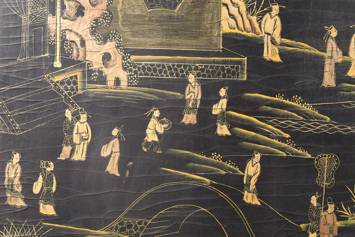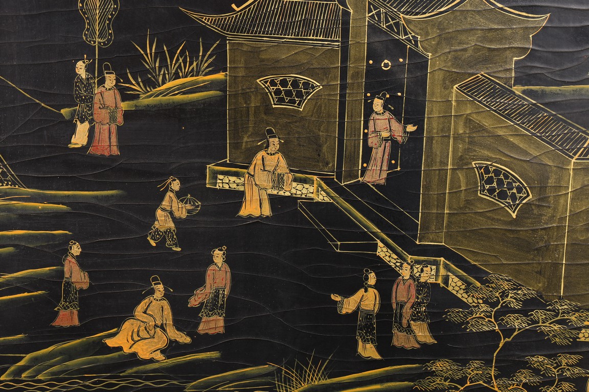 Qing Dynasty period. Of rectangular form, the panel painted in gilt with numerous 'fu' (joy) characters written in different styles against the red lacquered ground, the reverse painted in gilt with a riverscape scene with figures, pavillions, gardens on both sides of river against black lacquered ground, the stand decorated with similar scenes.