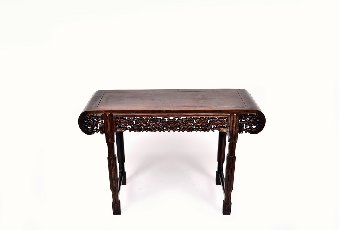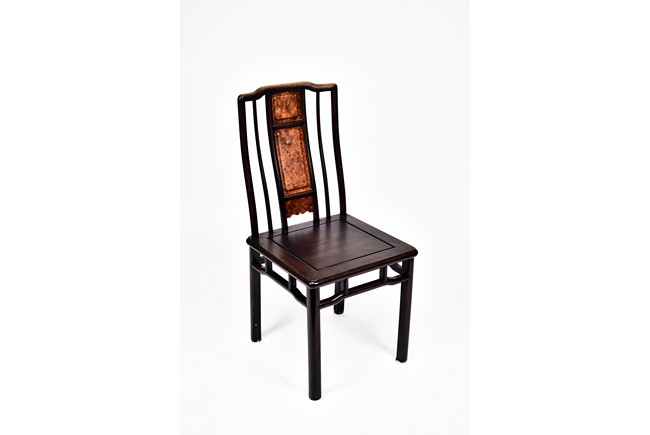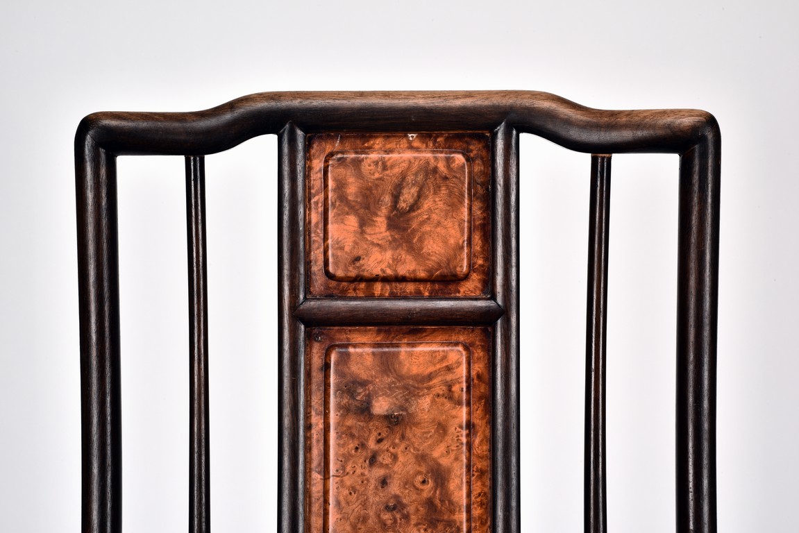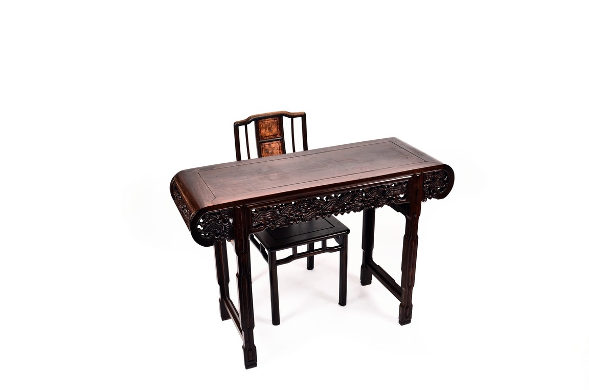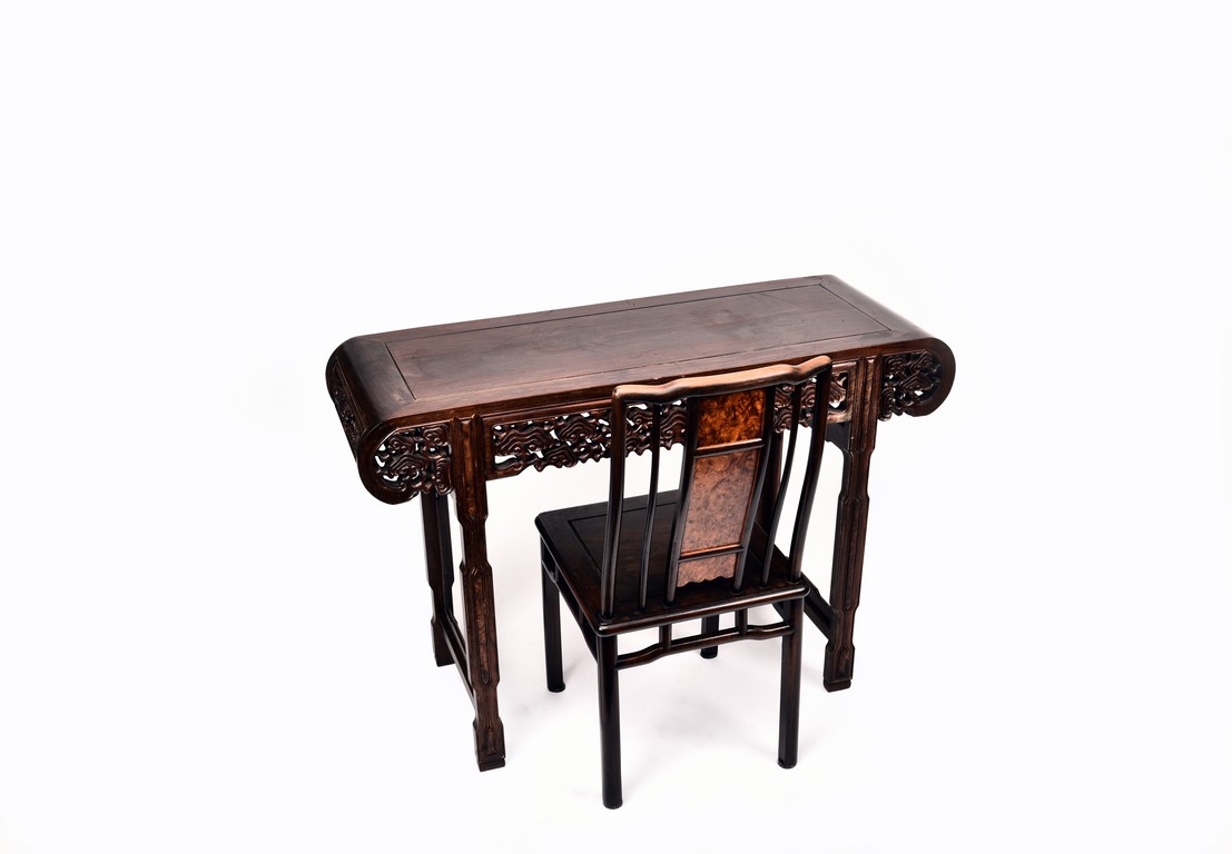 Qing Dynasty period. Including an altar table set with rectangular top above reticulated aprons carved with ruyi-shaped scrolls, terminating at rectangular section legs joined by stretchers; and a side chair with curved top rail fitted with corner posts of round section, with three burl wood panels backsplat, above the single panel wood seats set within the rectangular frame, supported at the front by separately carved front rails joined apron with double vertical posts, terminating at round section legs.