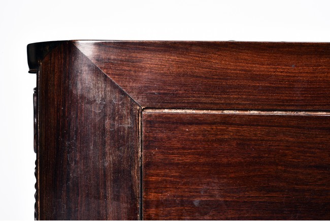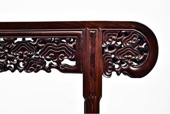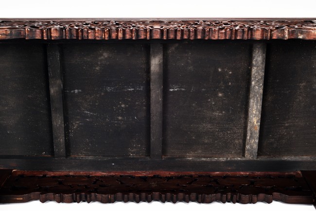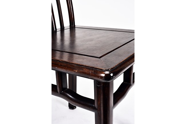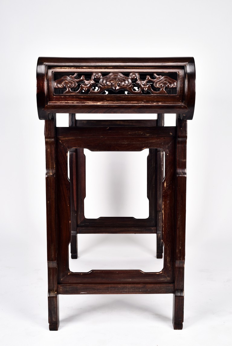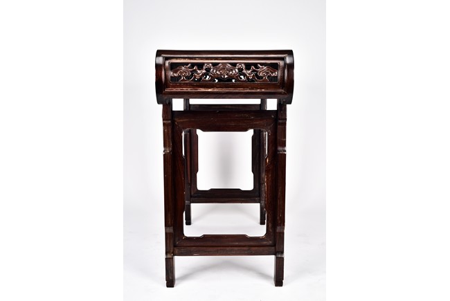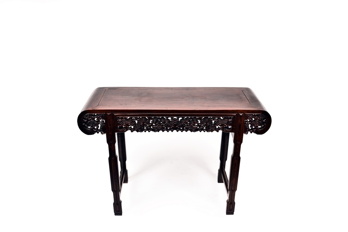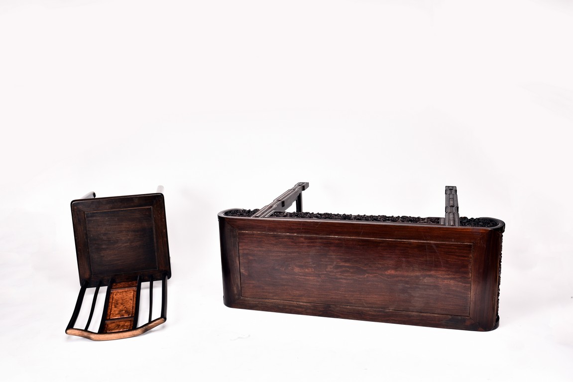 Qing Dynasty period. Including an altar table set with rectangular top above reticulated aprons carved with ruyi-shaped scrolls, terminating at rectangular section legs joined by stretchers; and a side chair with curved top rail fitted with corner posts of round section, with three burl wood panels backsplat, above the single panel wood seats set within the rectangular frame, supported at the front by separately carved front rails joined apron with double vertical posts, terminating at round section legs.