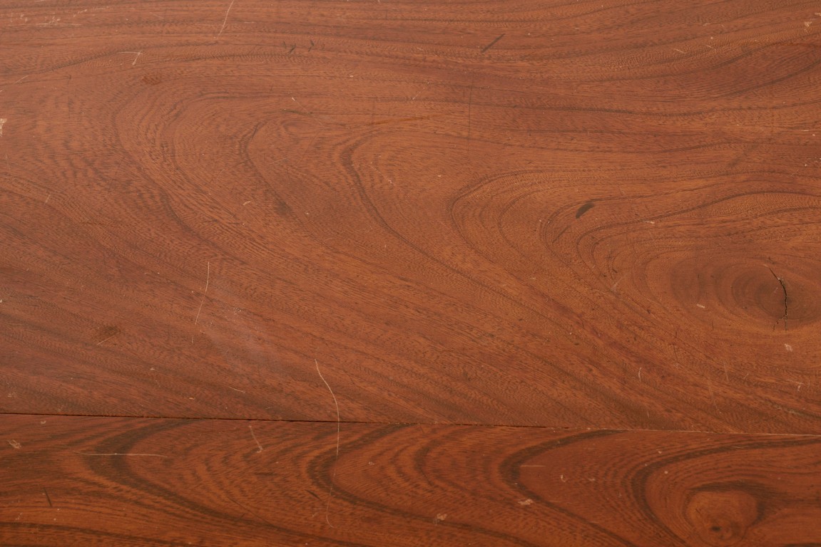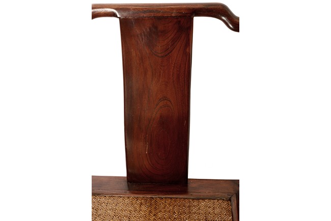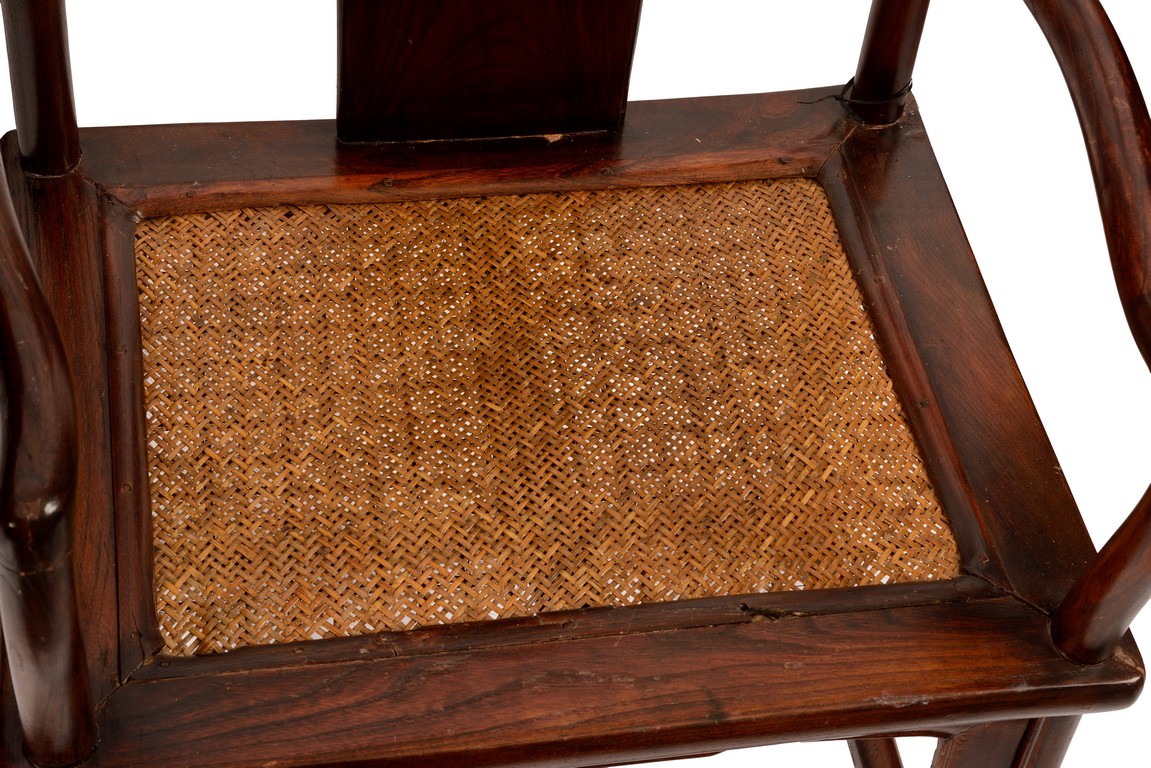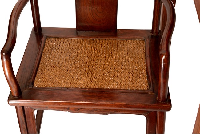 Republic period. The furniture includes an elmwood table and two elmwood chairs. The table has a square table top, stands on four straight hoof legs. The chairs with curved armrests, slightly S shaped backrest. All with natural wood color and grain.