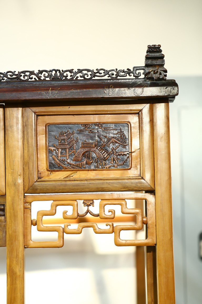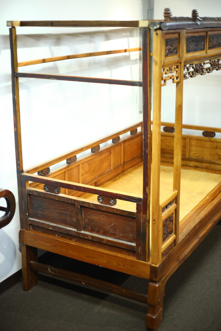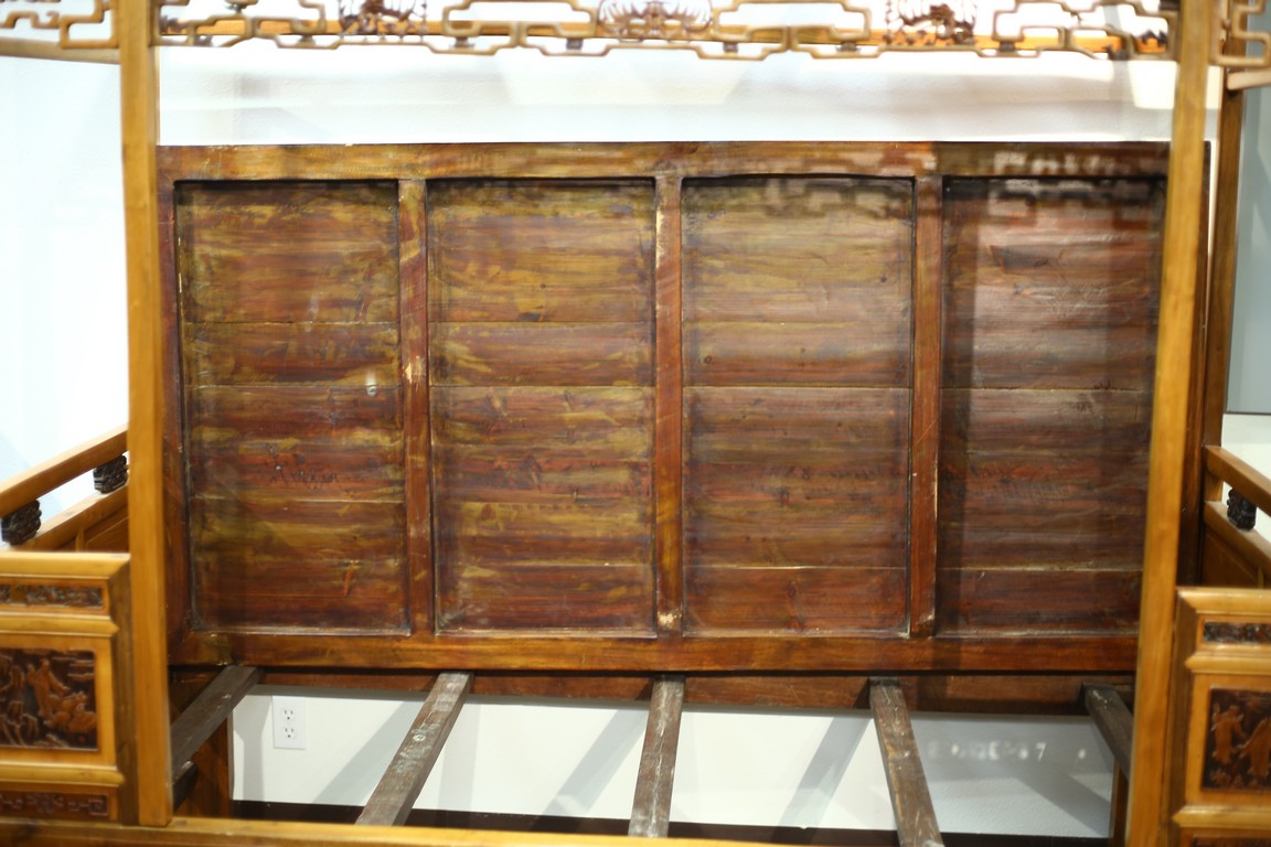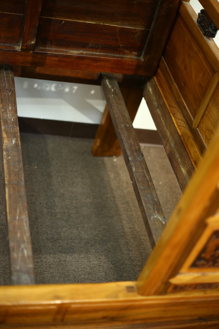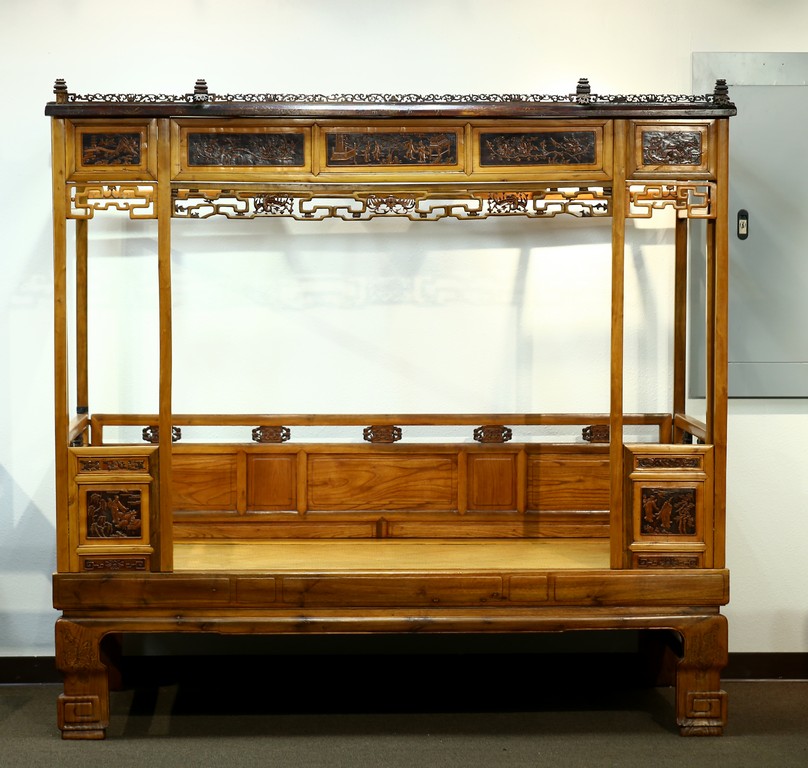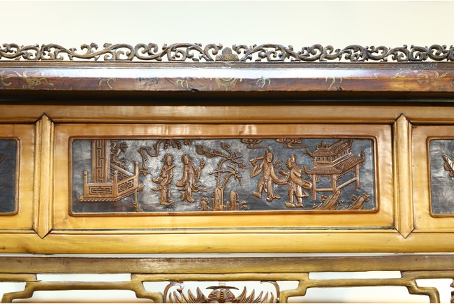 Supported on four thick scroll feet carved with chilong in relief, the front railing carved in relief with story scene of figures in landscape setting, the canopy supported on six posts with four at the corners and two set in at the front, all below a canopy with three five solid front panels carved with flower and landscape scenes. Qing Dynasty period.