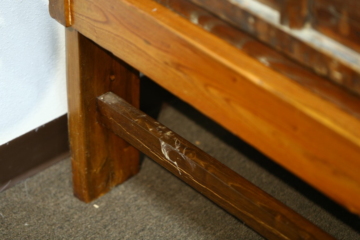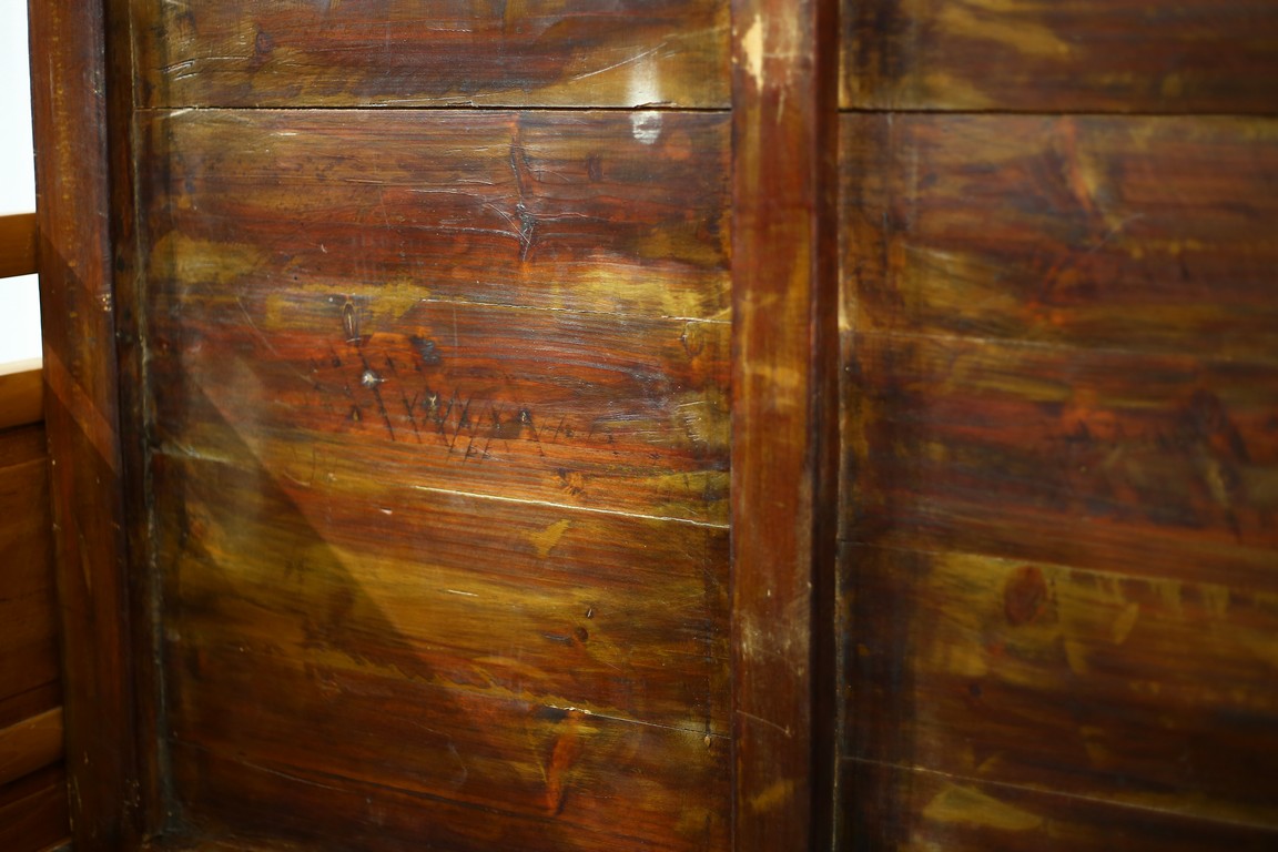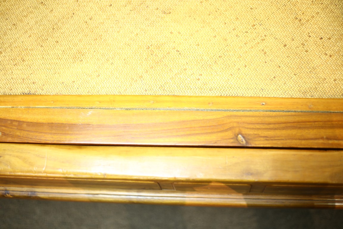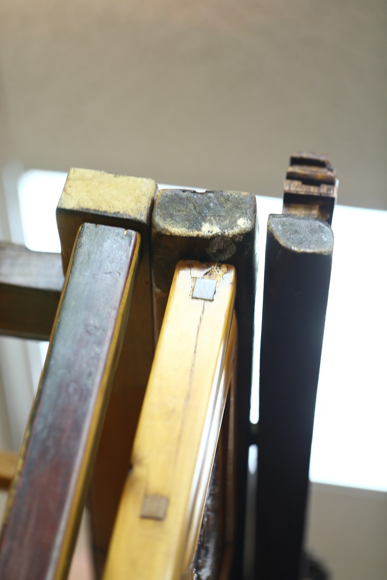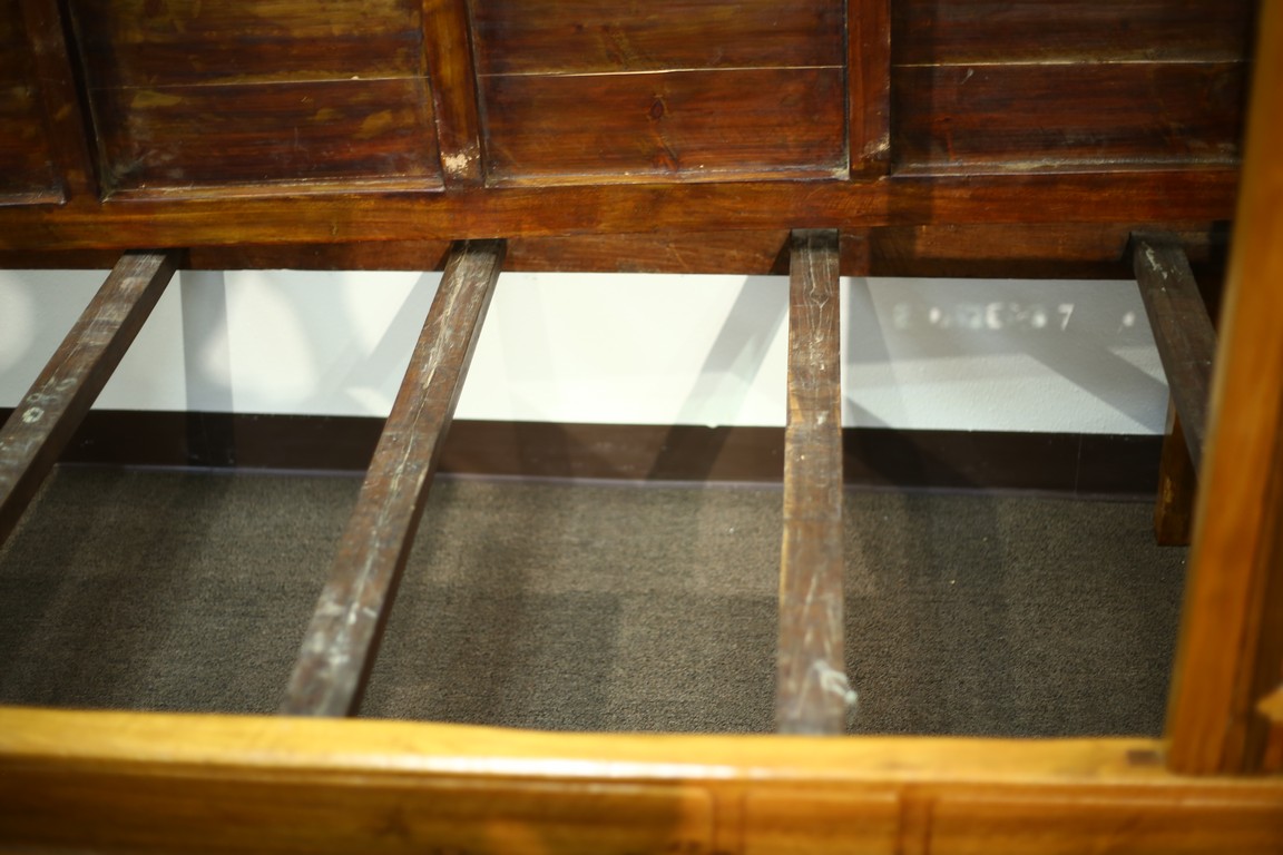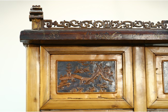 Supported on four thick scroll feet carved with chilong in relief, the front railing carved in relief with story scene of figures in landscape setting, the canopy supported on six posts with four at the corners and two set in at the front, all below a canopy with three five solid front panels carved with flower and landscape scenes. Qing Dynasty period.