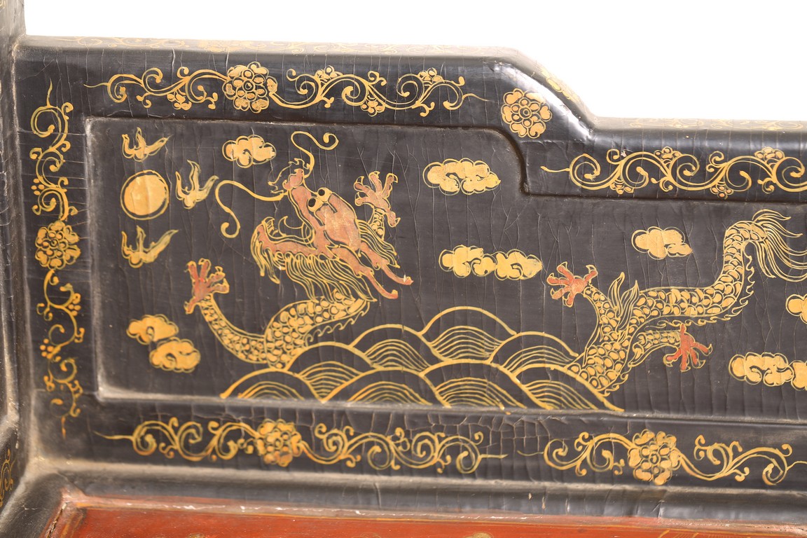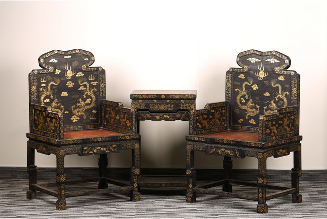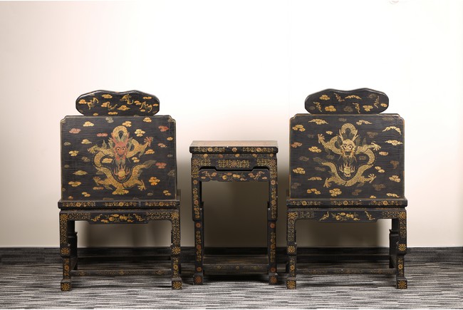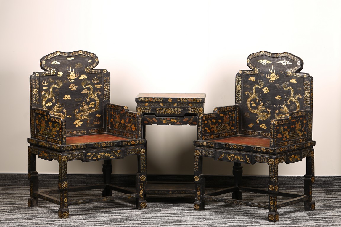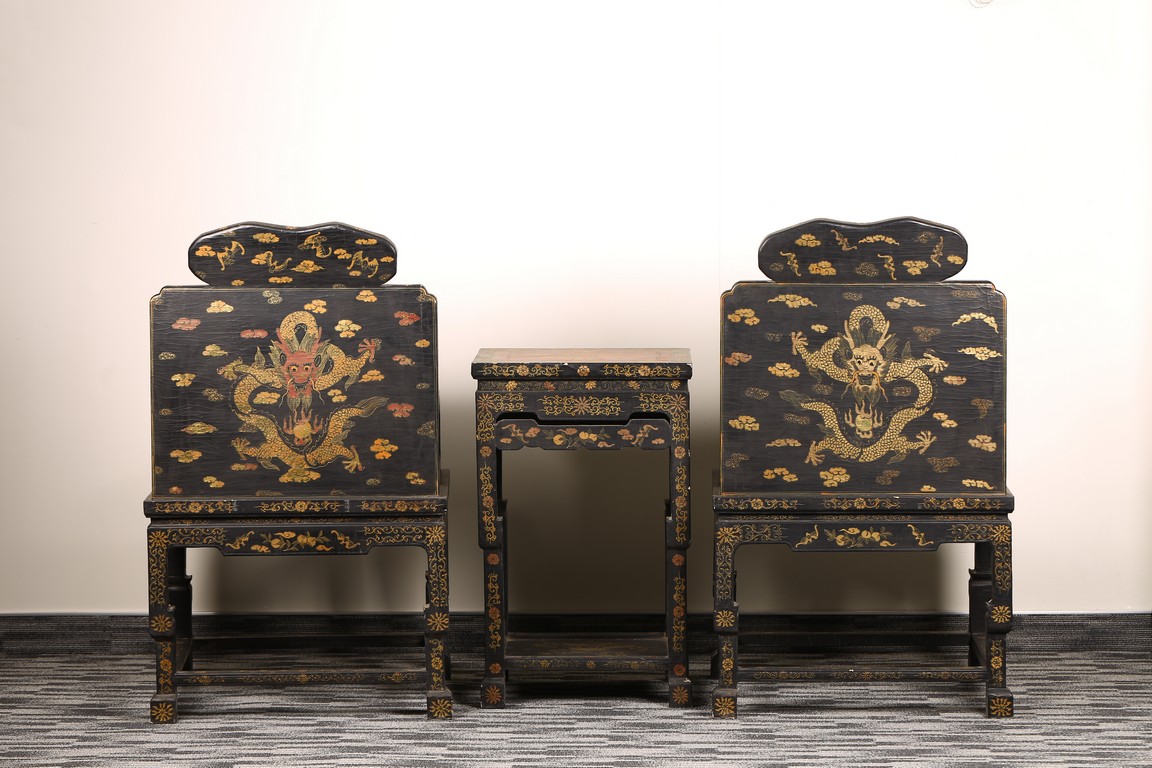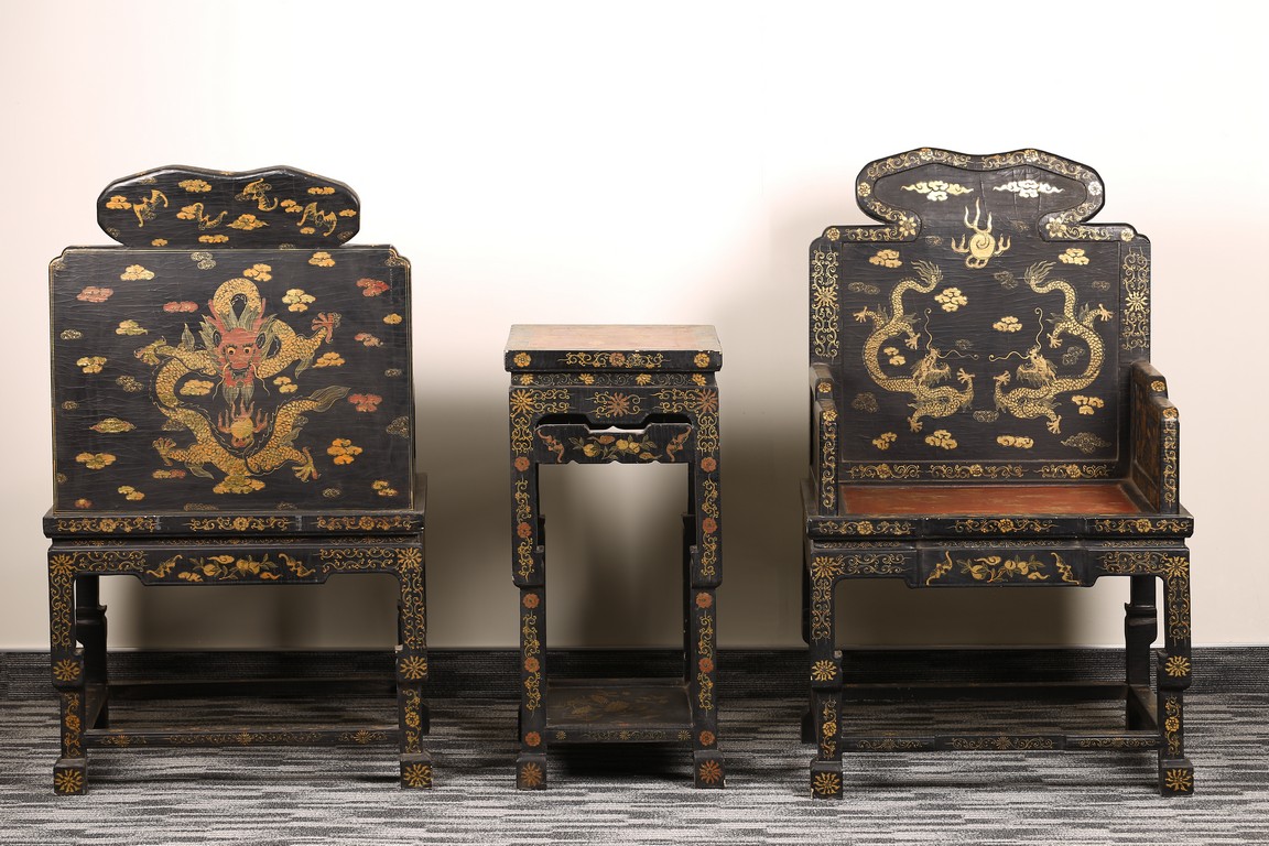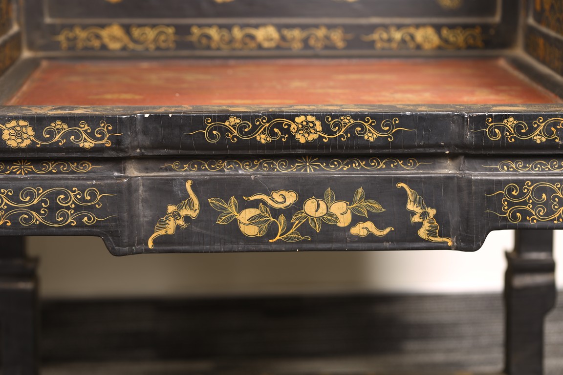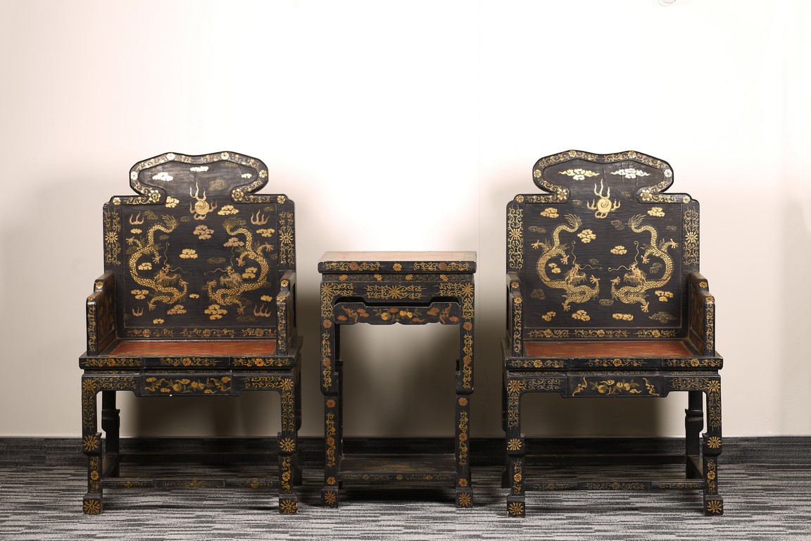 Each wood chair gilt painted with a pair of dragons chasing flaming pearl on the back panel, the seat decorated with dragon against red lacquer ground, the feet and apron all painted with foliage scrolls, accompanied with a stand painted with similar decorations.