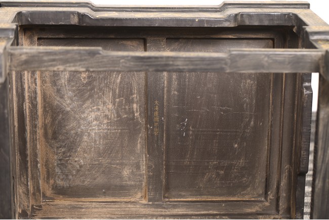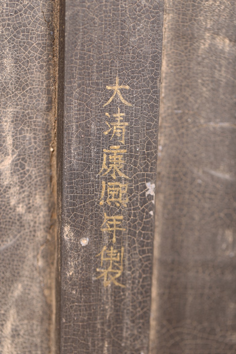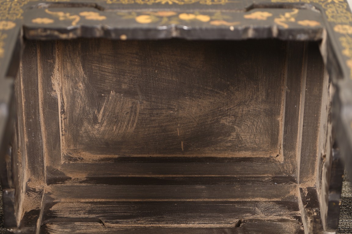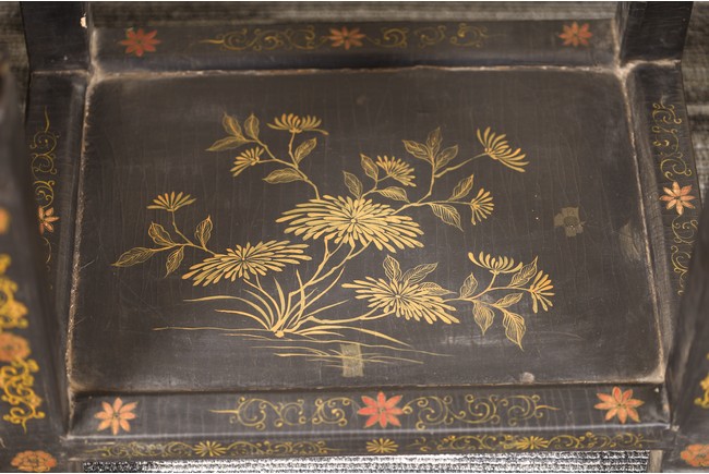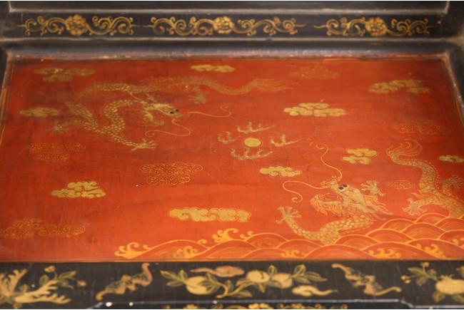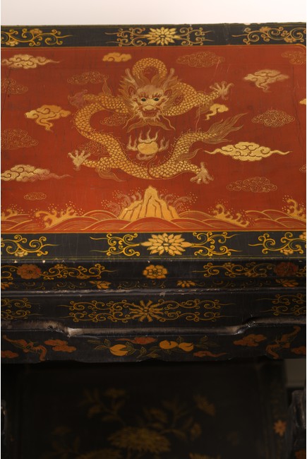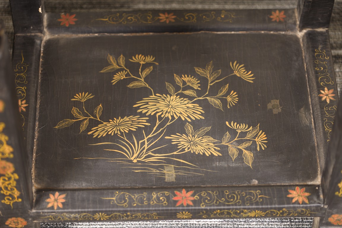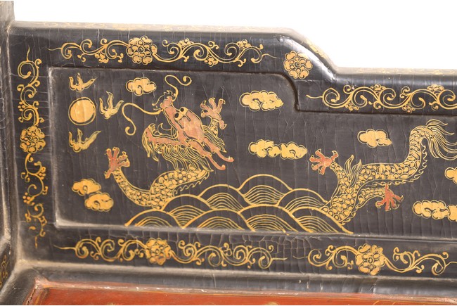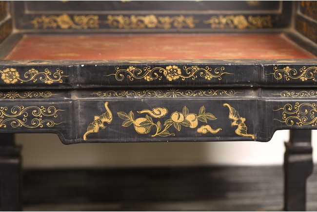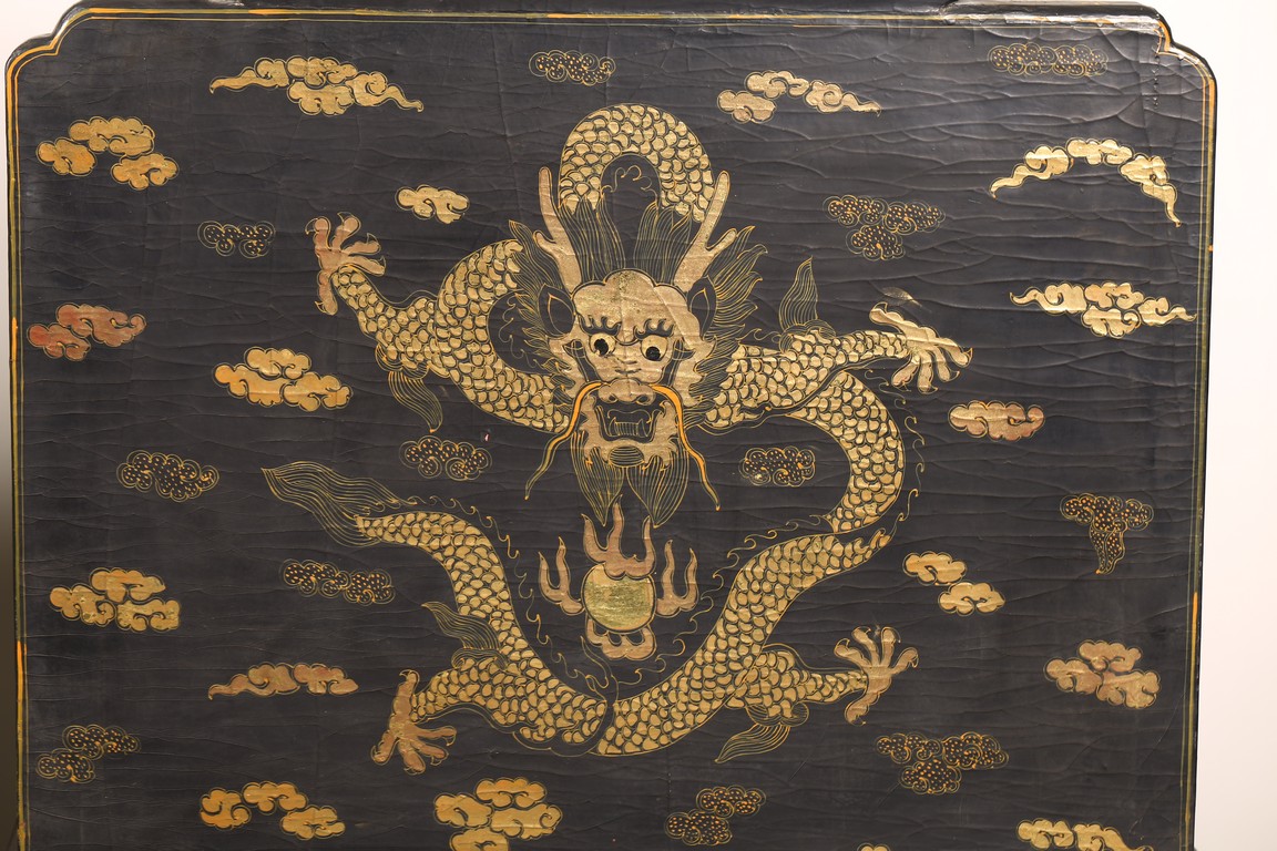 Each wood chair gilt painted with a pair of dragons chasing flaming pearl on the back panel, the seat decorated with dragon against red lacquer ground, the feet and apron all painted with foliage scrolls, accompanied with a stand painted with similar decorations.