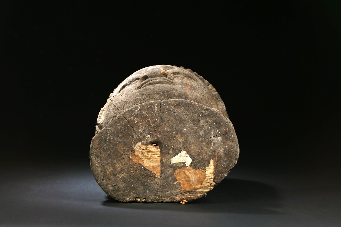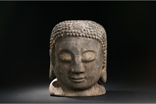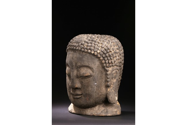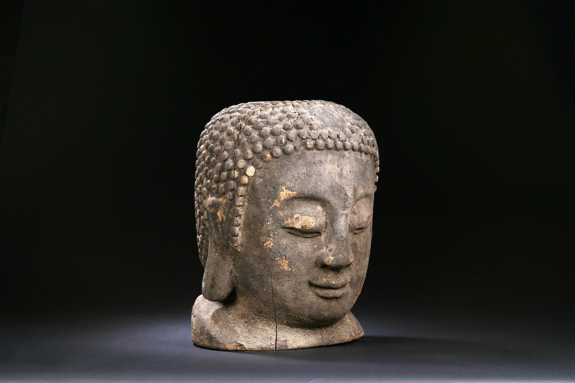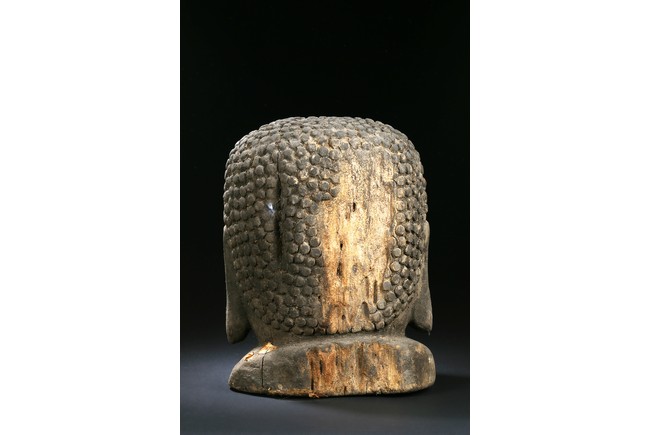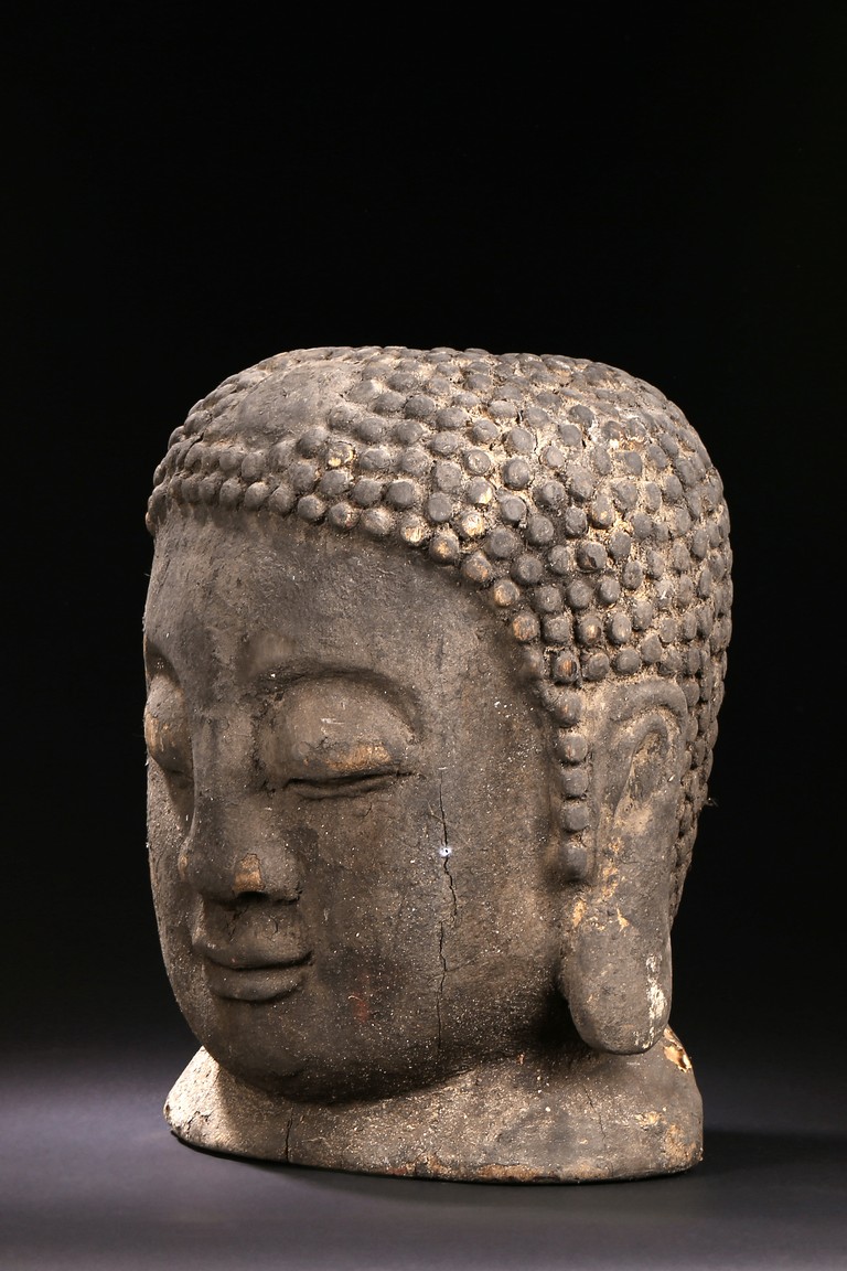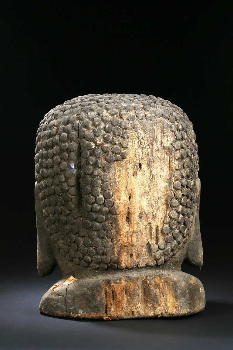 The wood buddha head shown with serene expression, the face flanked by a pair of long pendulous earlobes, hair covered with tight curls.