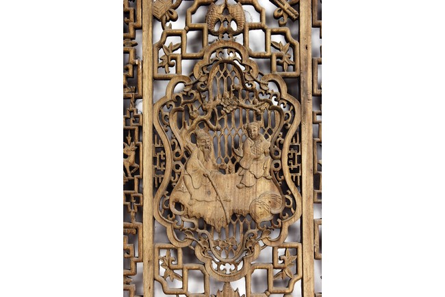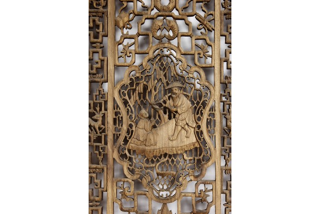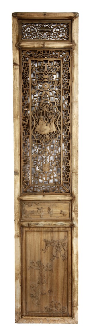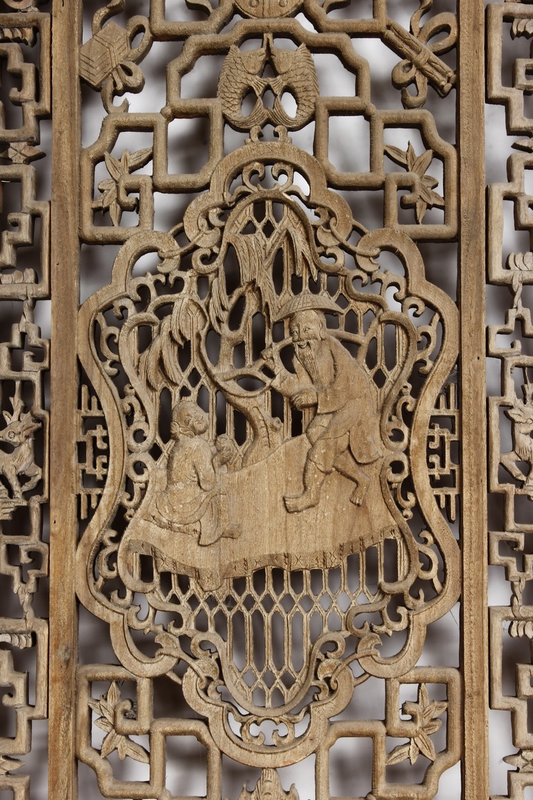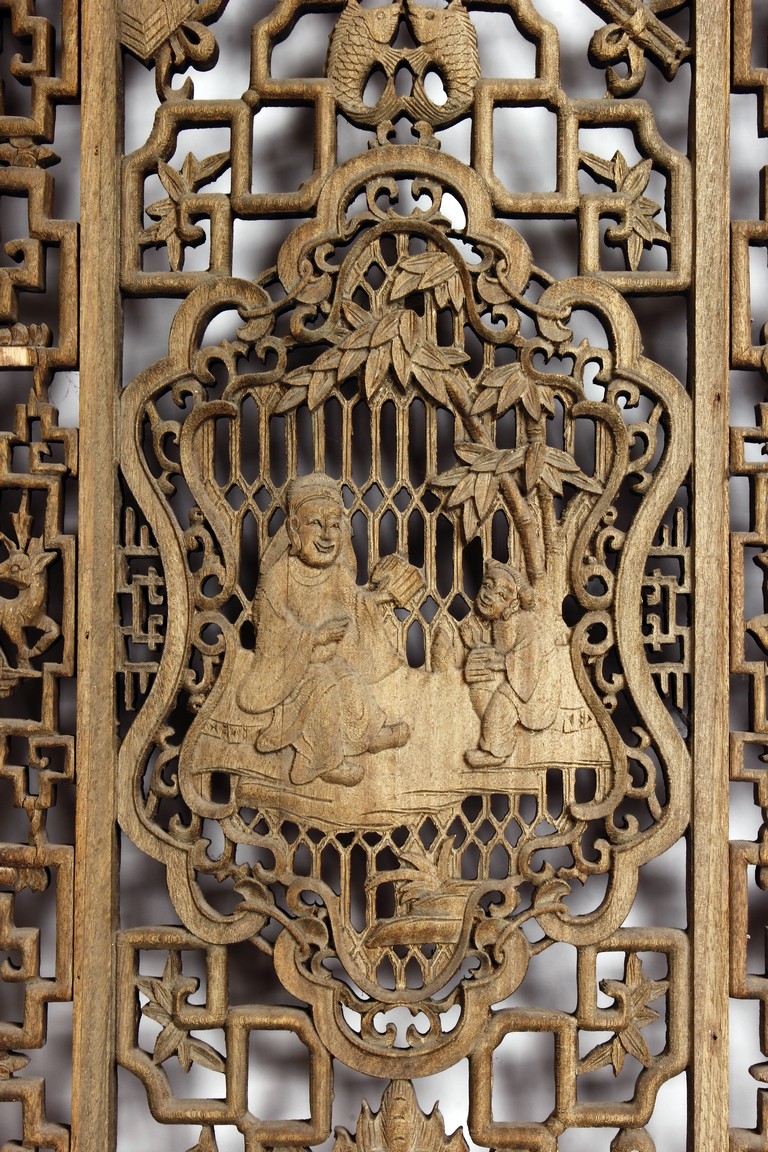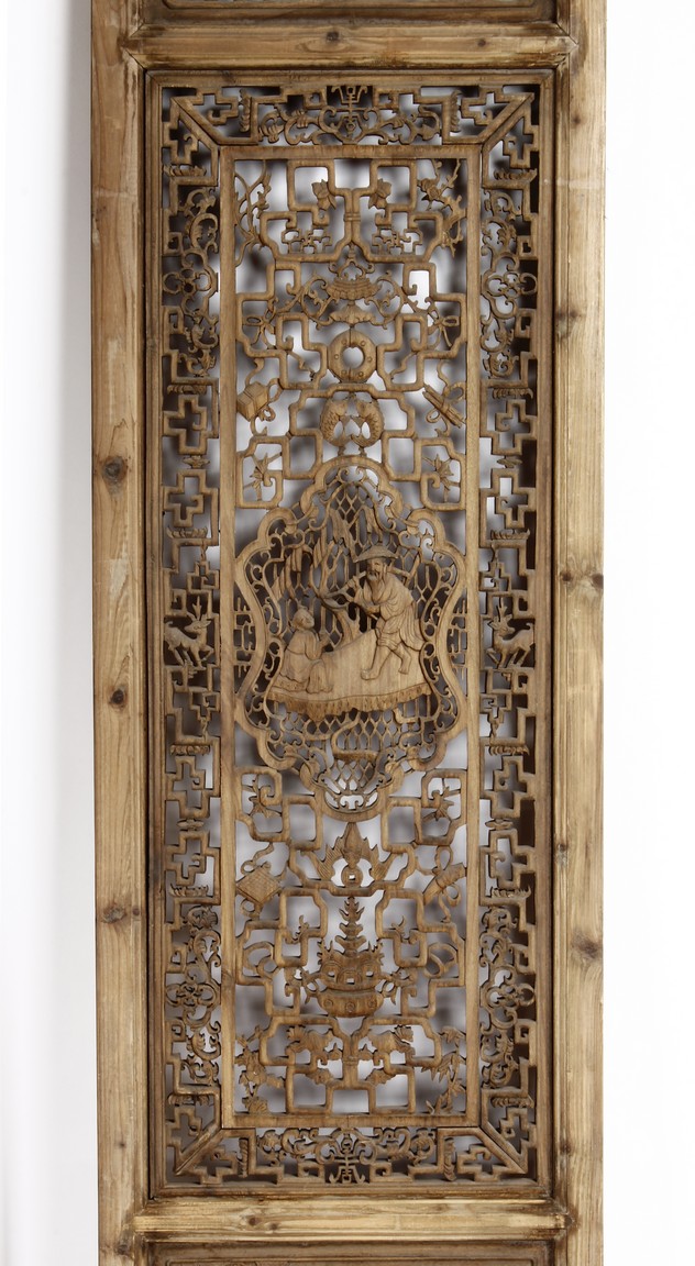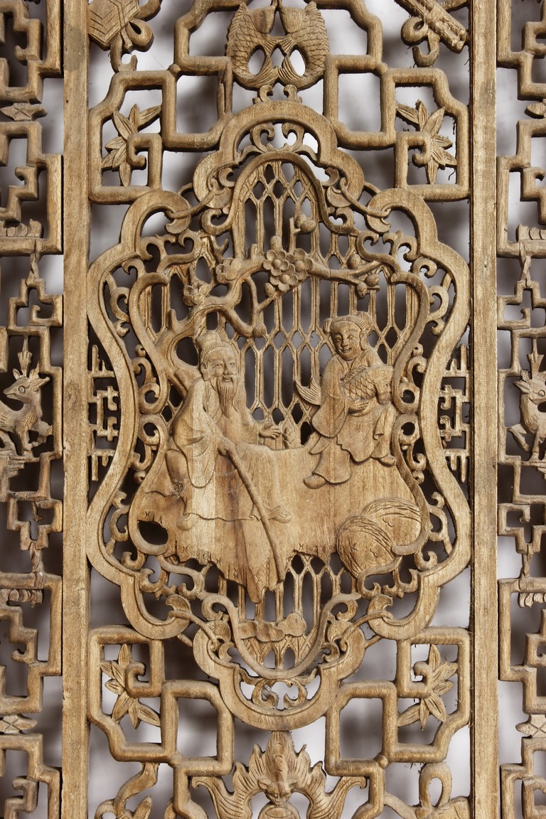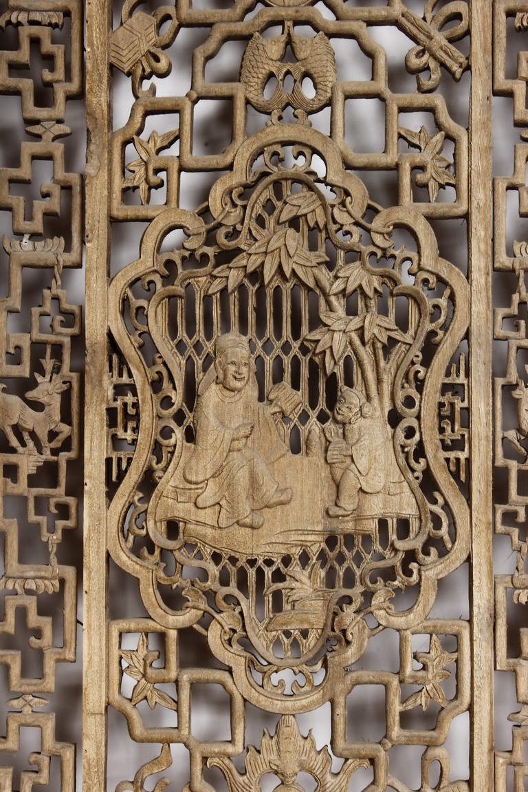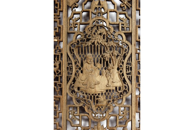 Each of rectangular form, the upper panel carved and pierced with intricate patterns and a stylized 'shou' character, the middle section elegantly pierced with figures flanked by auscpicious motifs and key-fret patterns. The lower section carved in relief with figures from stories.