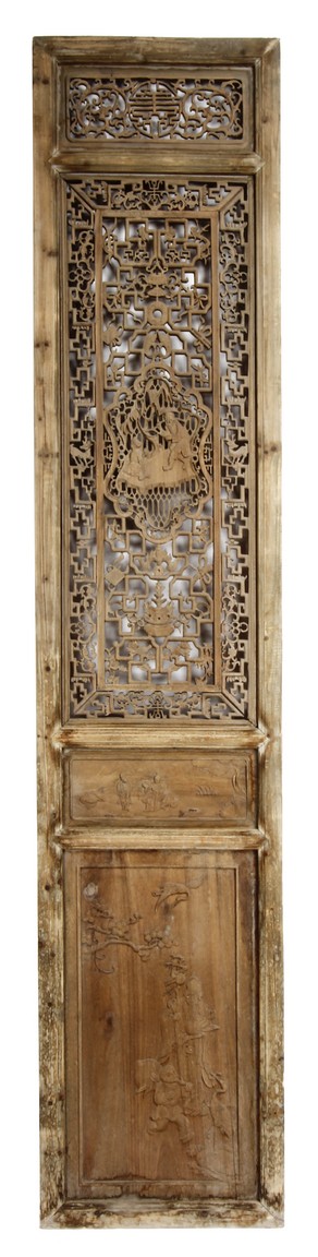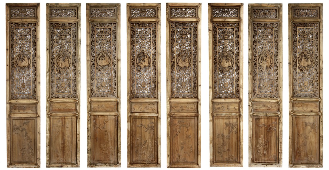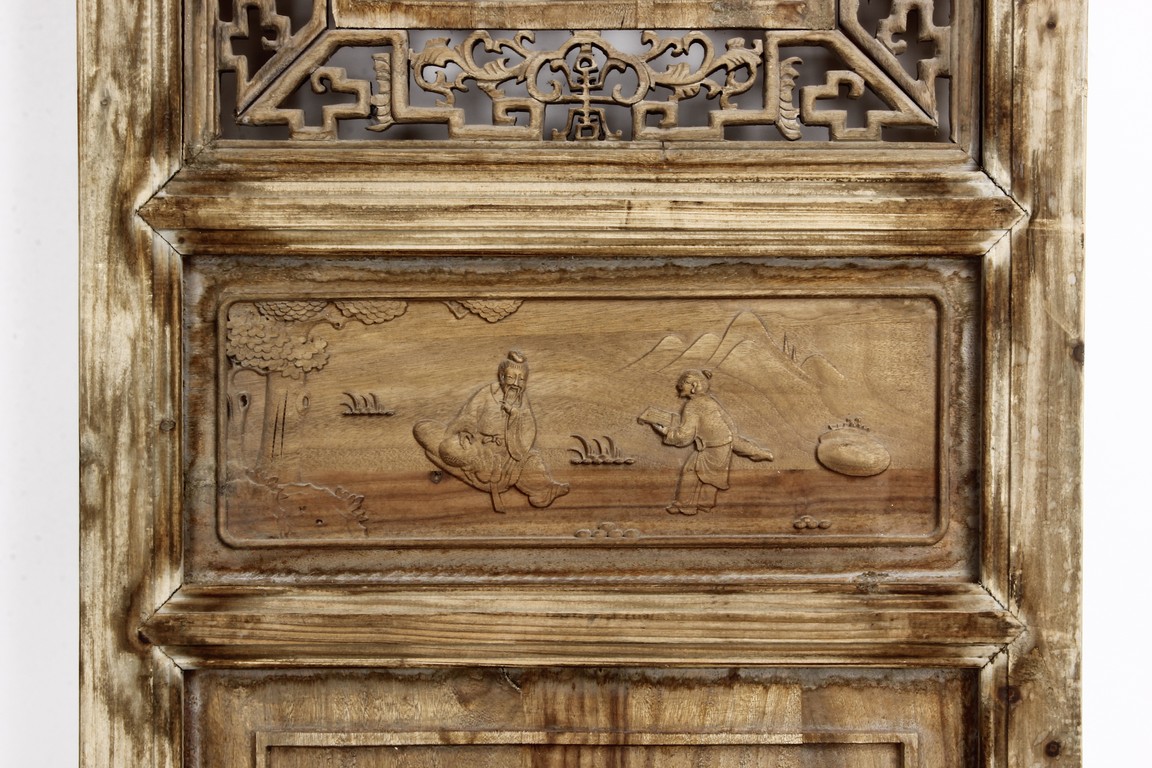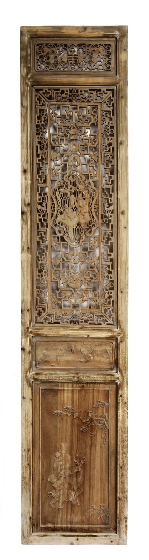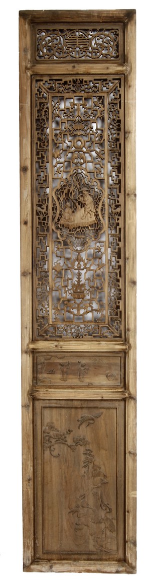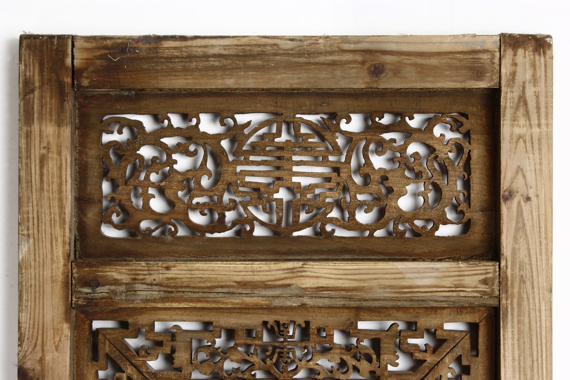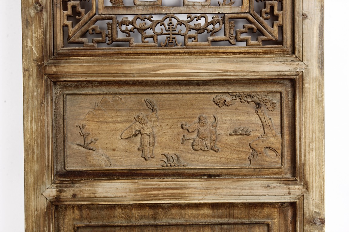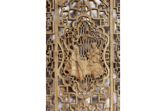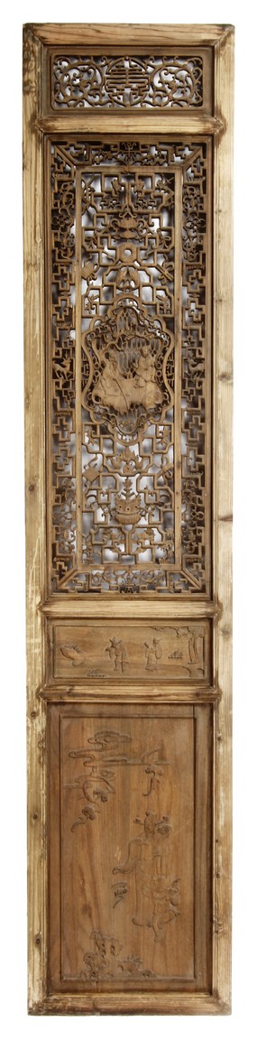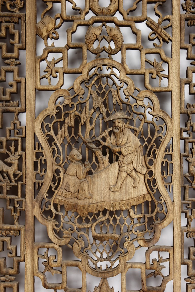 Each of rectangular form, the upper panel carved and pierced with intricate patterns and a stylized 'shou' character, the middle section elegantly pierced with figures flanked by auscpicious motifs and key-fret patterns. The lower section carved in relief with figures from stories.