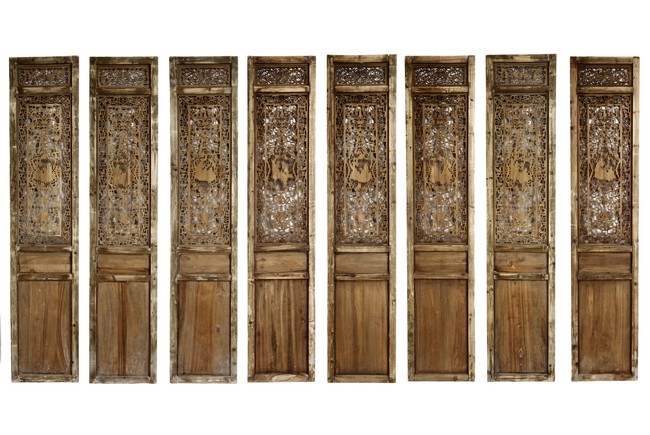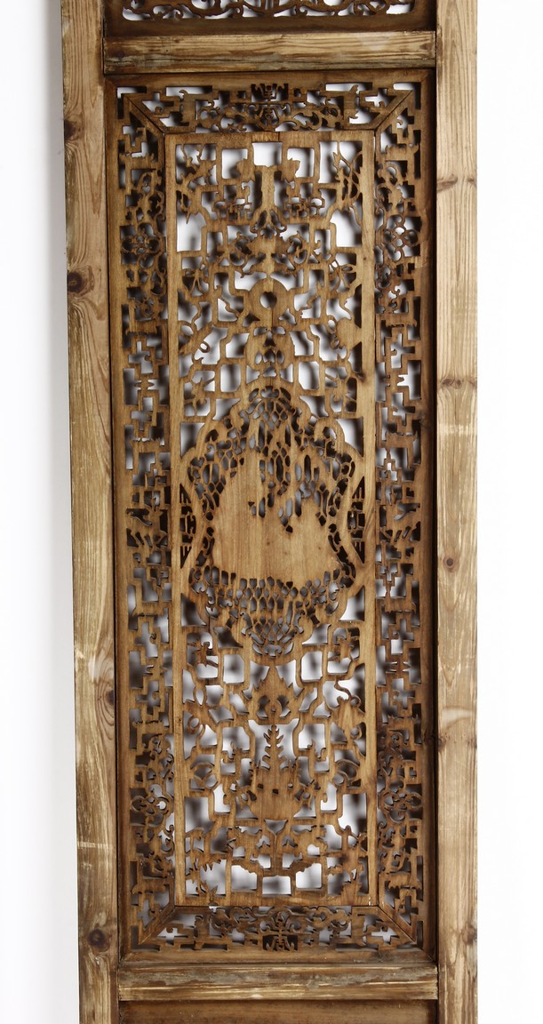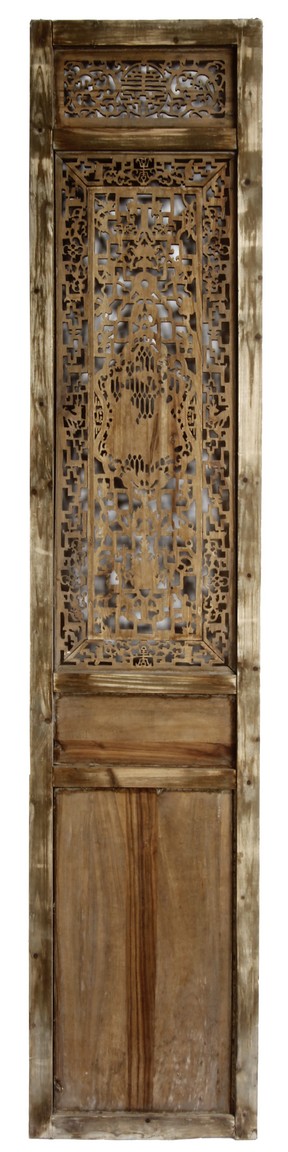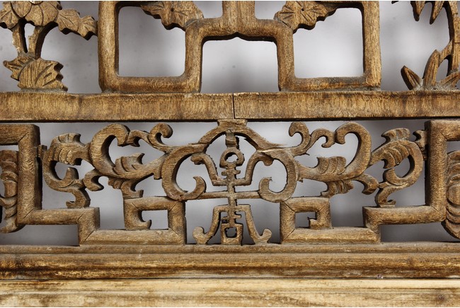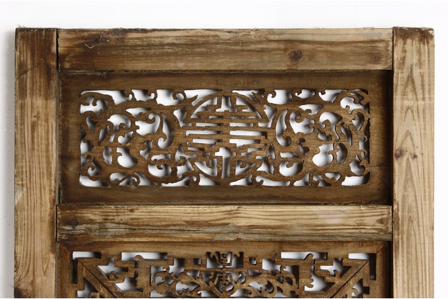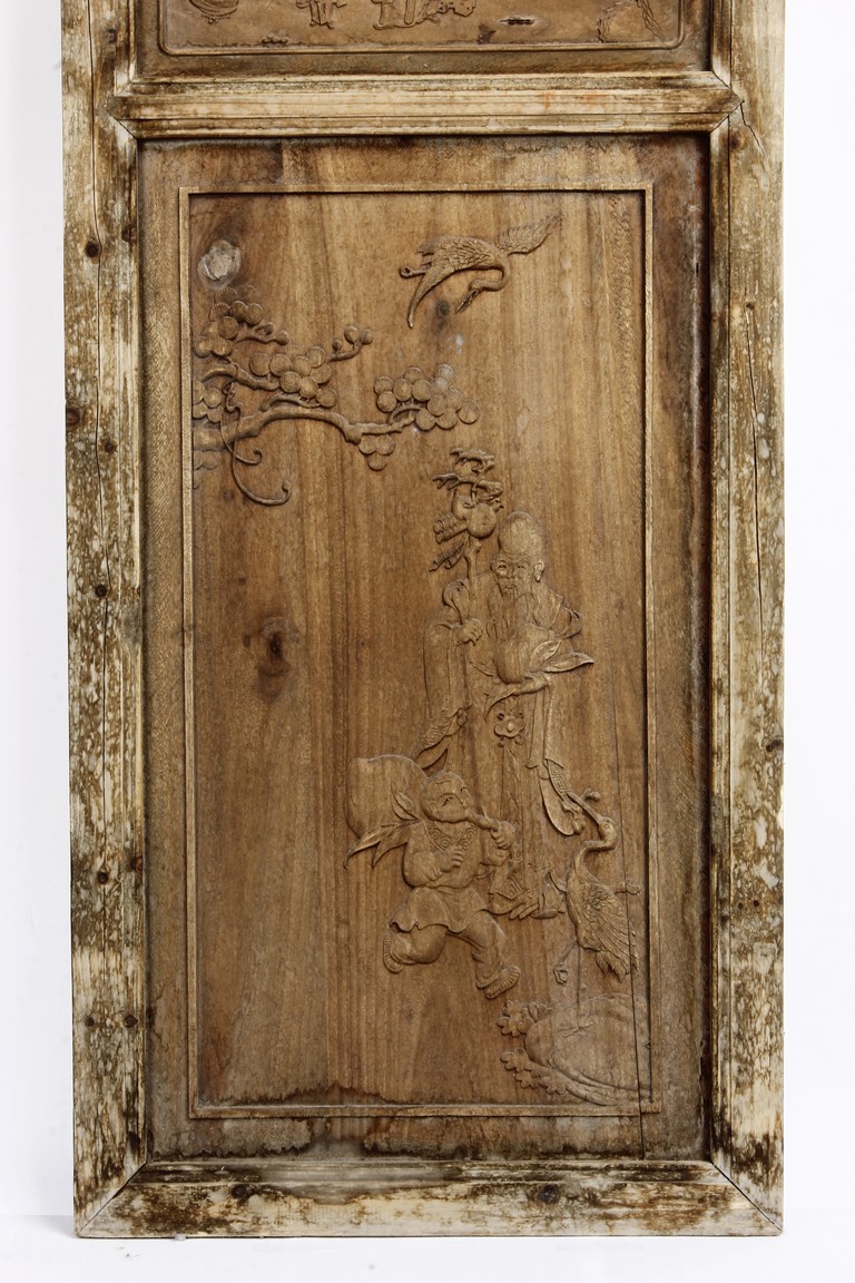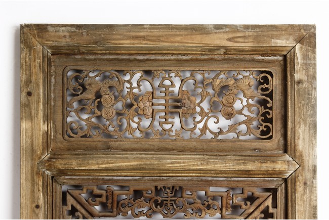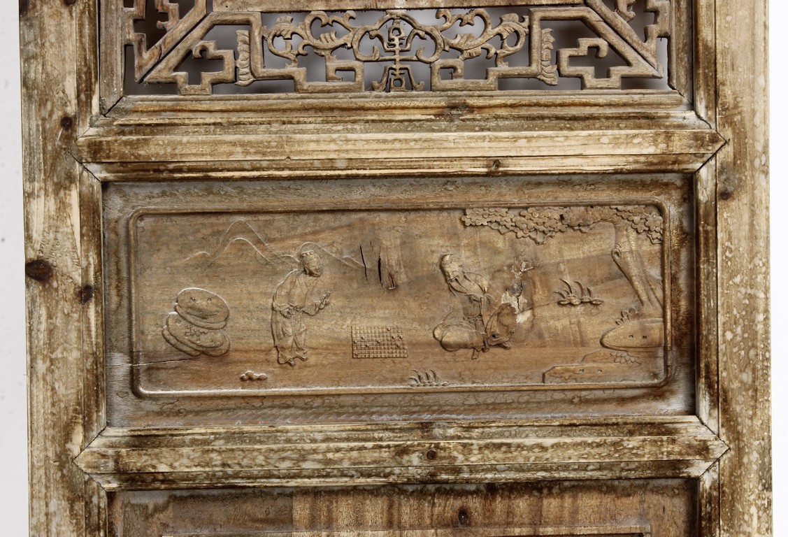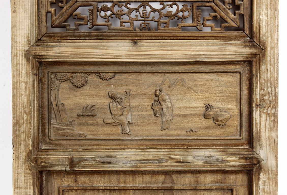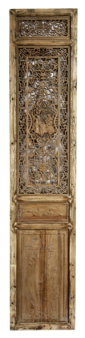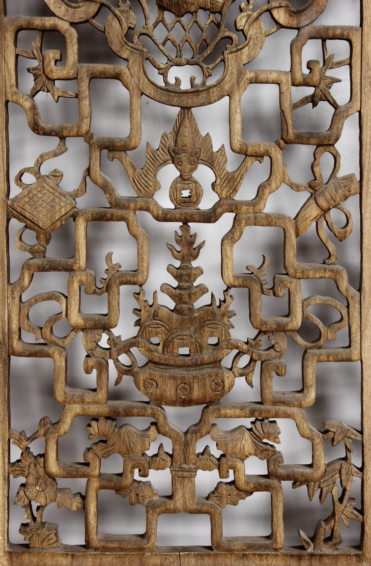 Each of rectangular form, the upper panel carved and pierced with intricate patterns and a stylized 'shou' character, the middle section elegantly pierced with figures flanked by auscpicious motifs and key-fret patterns. The lower section carved in relief with figures from stories.