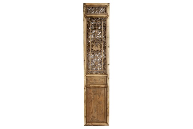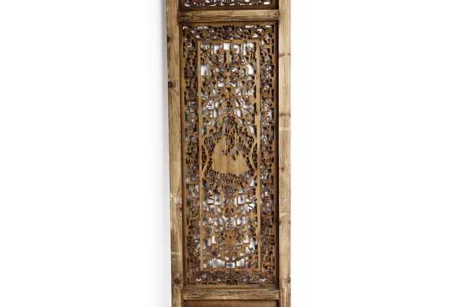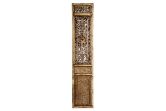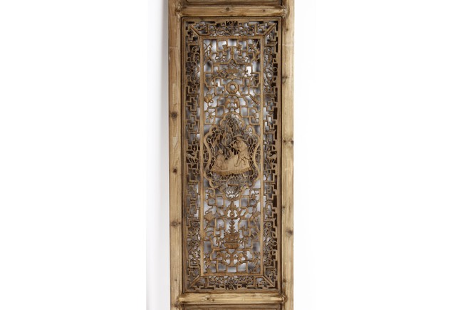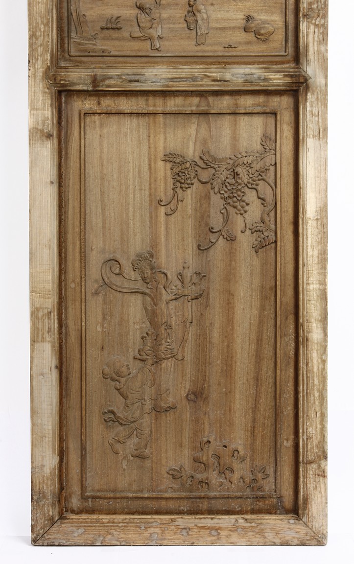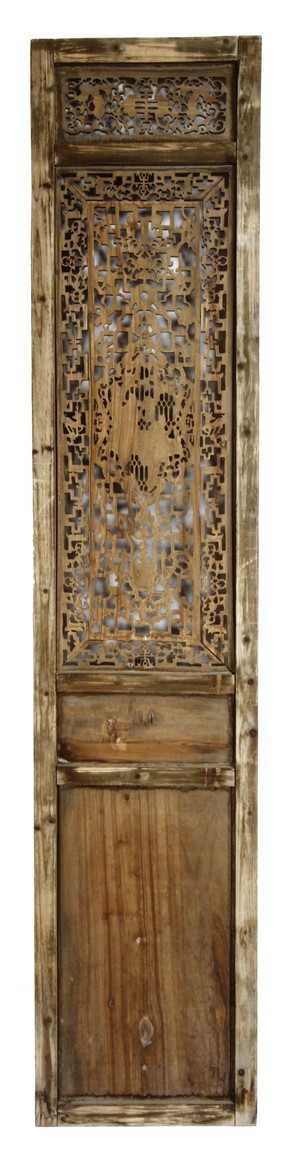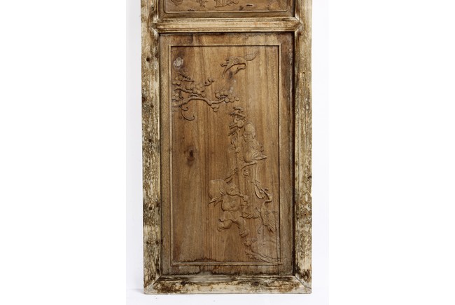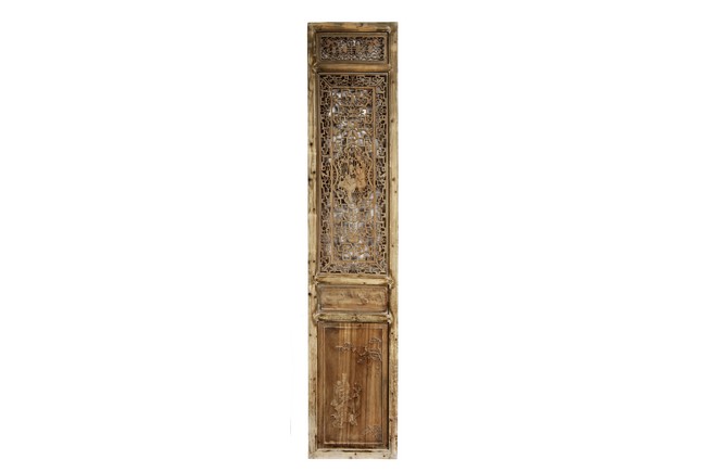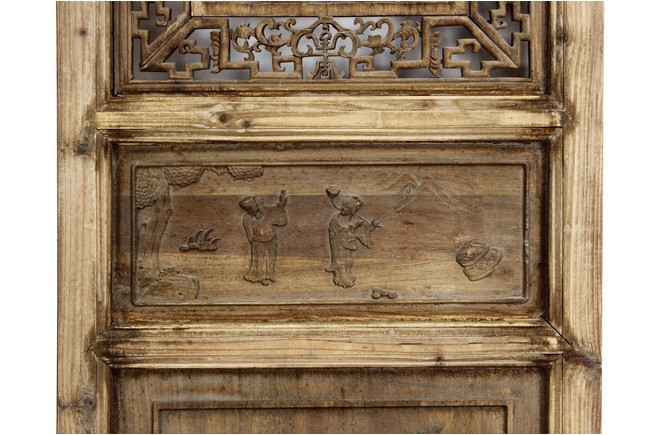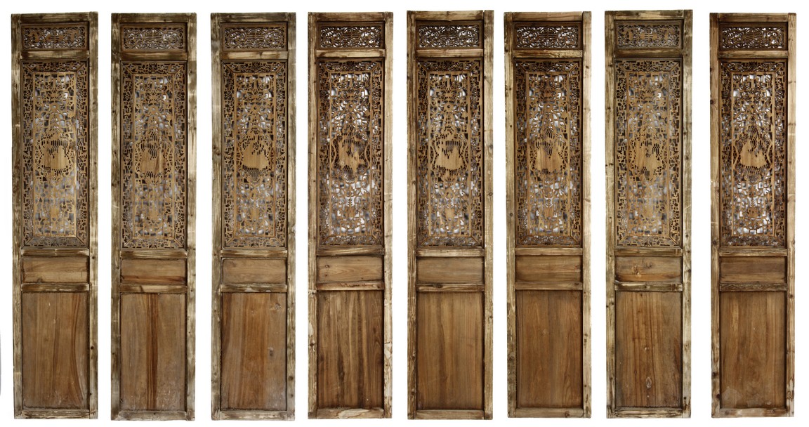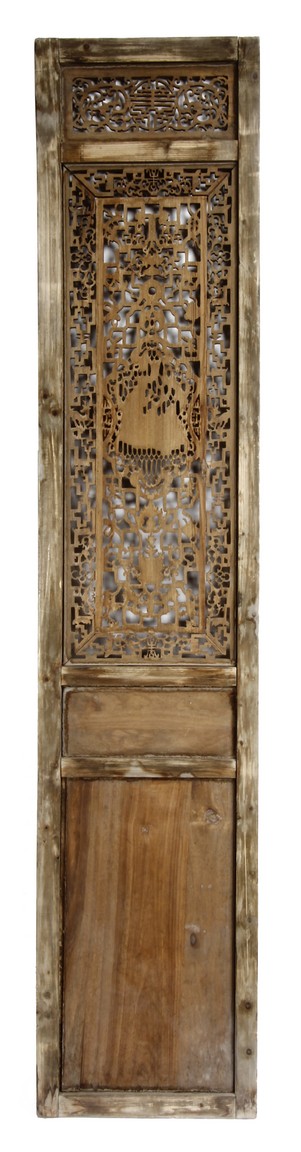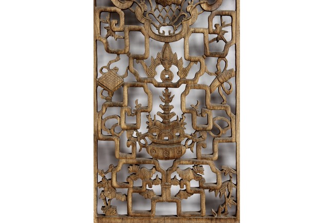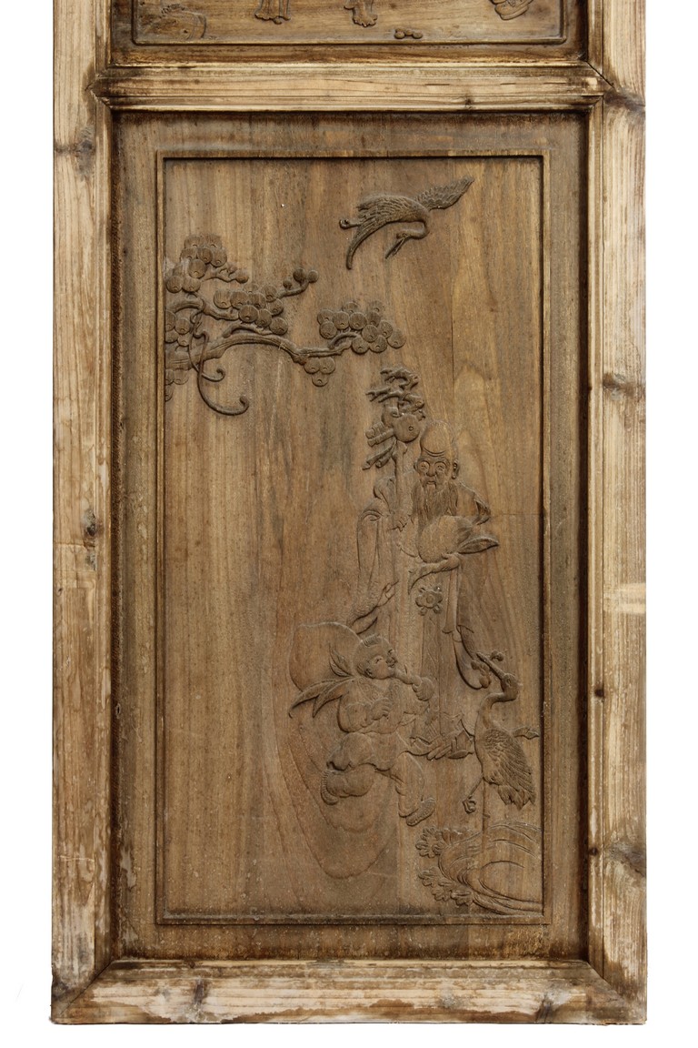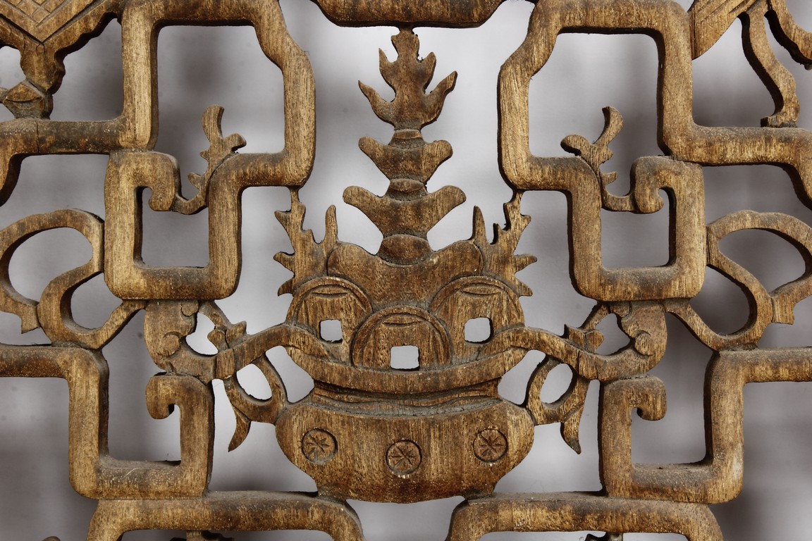 Each of rectangular form, the upper panel carved and pierced with intricate patterns and a stylized 'shou' character, the middle section elegantly pierced with figures flanked by auscpicious motifs and key-fret patterns. The lower section carved in relief with figures from stories.