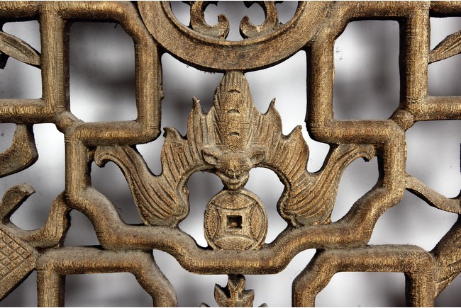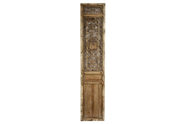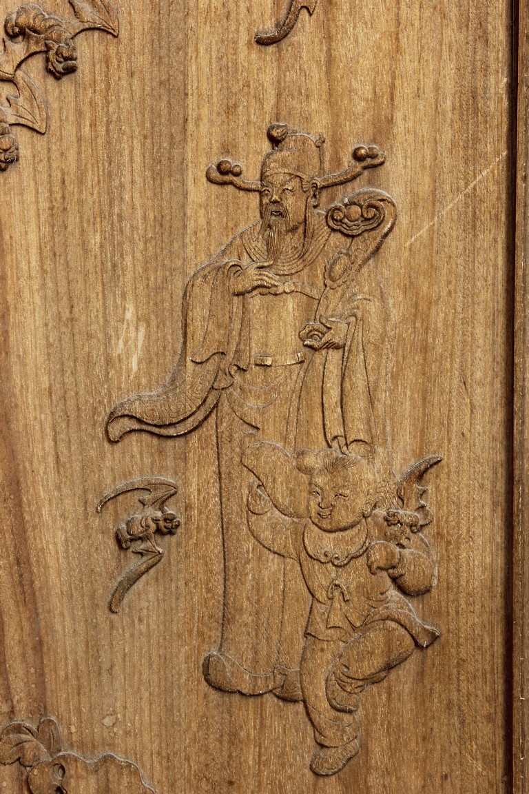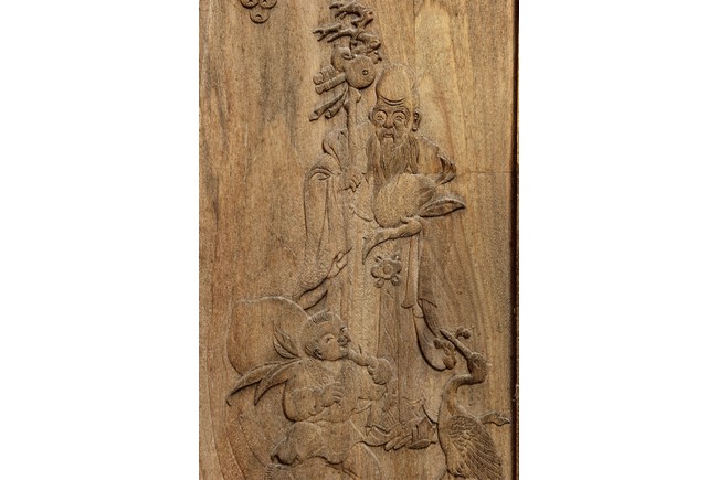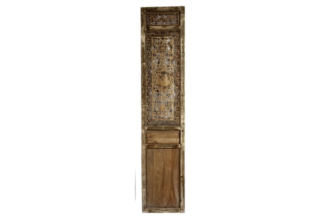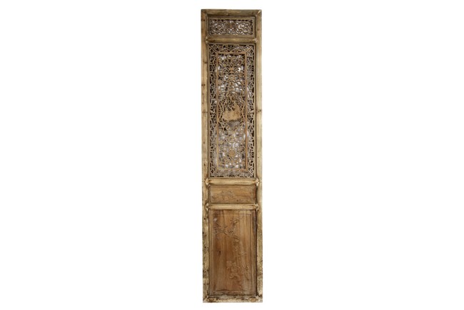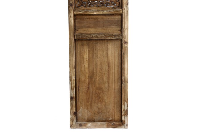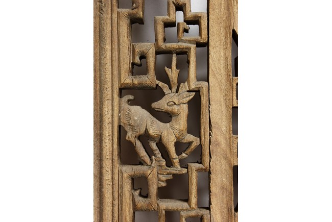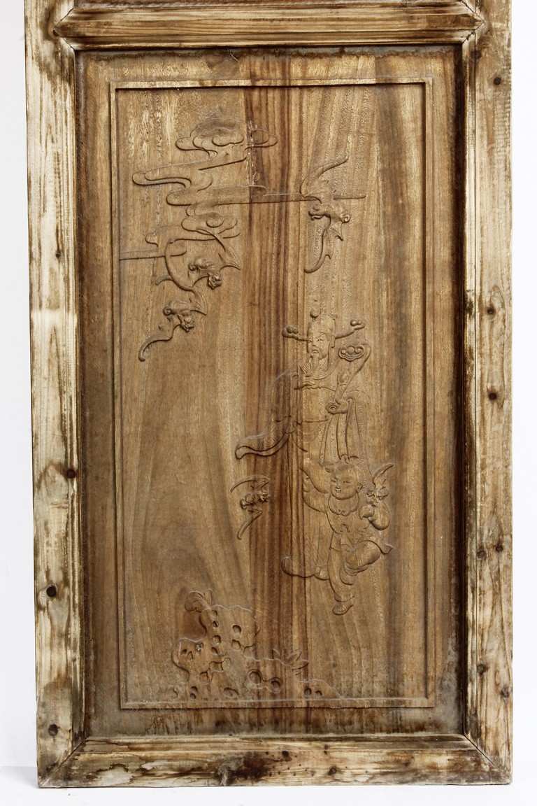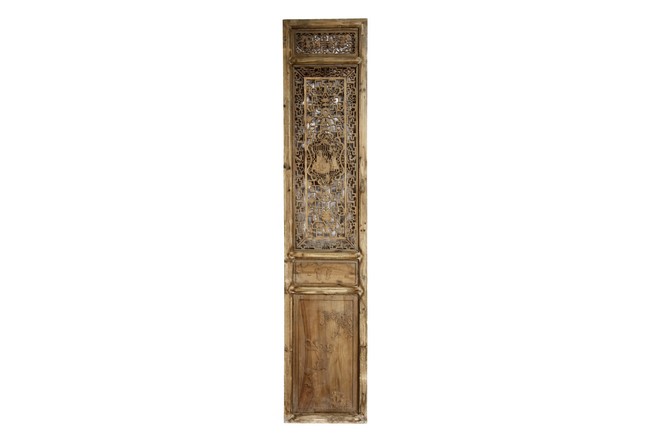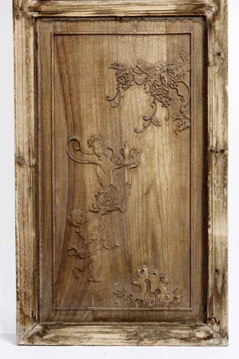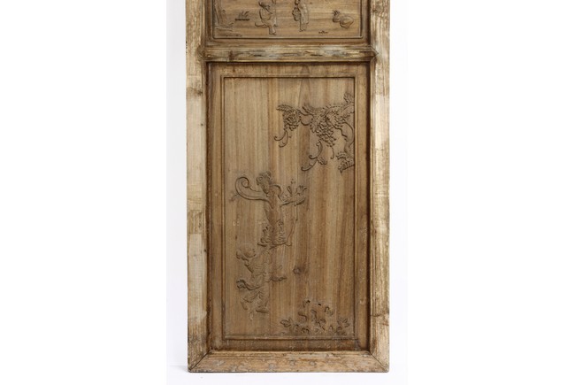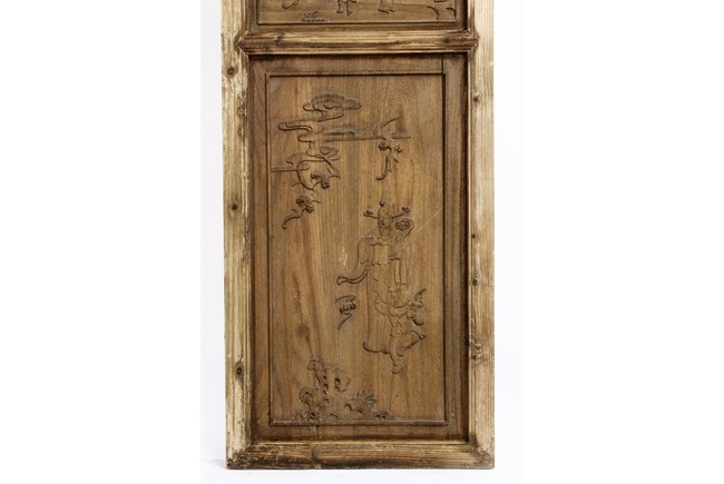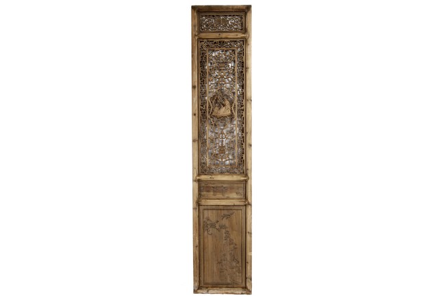 Each of rectangular form, the upper panel carved and pierced with intricate patterns and a stylized 'shou' character, the middle section elegantly pierced with figures flanked by auscpicious motifs and key-fret patterns. The lower section carved in relief with figures from stories.