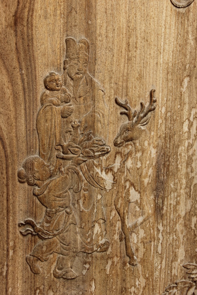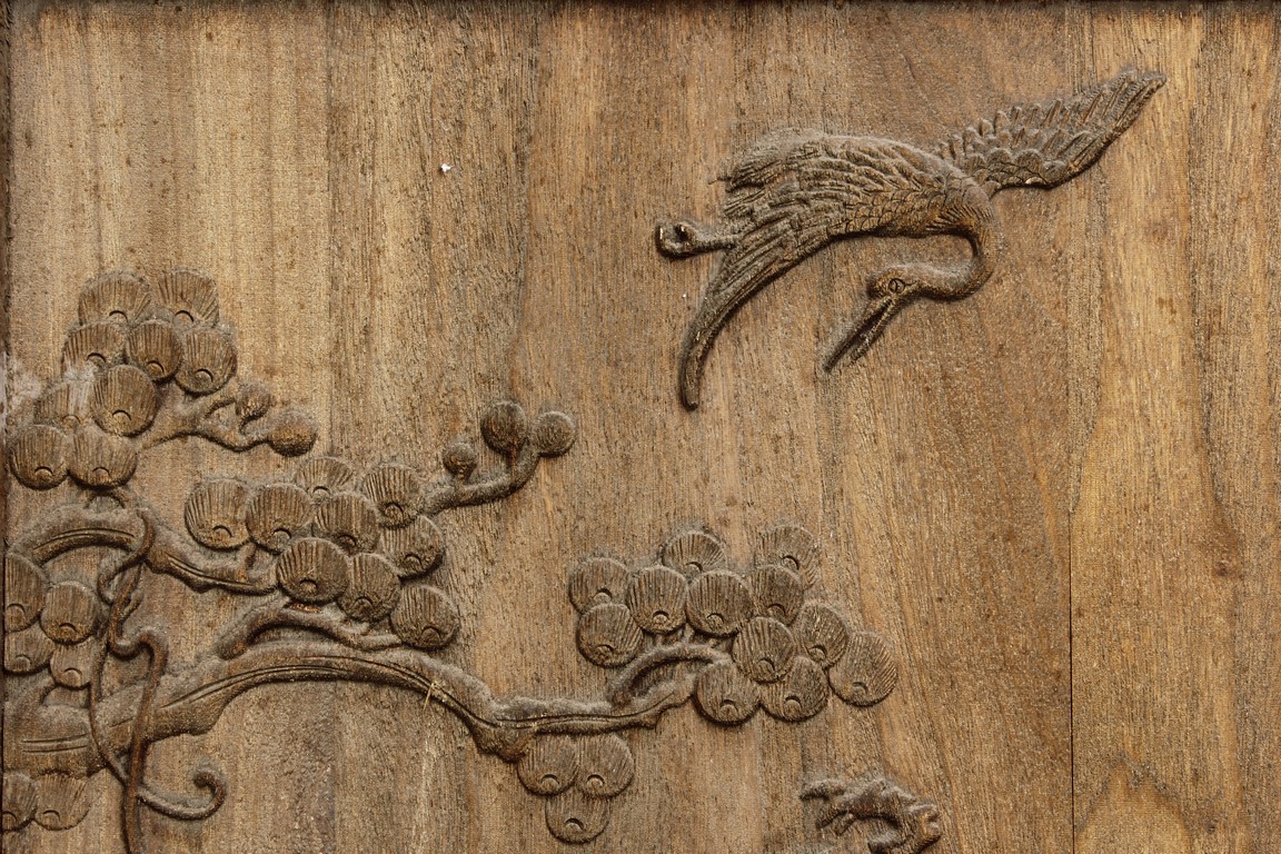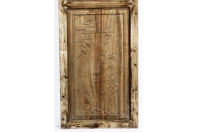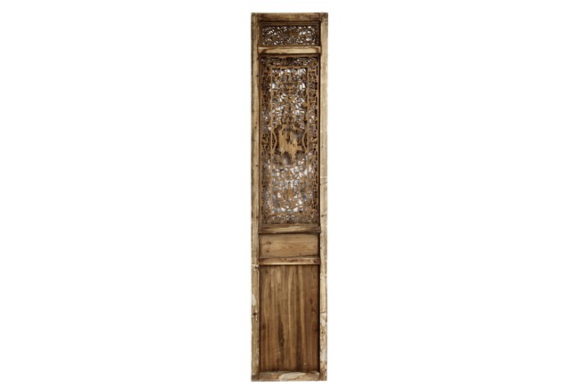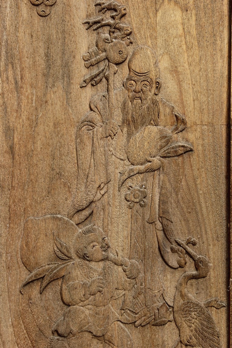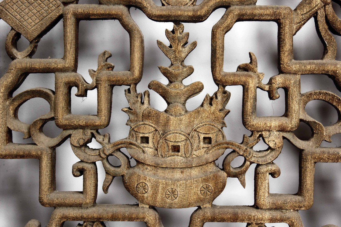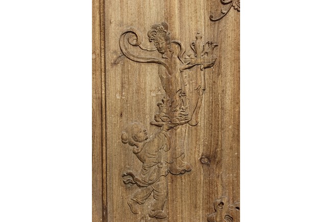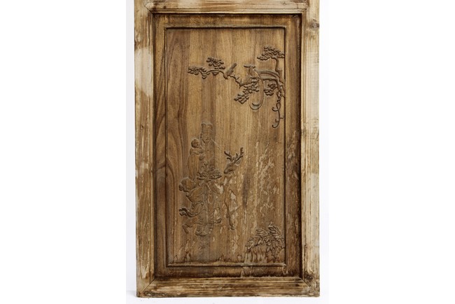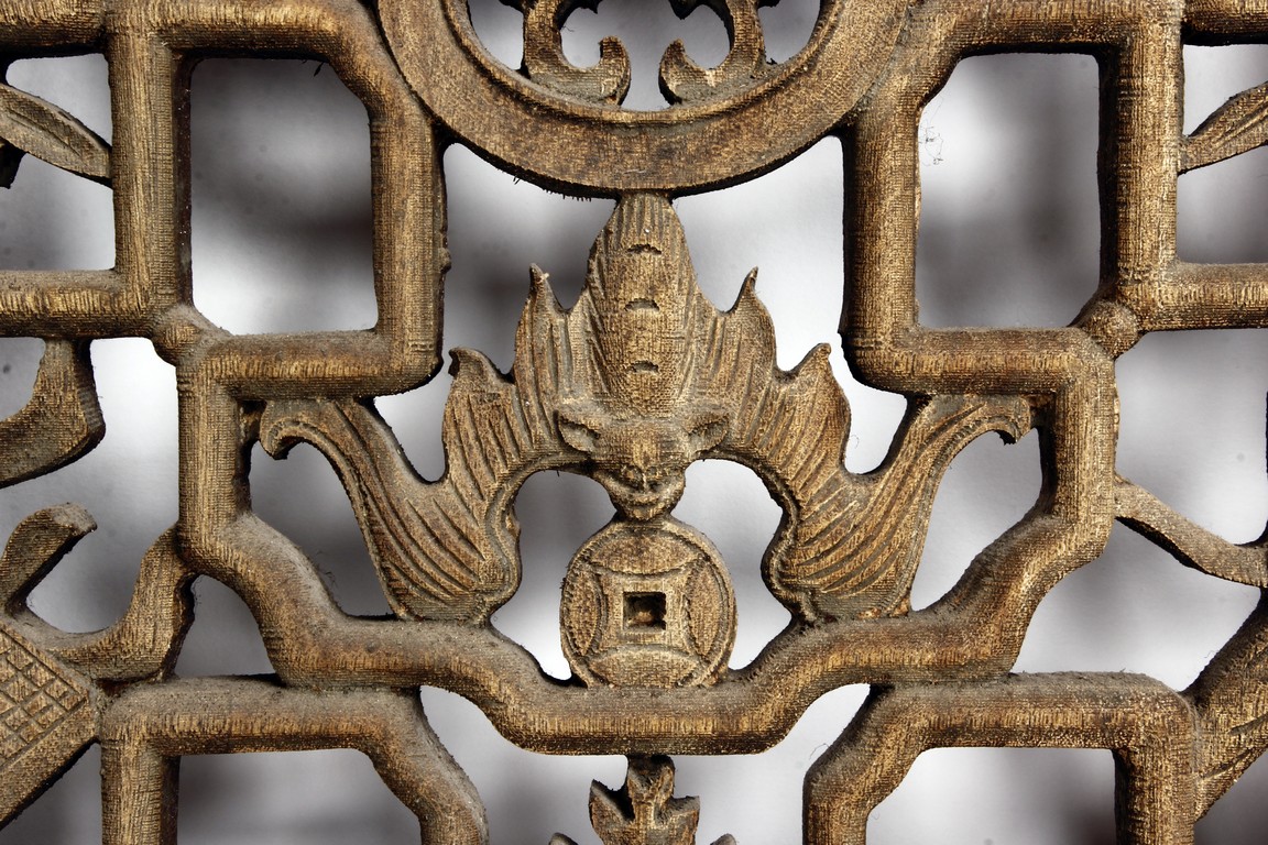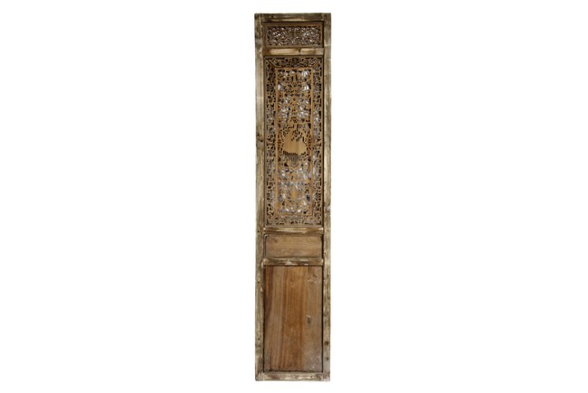 Each of rectangular form, the upper panel carved and pierced with intricate patterns and a stylized 'shou' character, the middle section elegantly pierced with figures flanked by auscpicious motifs and key-fret patterns. The lower section carved in relief with figures from stories.