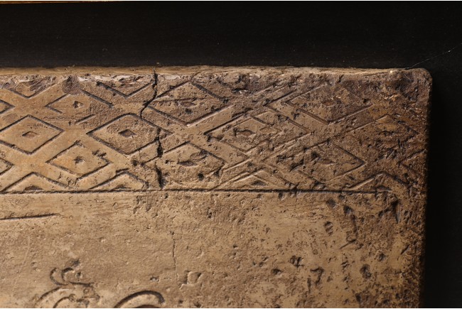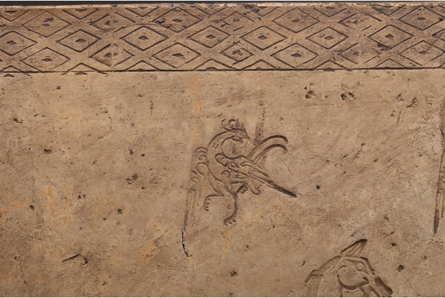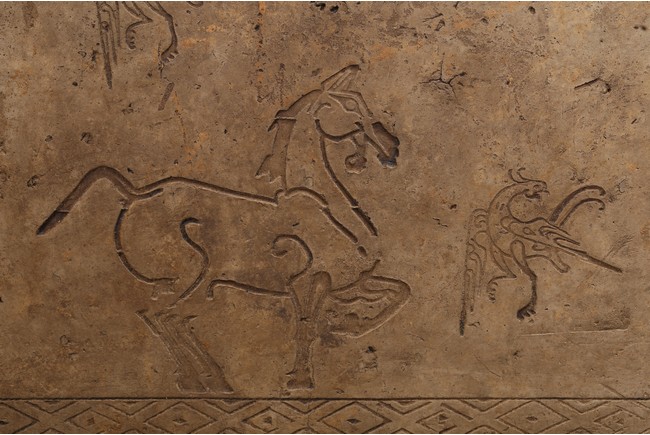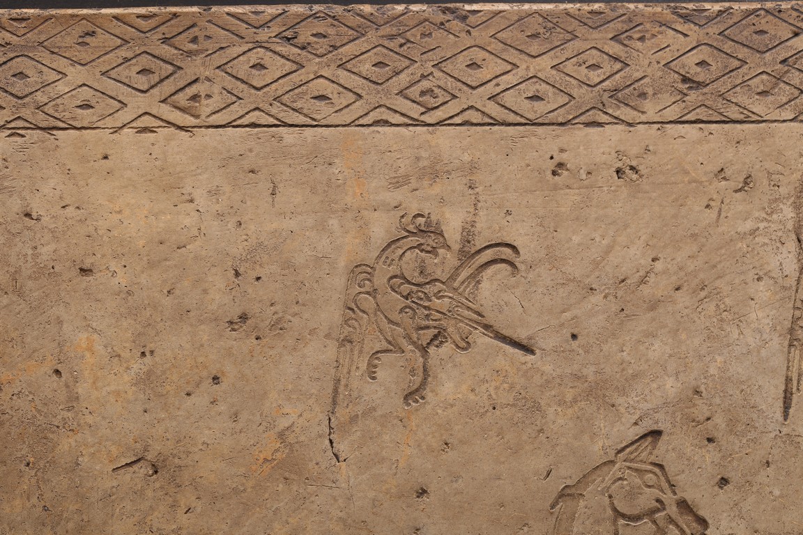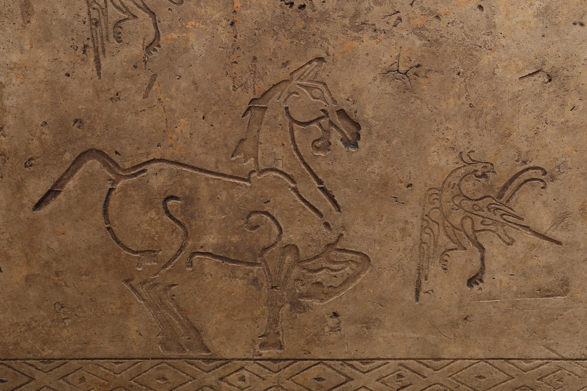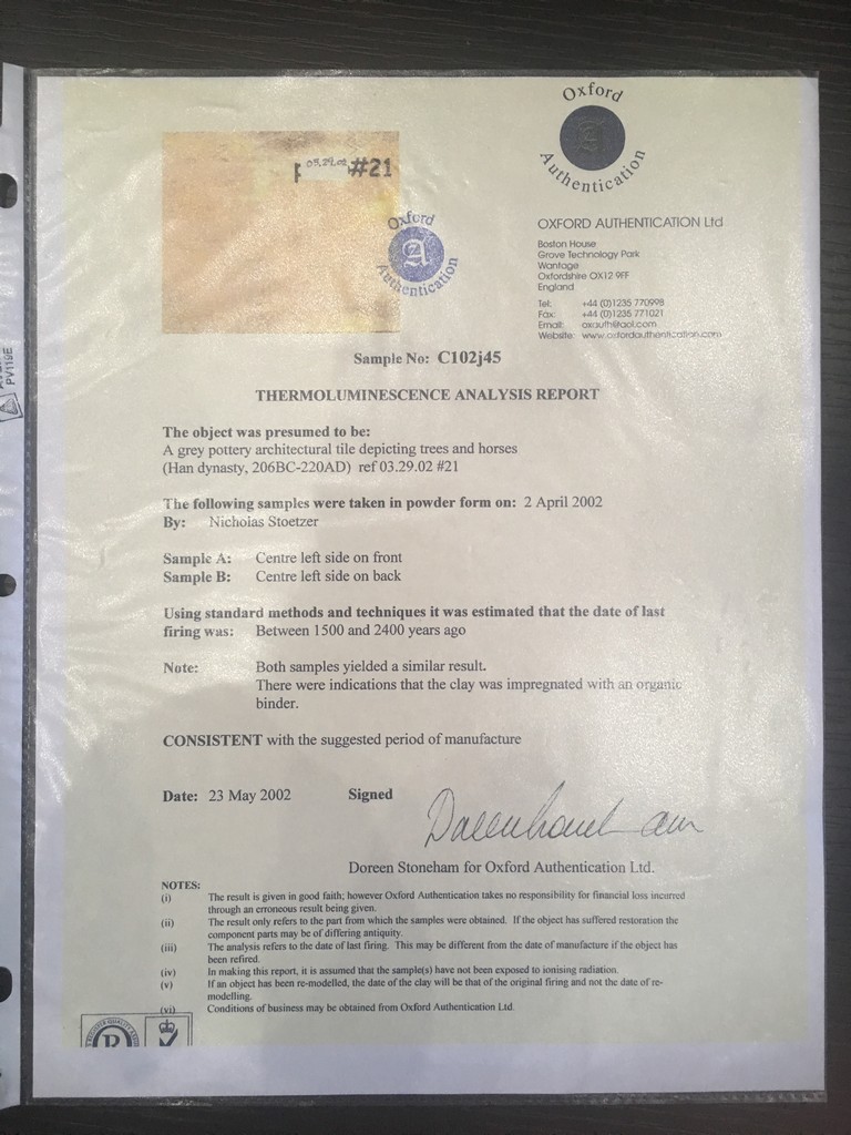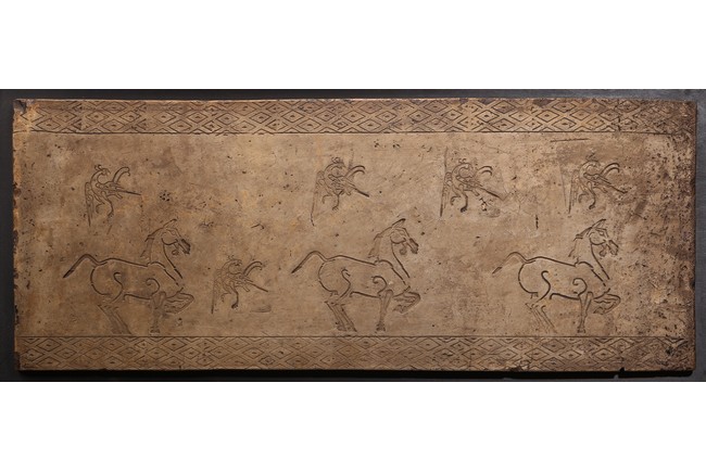 Characteristic of architectural tiles found on cave tomb walls in Sichuan Province, this tile depicts three lively prancing horses with five stylized phoenix overhead. A repeating diamond pattern forms the upper and lower border. he tile has been professionally mounted in a shadow box gold-leafed wood frame; the back is fitted with a French mount that holds the tile’s weight while hanging. Han Dynasty period.