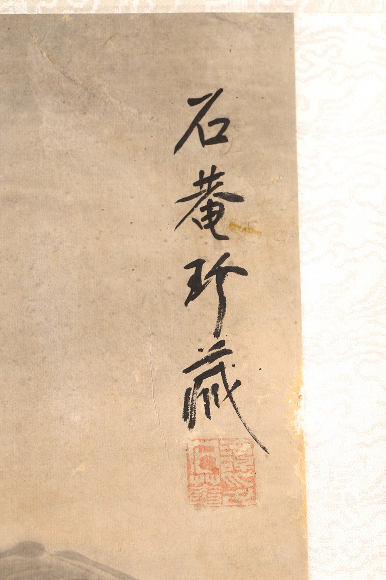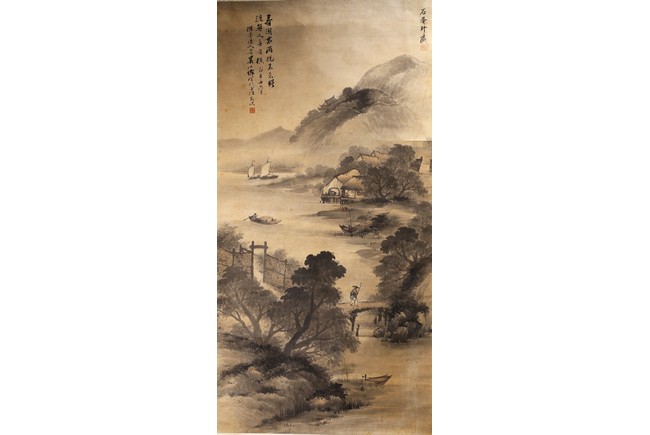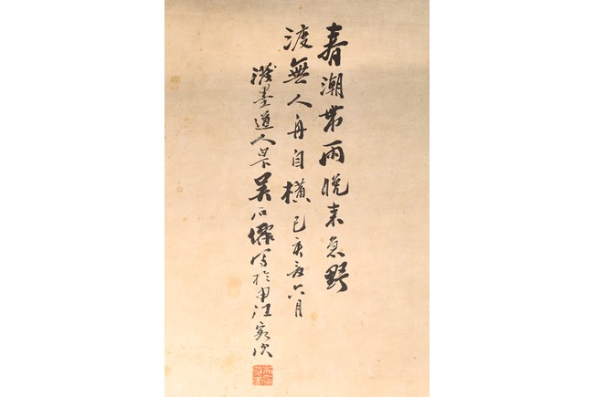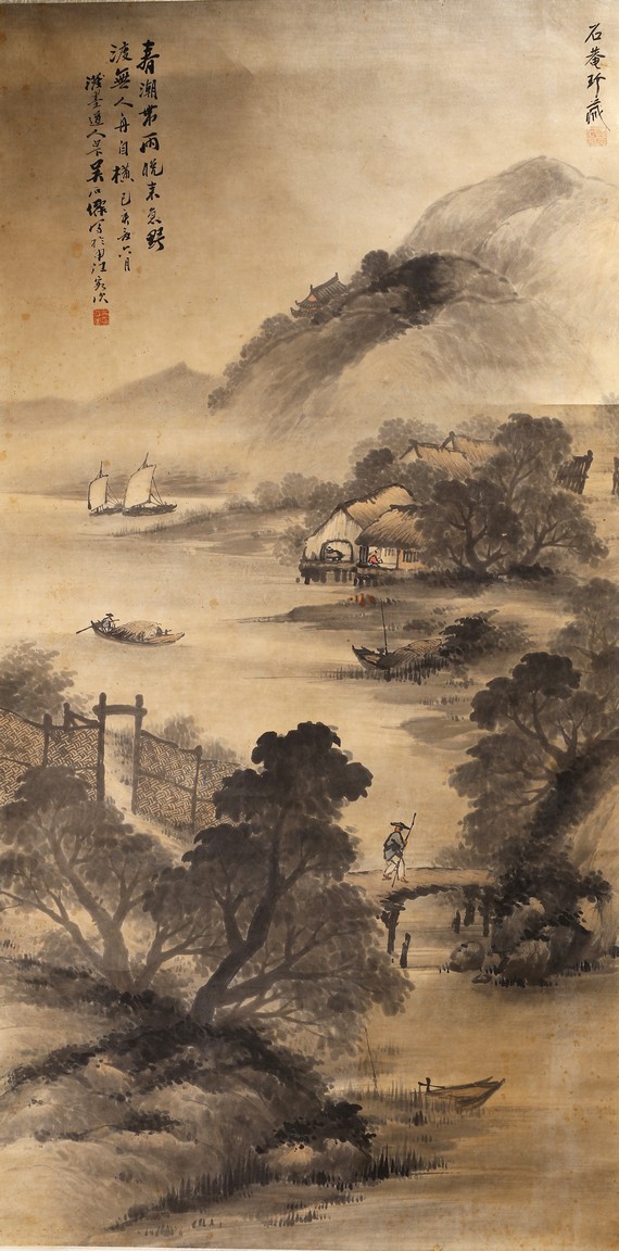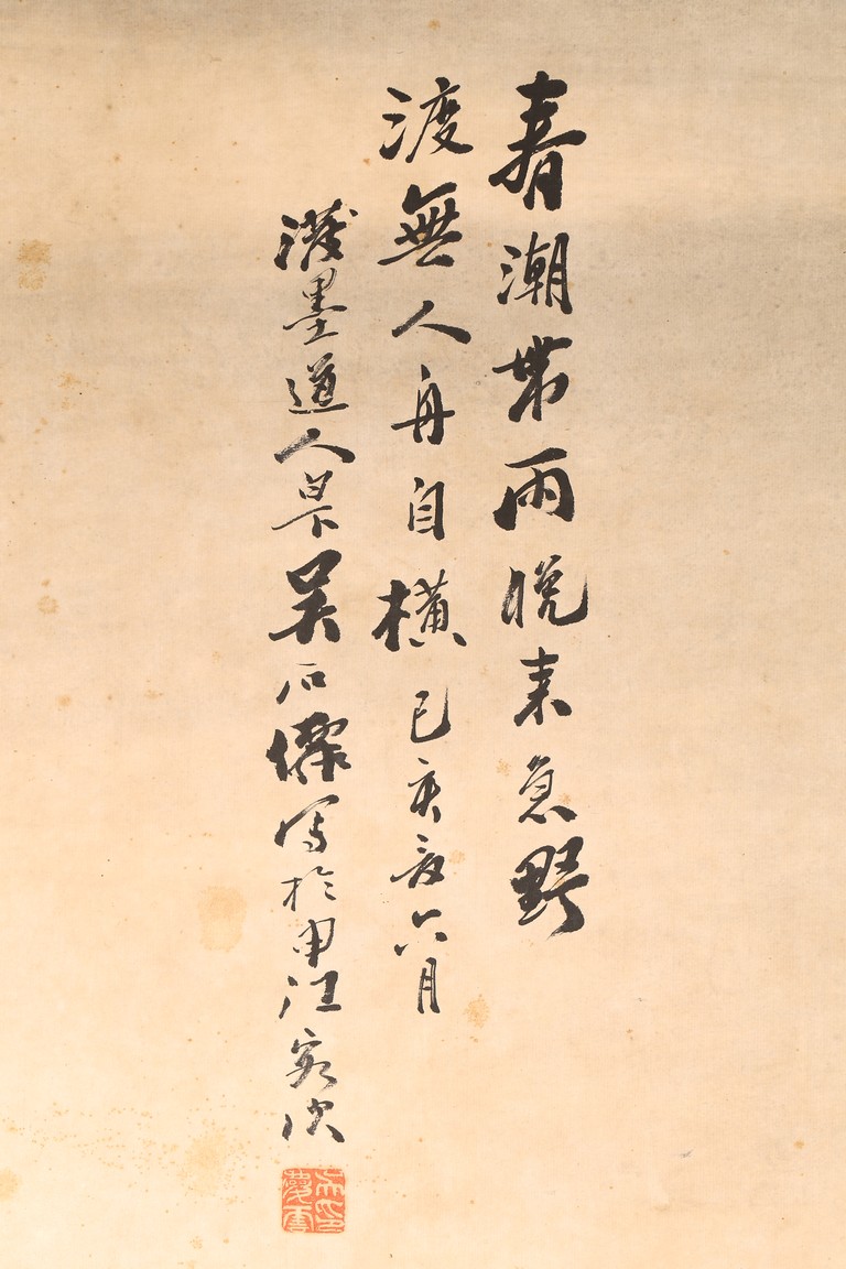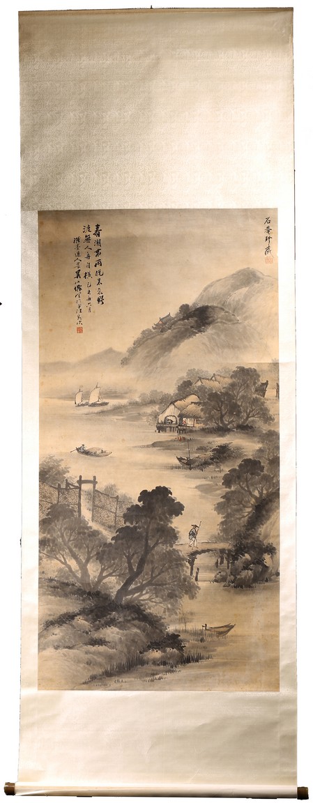 Color and ink on paper. Fisherman and landscape. Hanging scroll. Inscribed and signed Pomo Daoren, with one seal of the artist and collector.
