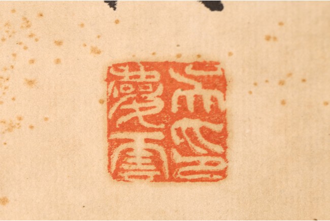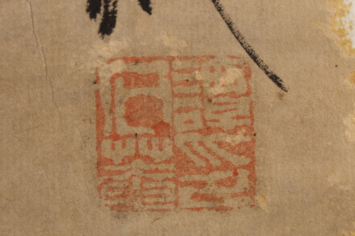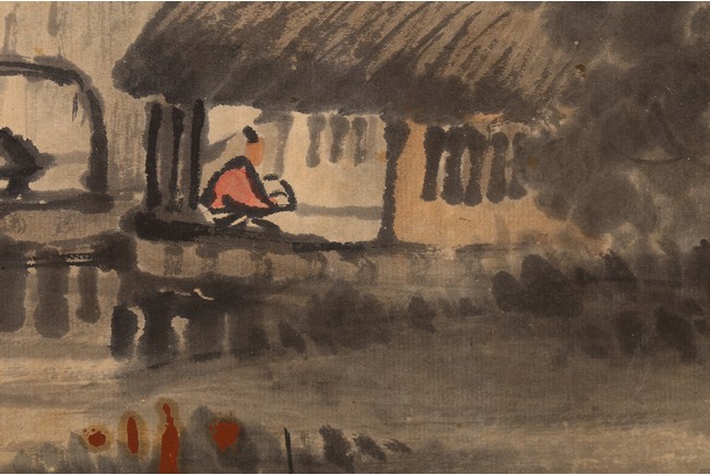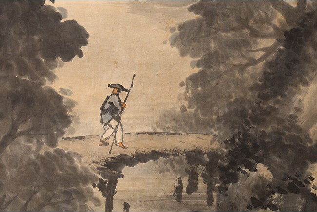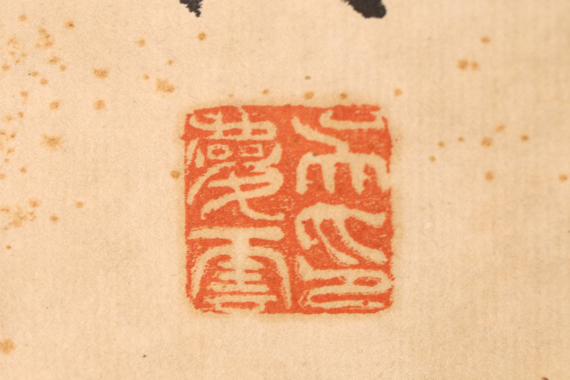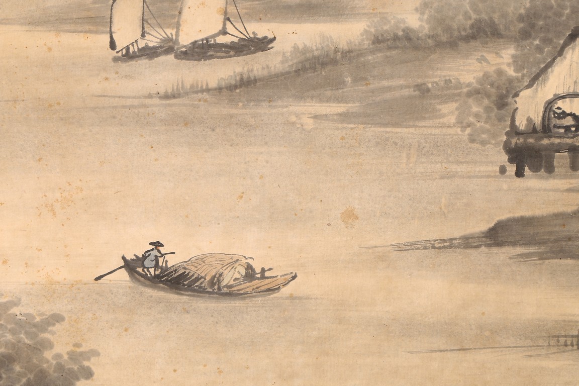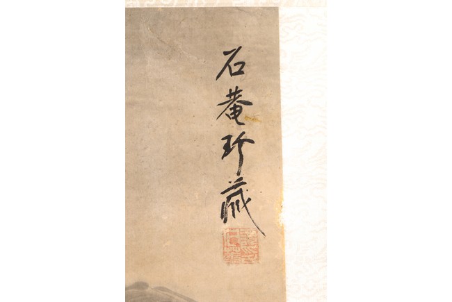 Color and ink on paper. Fisherman and landscape. Hanging scroll. Inscribed and signed Pomo Daoren, with one seal of the artist and collector.