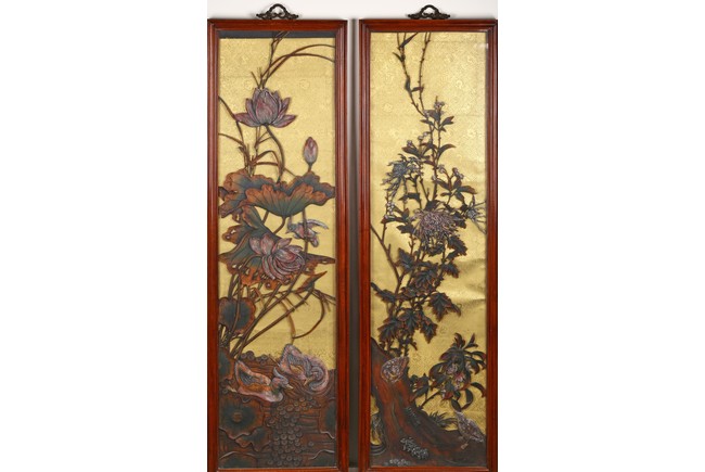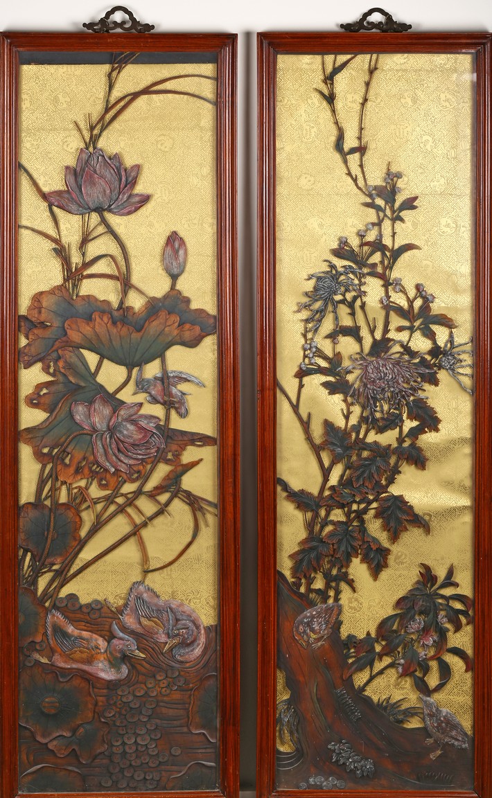 Each panel finely inlaid with hardwood depicting two ducks swimming in a pond under large lotus; the other panel depicting two quails perching on a large tree branch underneath a chrysanthemum flowers. Qing Dynasty period.