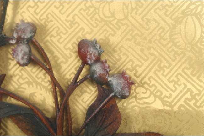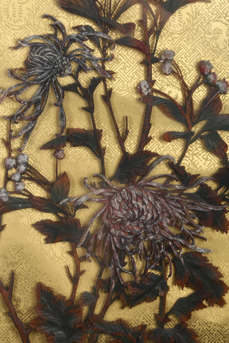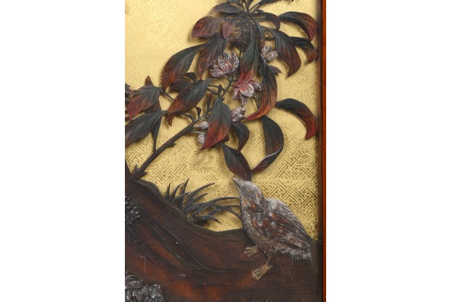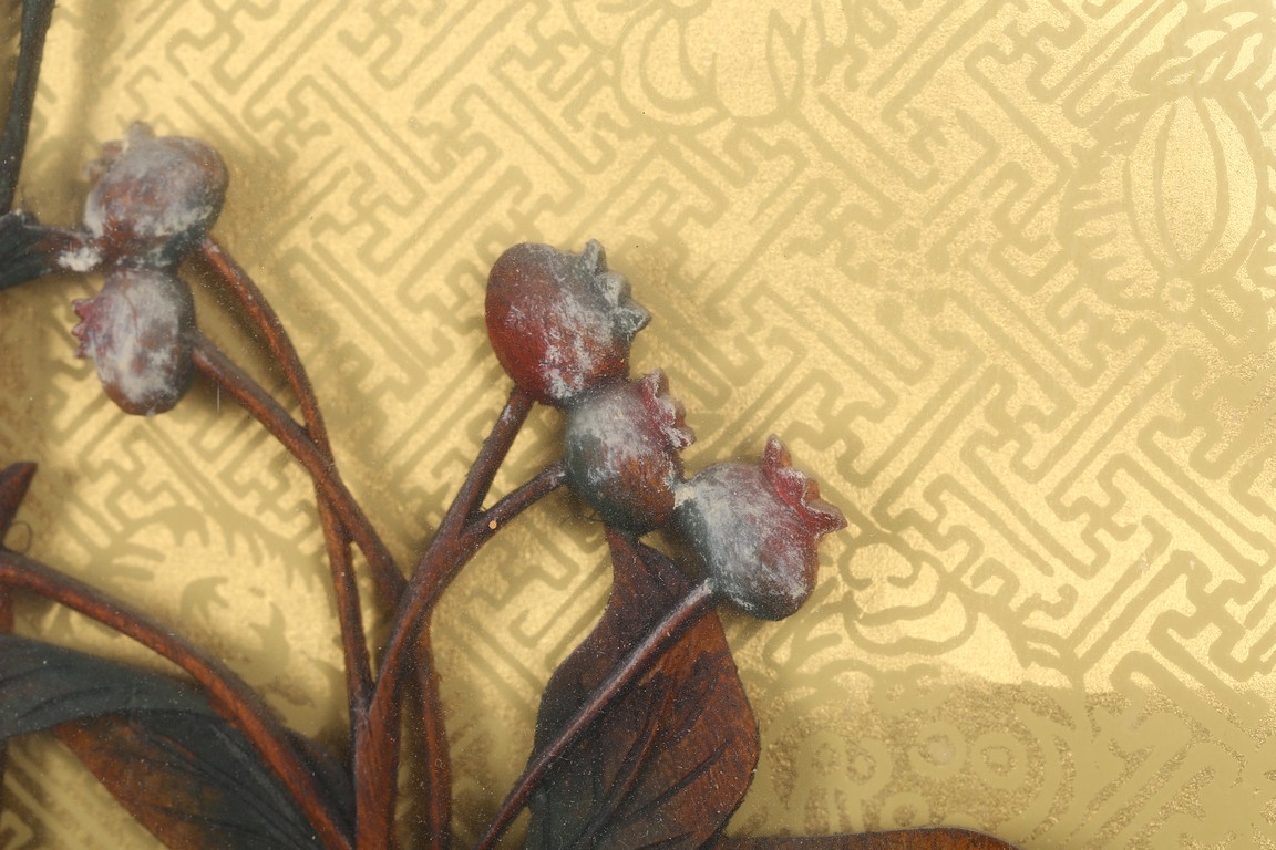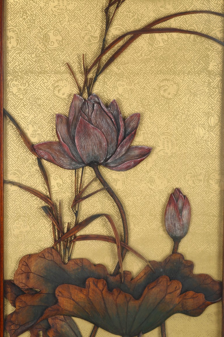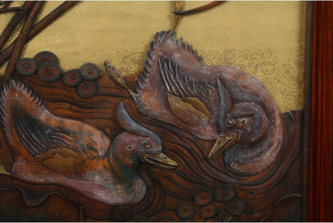 本拍品鏡框內所雕荷花,菊花,靈鳥,鴛鴦等均為上等黃楊木雕制而成。所雕菊荷鳥鴛鴦栩栩如生,活波可愛充滿生機。此工藝雕刻在明清時期盛行,從民國時期到現在已逐漸失傳.