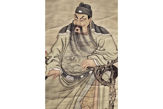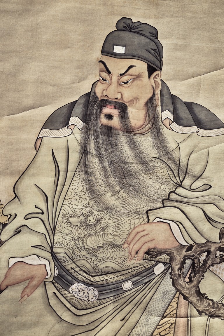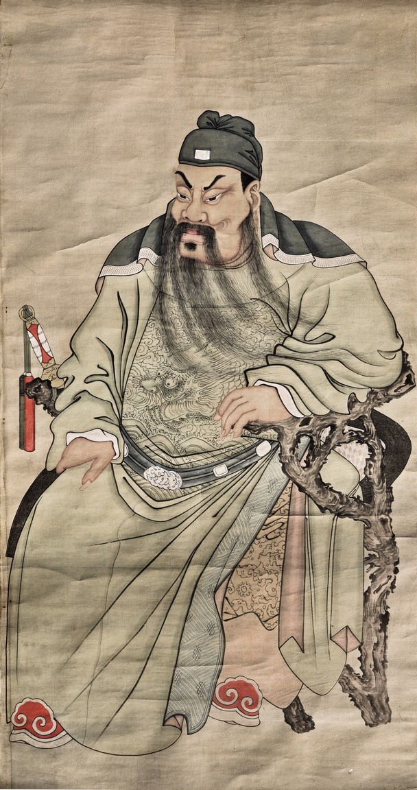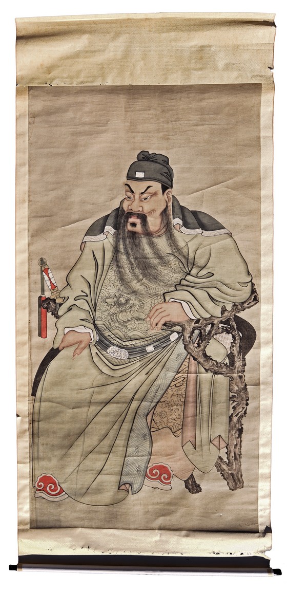 Ink and color on paper. Hanging scroll. With depiction of Guan Yu seated on wood chair, with long beard and stern expression.