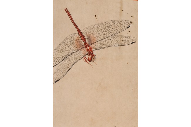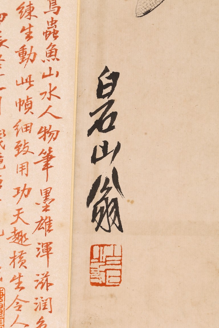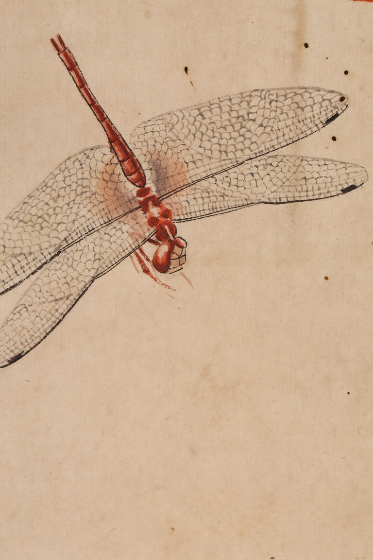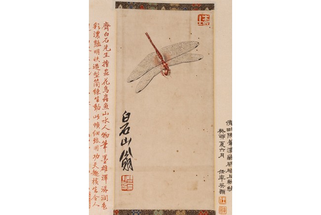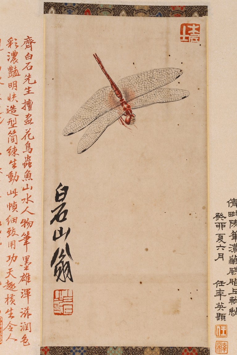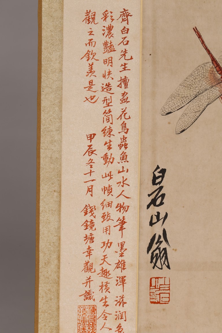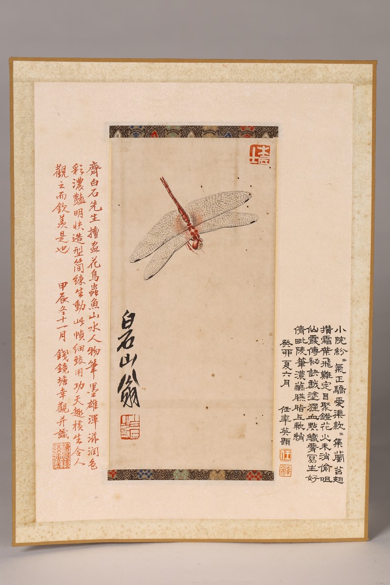 Chinese School. Dragonfly. Mounted on paper. Signed Baishi Shanweng, with two seal marks of the artist, and two colophons with seal marks.