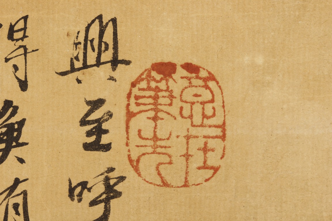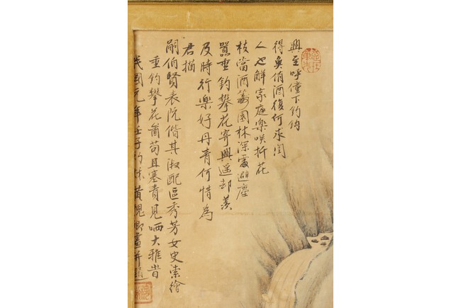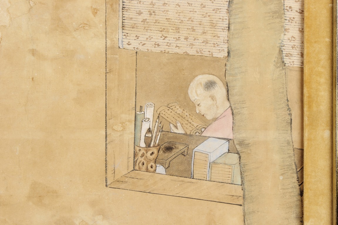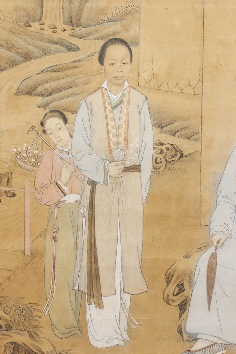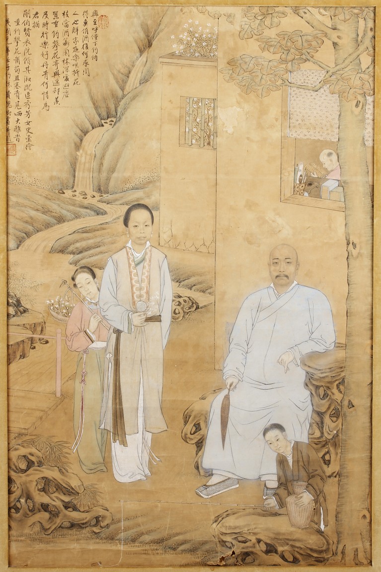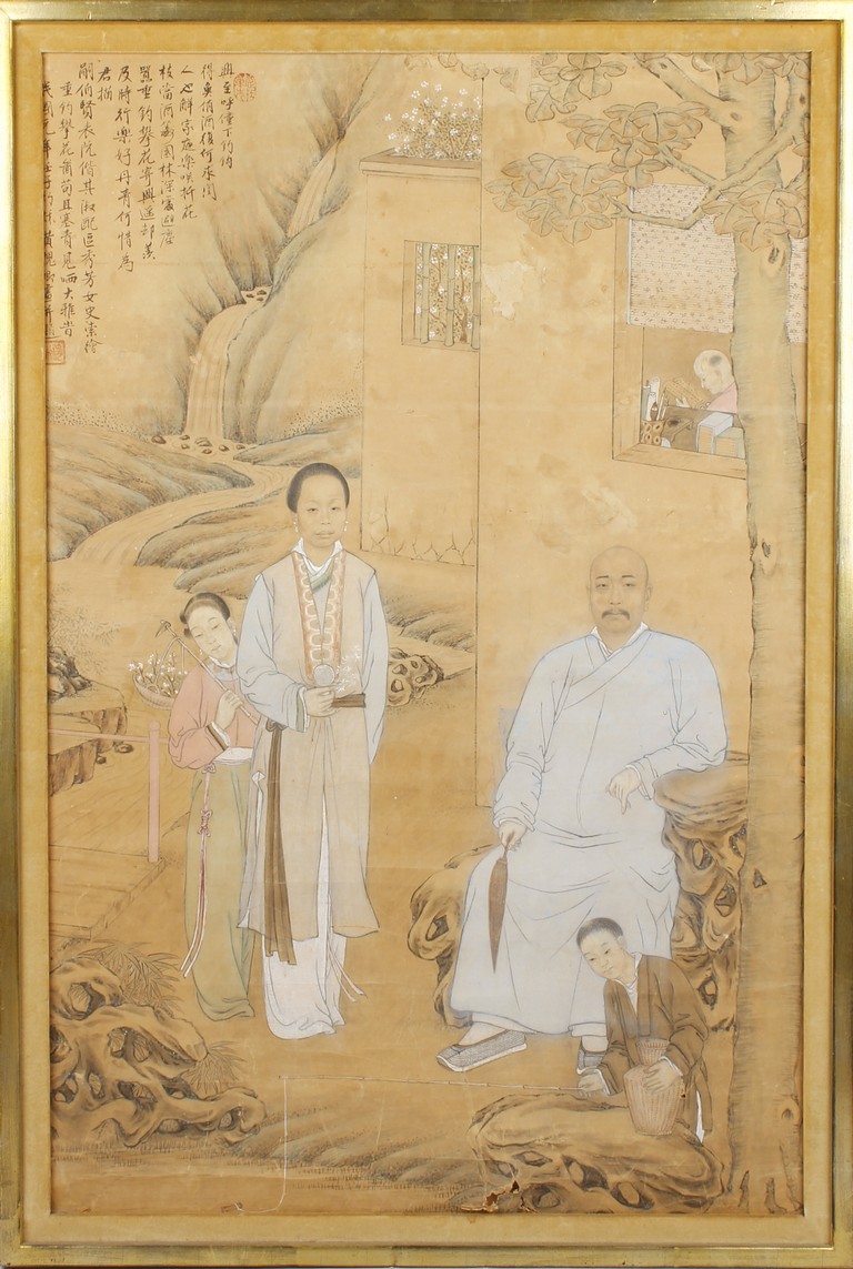 Ink and color on paper. Portrait of a family. Framed. Inscribed and signed Huang Huaiqing with two seal marks.
