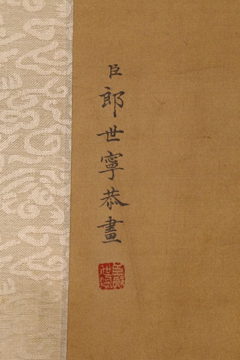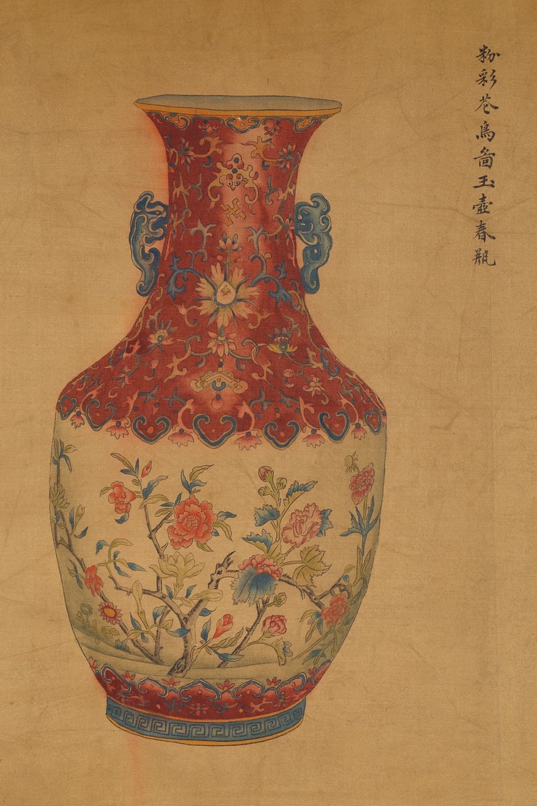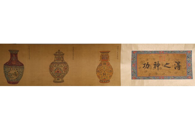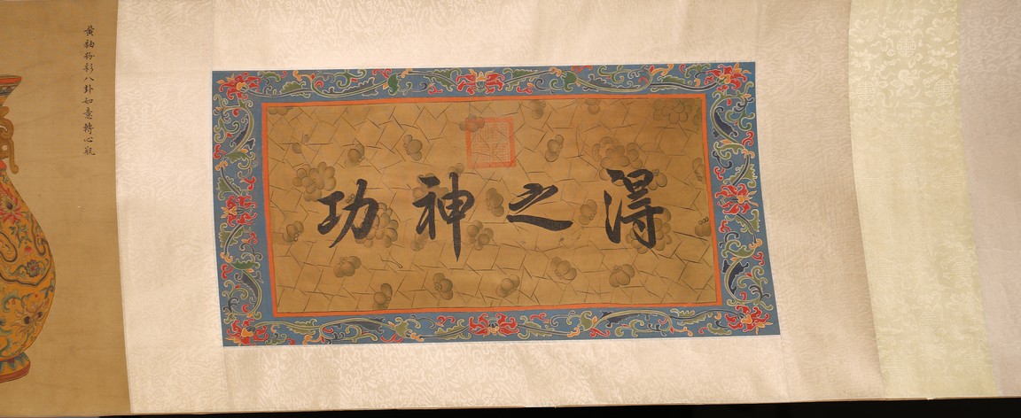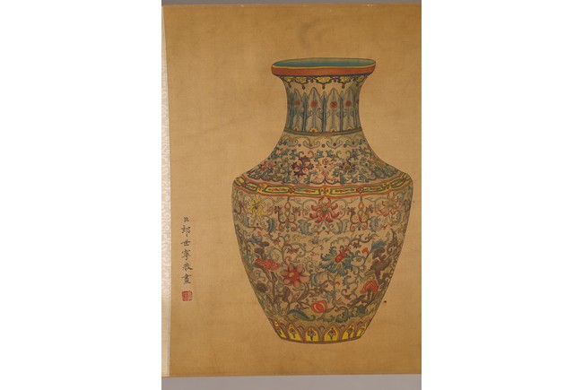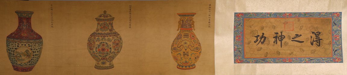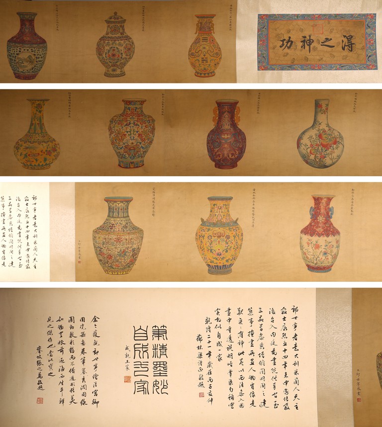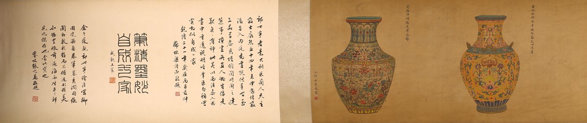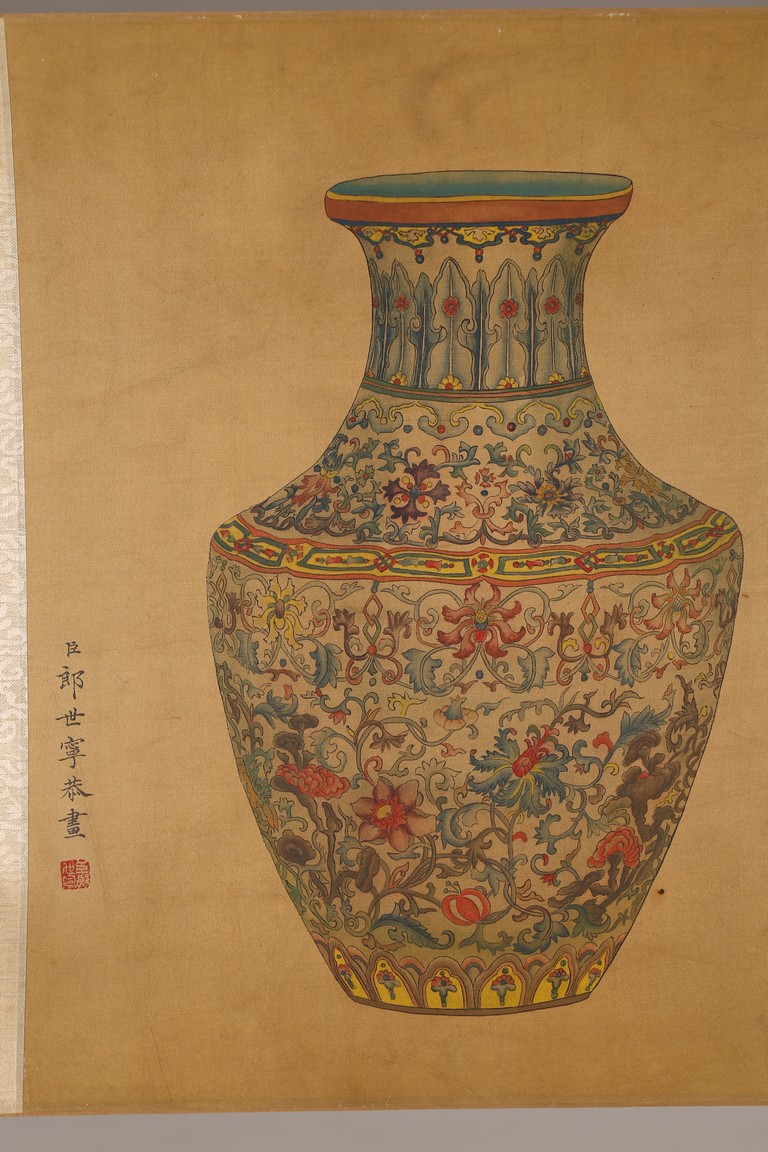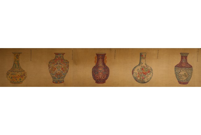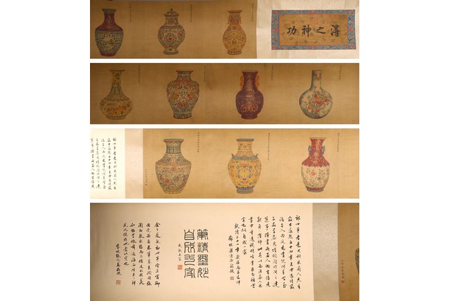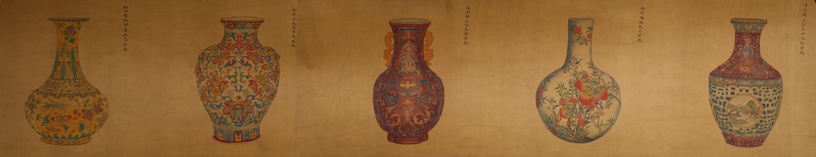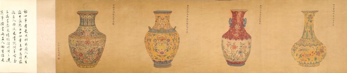 Color and ink on silk. Imperial Porcelains. Handscroll. Signed Lang Shining and with one seal mark, with multiple colophons at the end. Attributed to Lang Shining.
