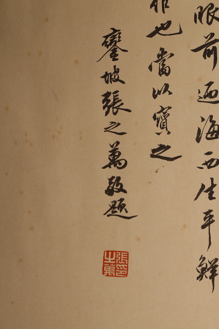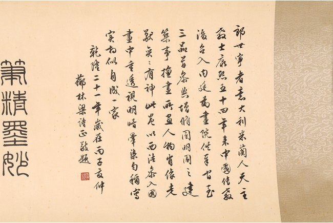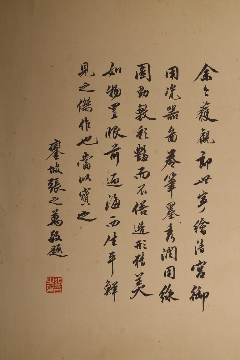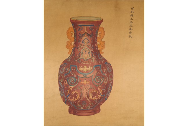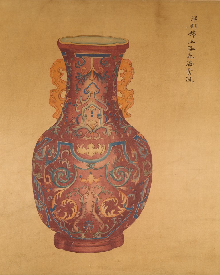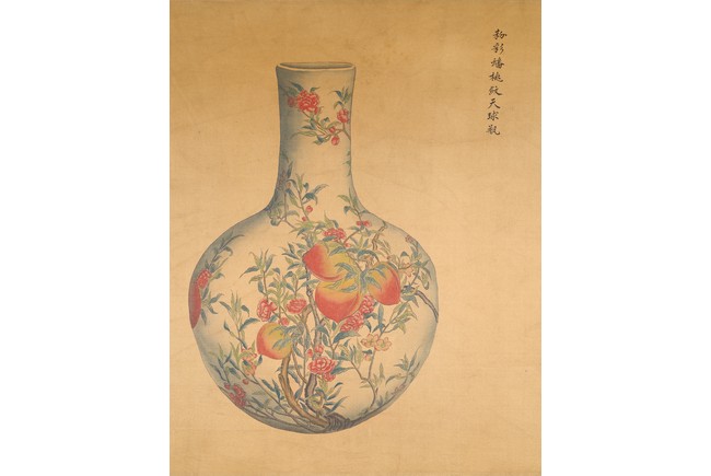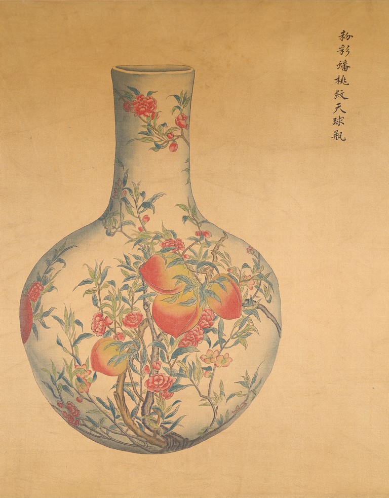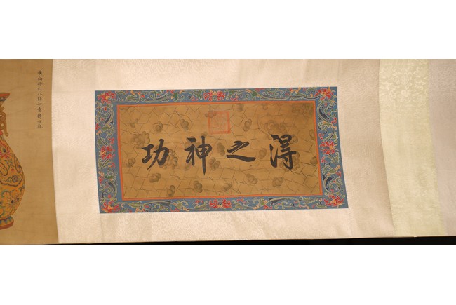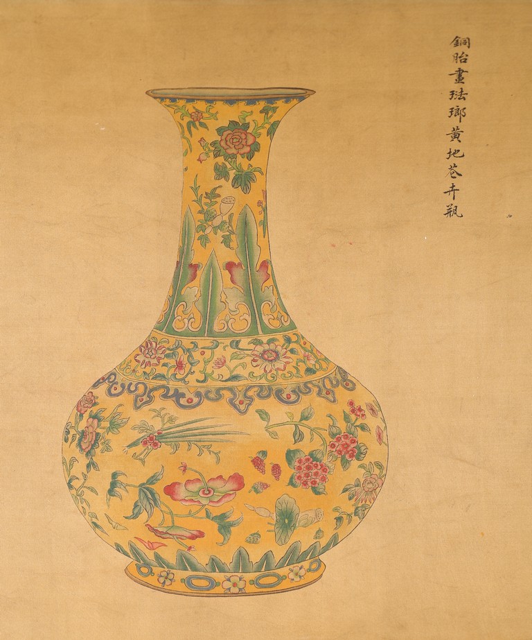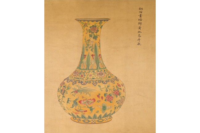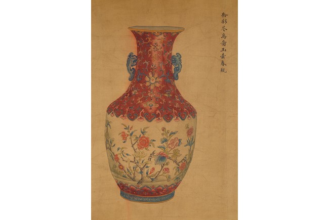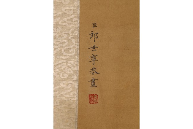 Color and ink on silk. Imperial Porcelains. Handscroll. Signed Lang Shining and with one seal mark, with multiple colophons at the end. Attributed to Lang Shining.