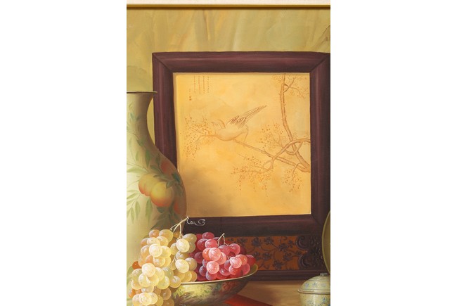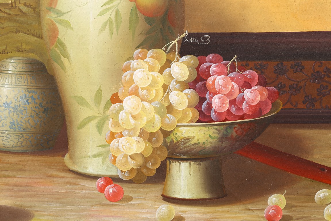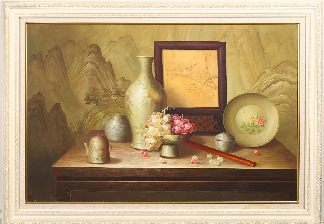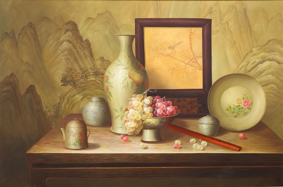 Chinese. Still life with Chinese Porcelains. Oil on canvas. Framed.