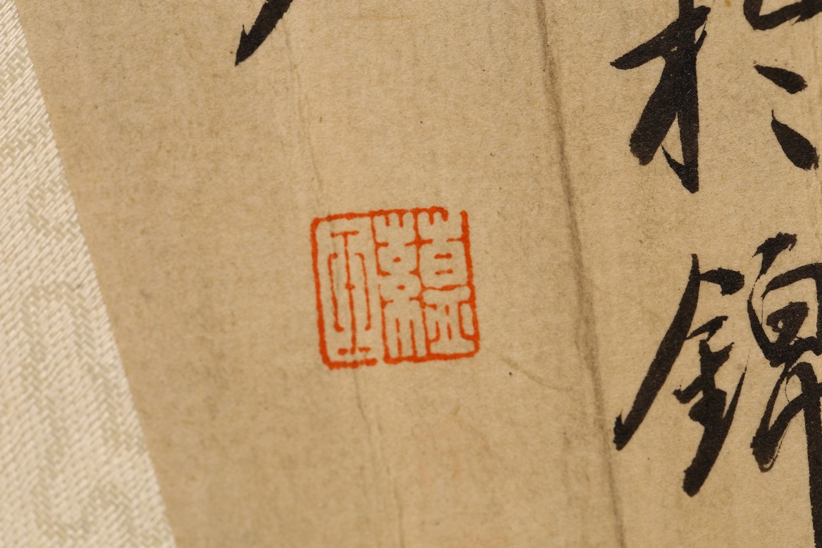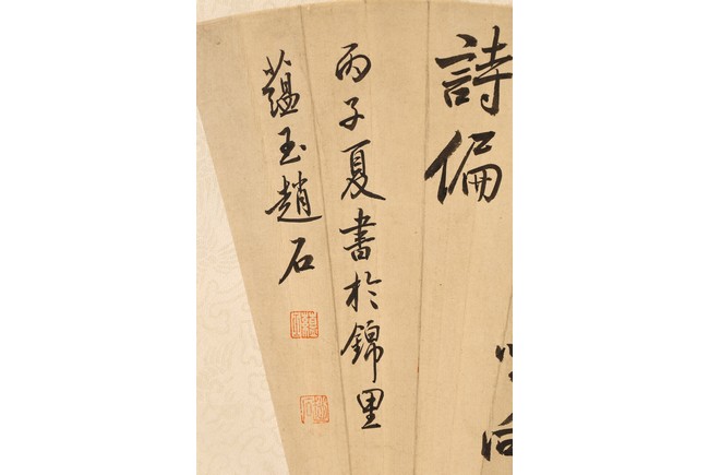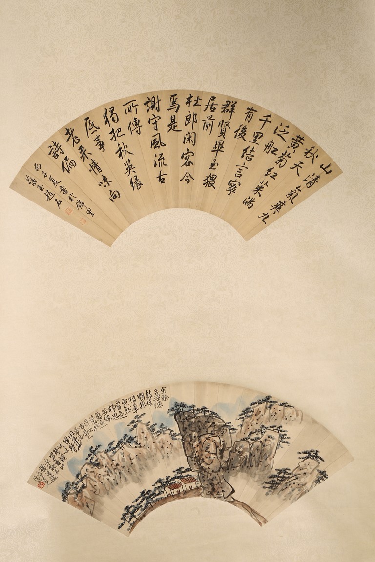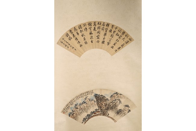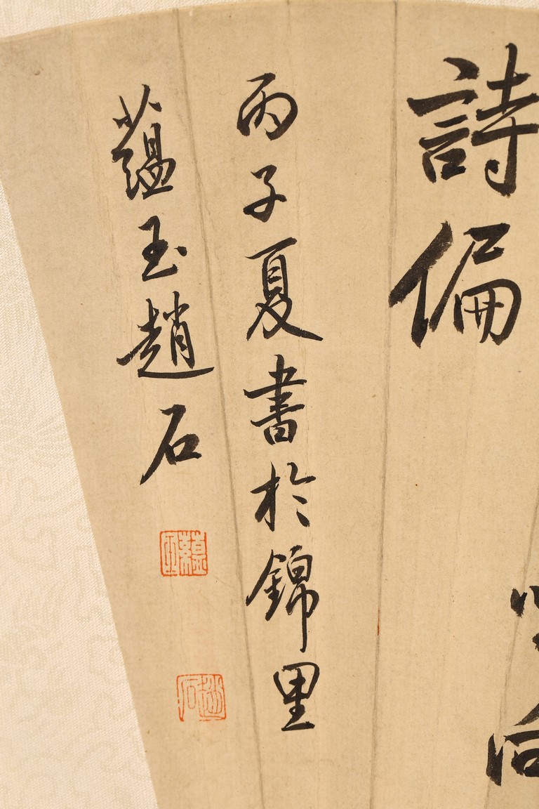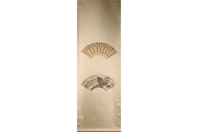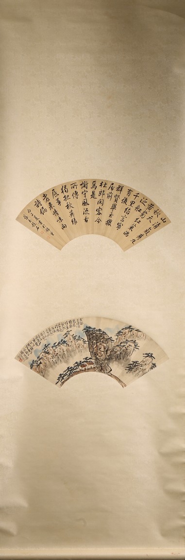 Chinese School. Hanging scroll. Fan painting and calligraphy. Running calligraphy signed Yun Yu Zhao Shi by Zhao Yunyu with two seals of the artist. Landscape painting inscribed and signed Shi Hu by Chen Zizhung, with one seal of the artist.