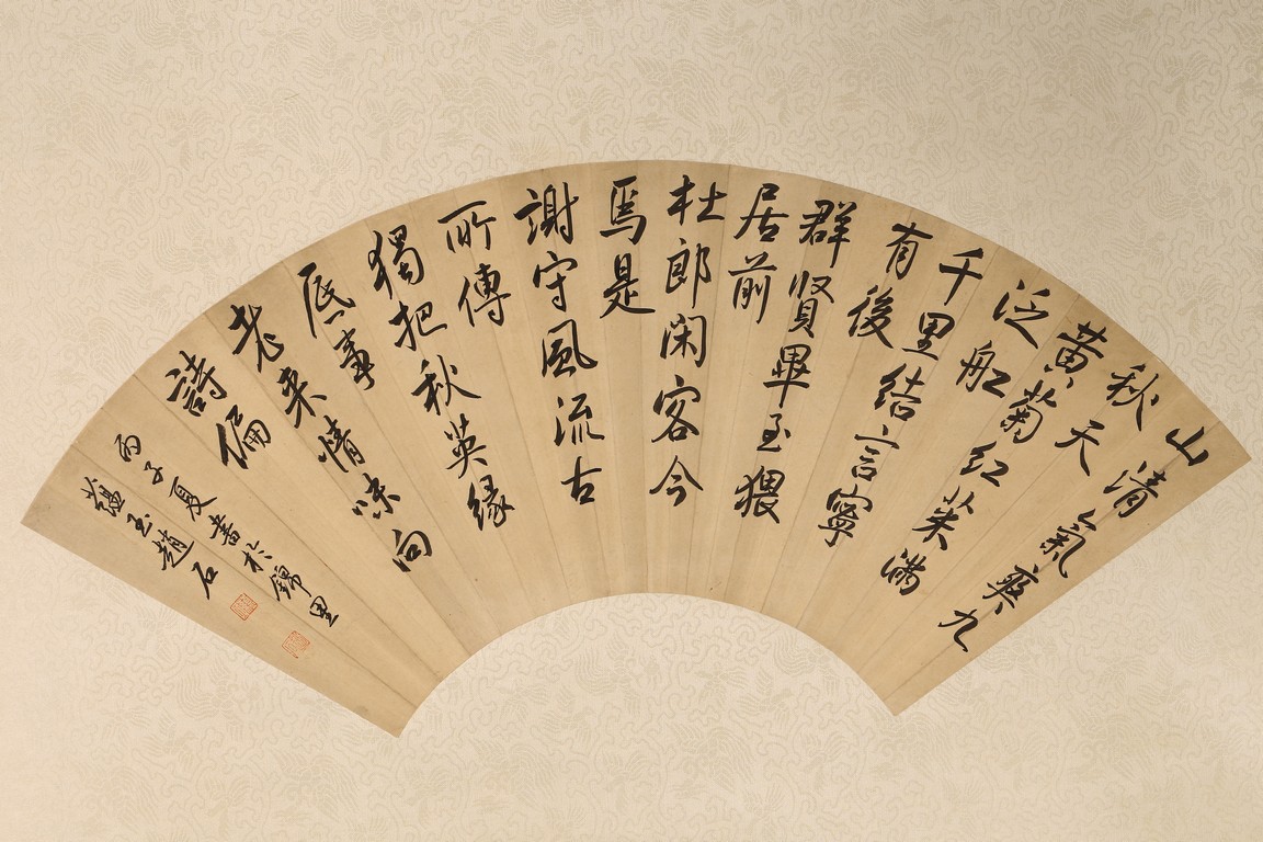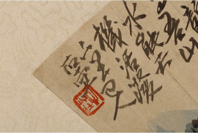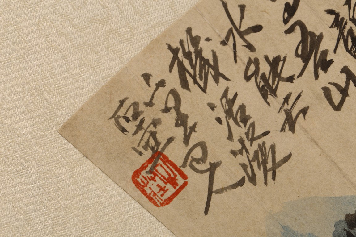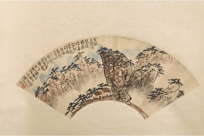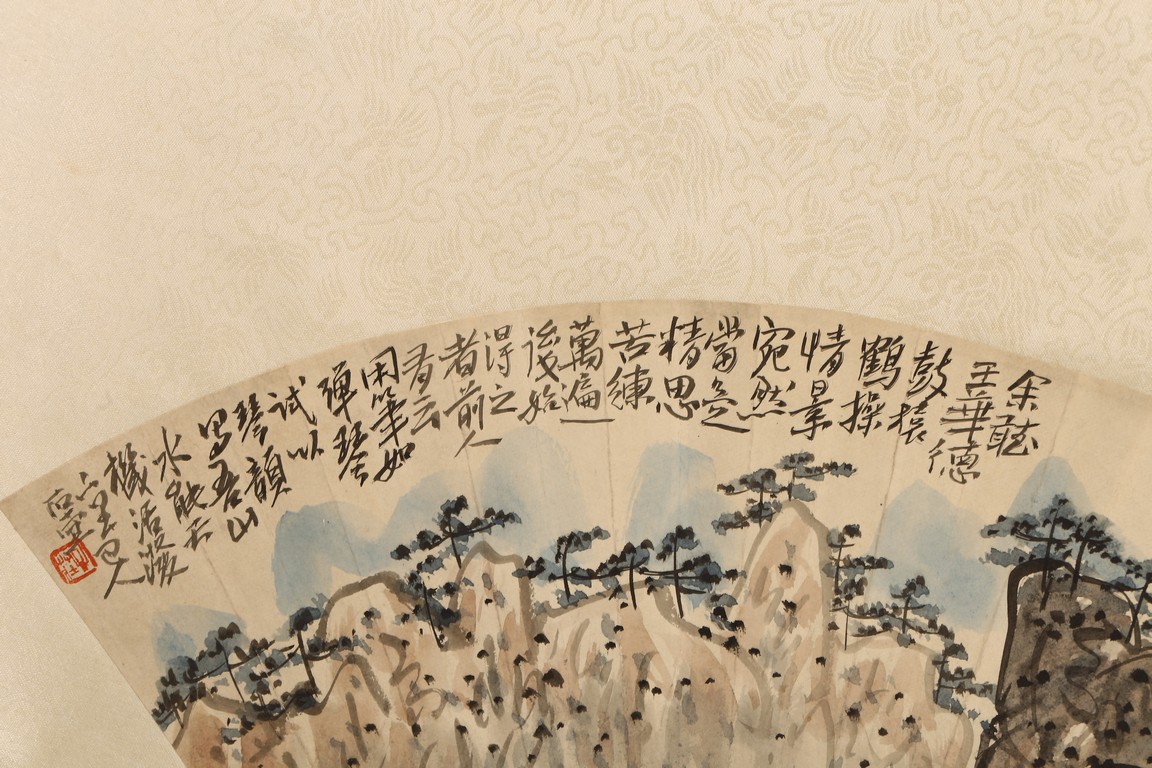 Chinese School. Hanging scroll. Fan painting and calligraphy. Running calligraphy signed Yun Yu Zhao Shi by Zhao Yunyu with two seals of the artist. Landscape painting inscribed and signed Shi Hu by Chen Zizhung, with one seal of the artist.