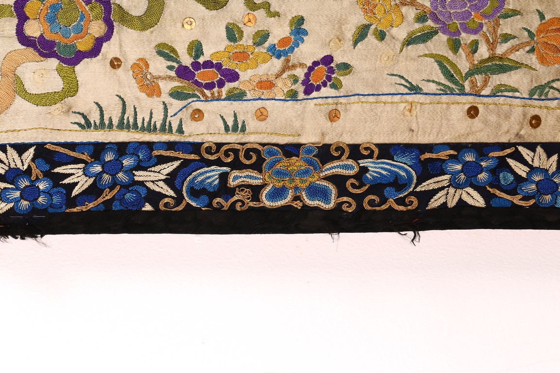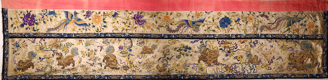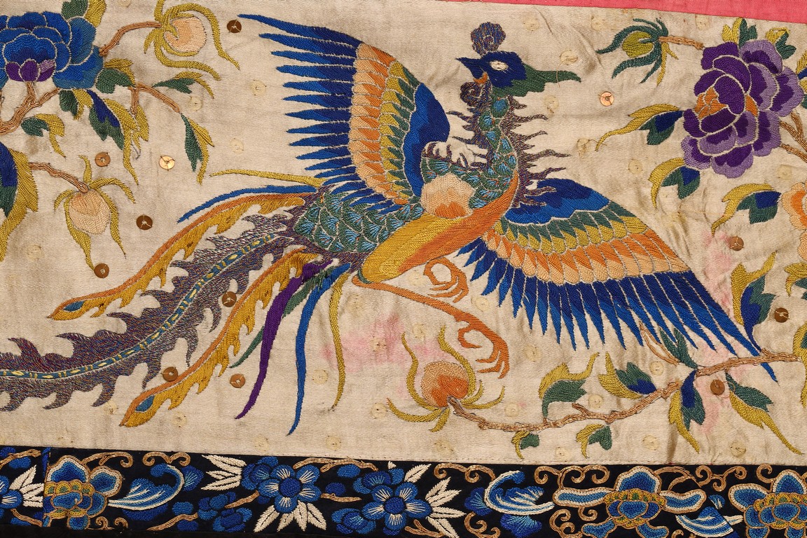 Late Qing Dynasty period.Finely embroidered in silk and copper threads with buddhist lions and phoenix amongst leafy floral sprays, butterflies, and auspicious motif.